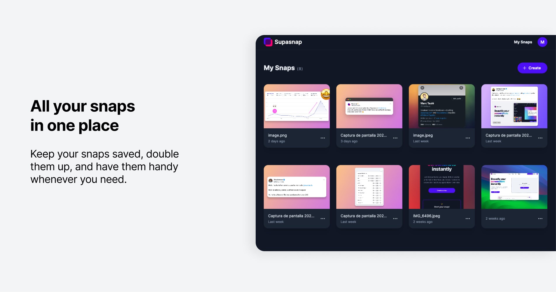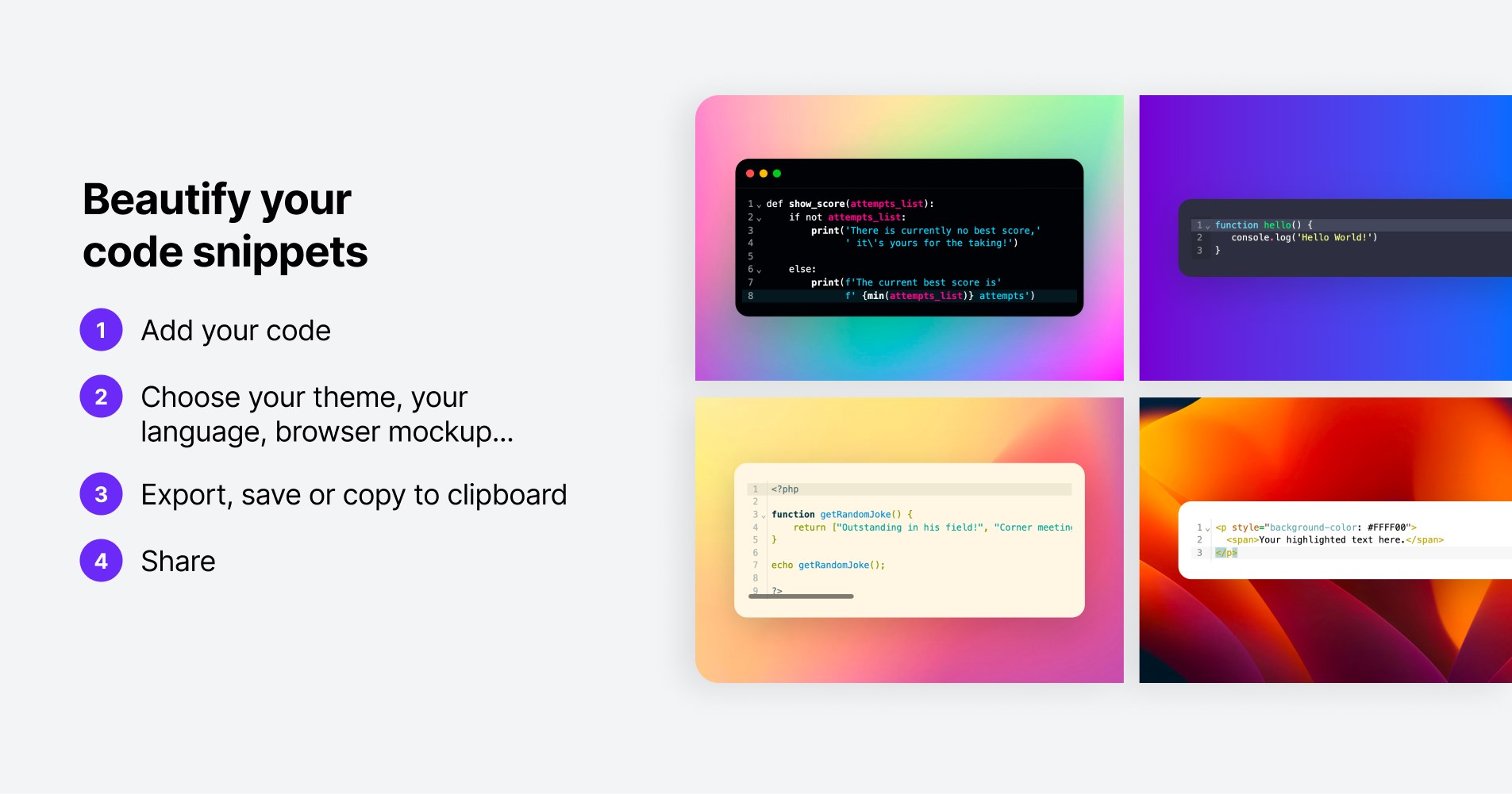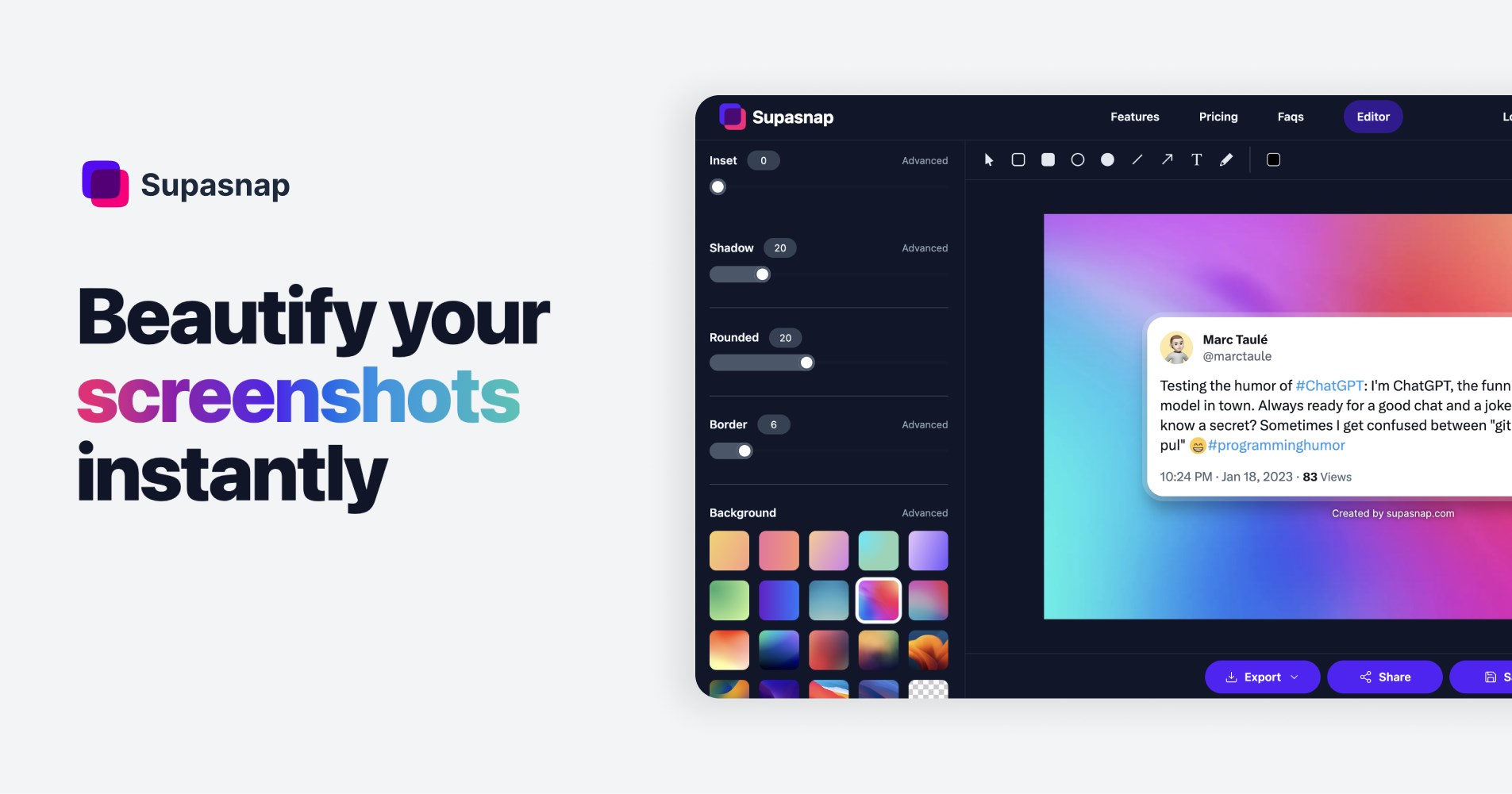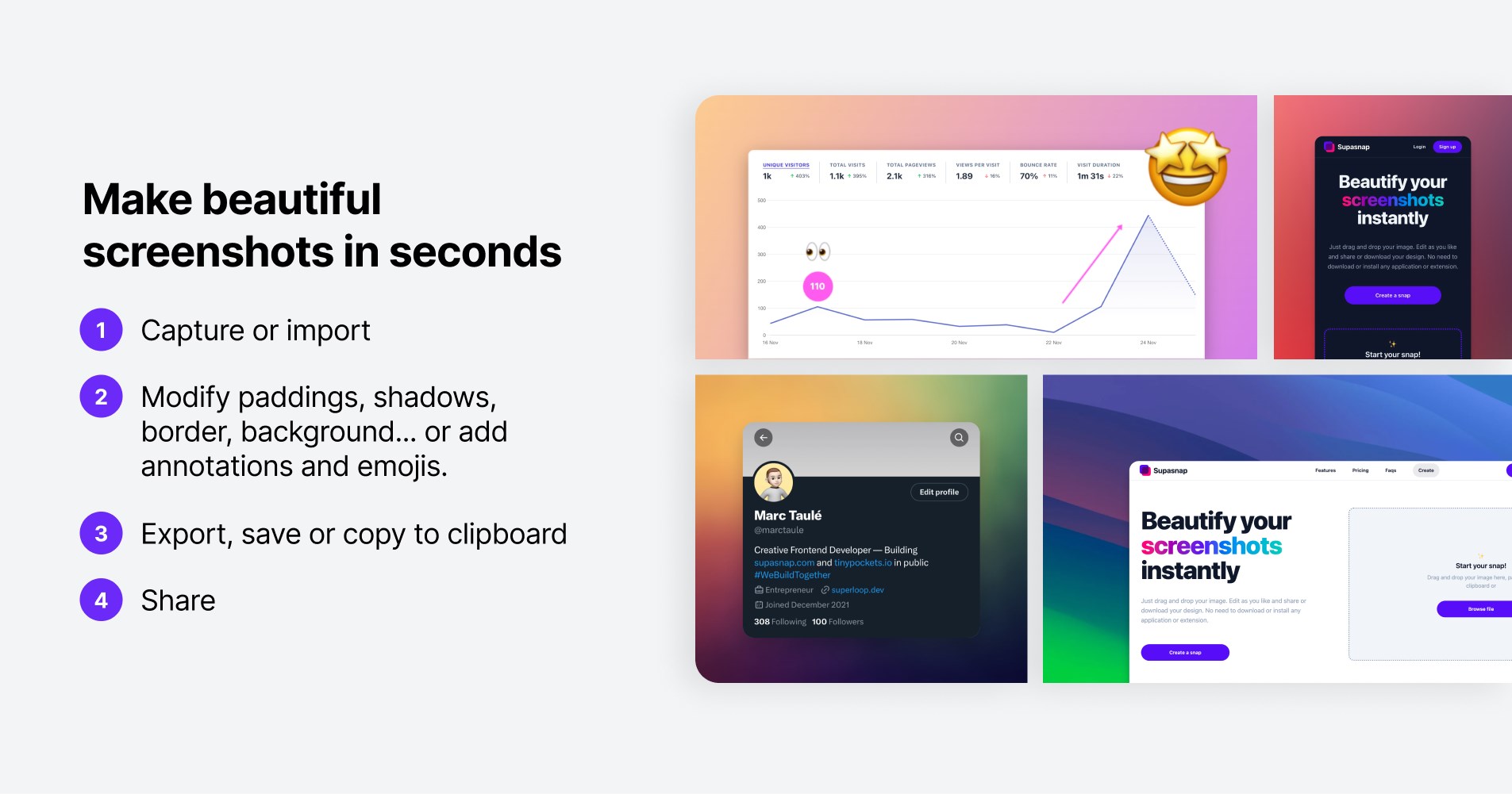 Capture, Upload or Paste an screenshot or code snippetPosition: Tailor the position of your captureMargins and Spaces: Fine-tune the margins and spacesShadow: Add a shadow and personalize its color, blur, offset x and yBackground: Jazz up your capture with solid colors, gradients, or custom images or Unsplash imagesRounded edges: Round off the edges for a sleek look.Border: Frame your capture with a stylish borderAspect ratio: Optimize your capture for any social media platformBrowser mockup: Add a browser mockup with light or dark mode.Annotations: Add annotations like boxes, circles, lines, arrows, text, emojis or freehand drawingsCode Snippets: Add your code snippets customizing the language, theme, and adding a title to the document.Export: Export your design in various formatsFully private: Supasnap runs 100% locally in your browser. We only keep your snap on our server when you save it.