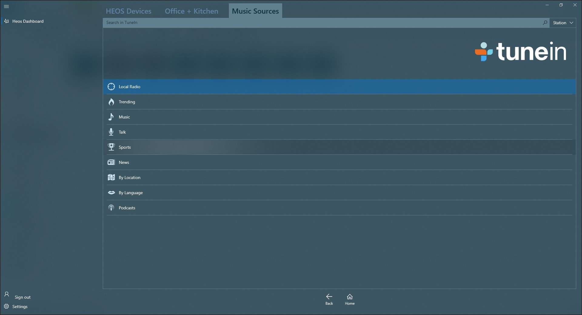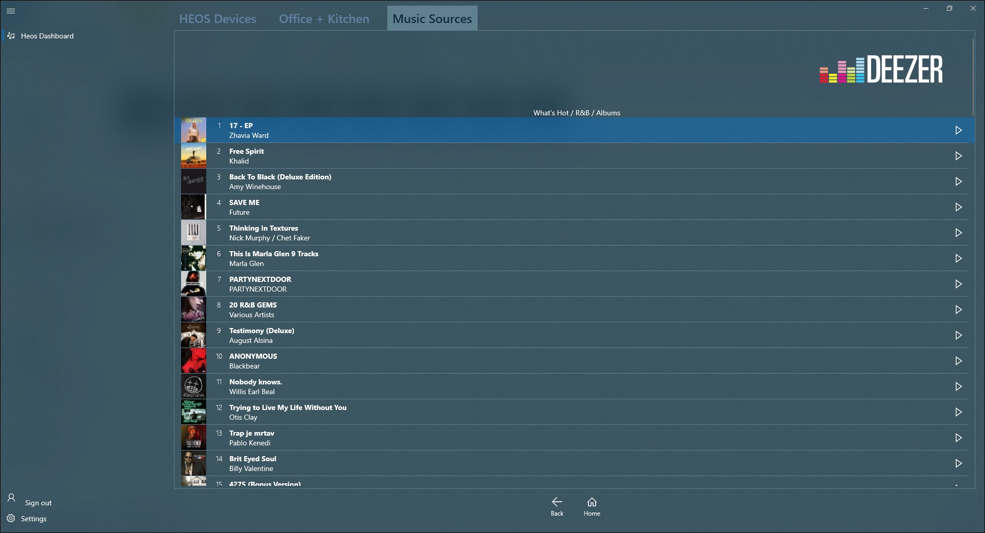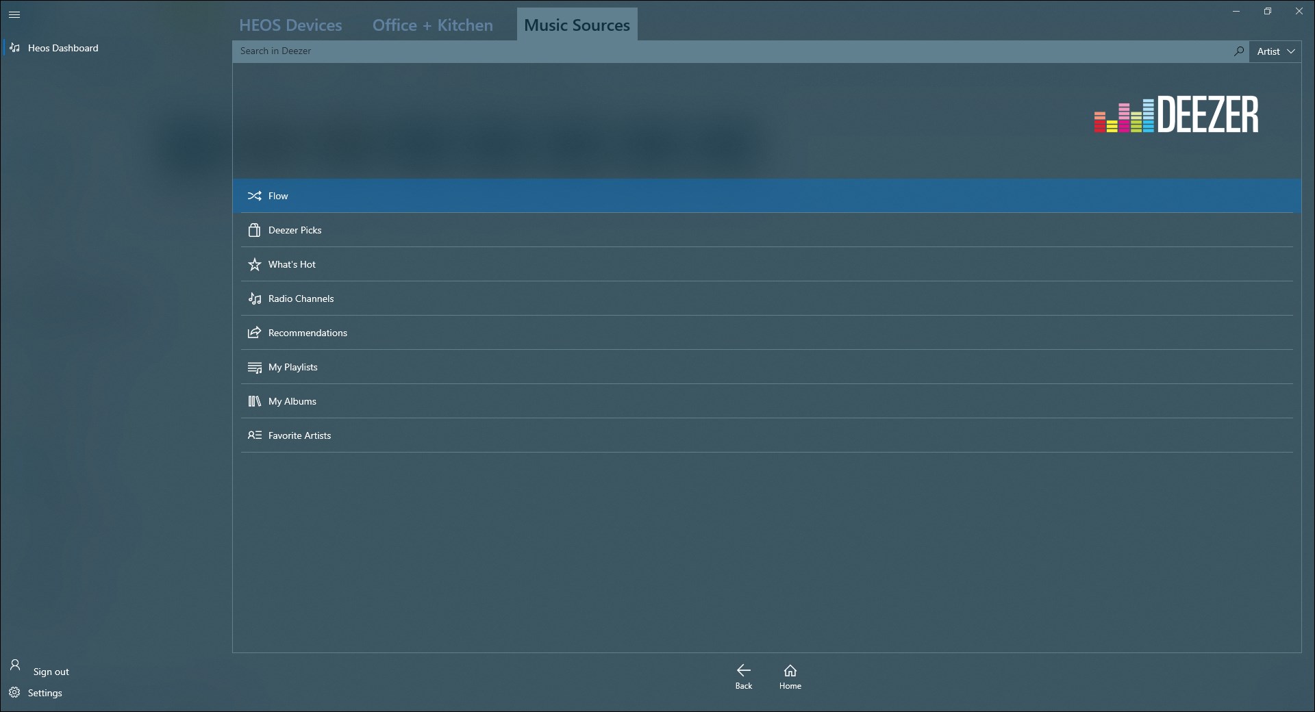 - access to sources such as Deezer, tunein, local UPnP server, play lists, history, and Favorites running using the HEOS components.