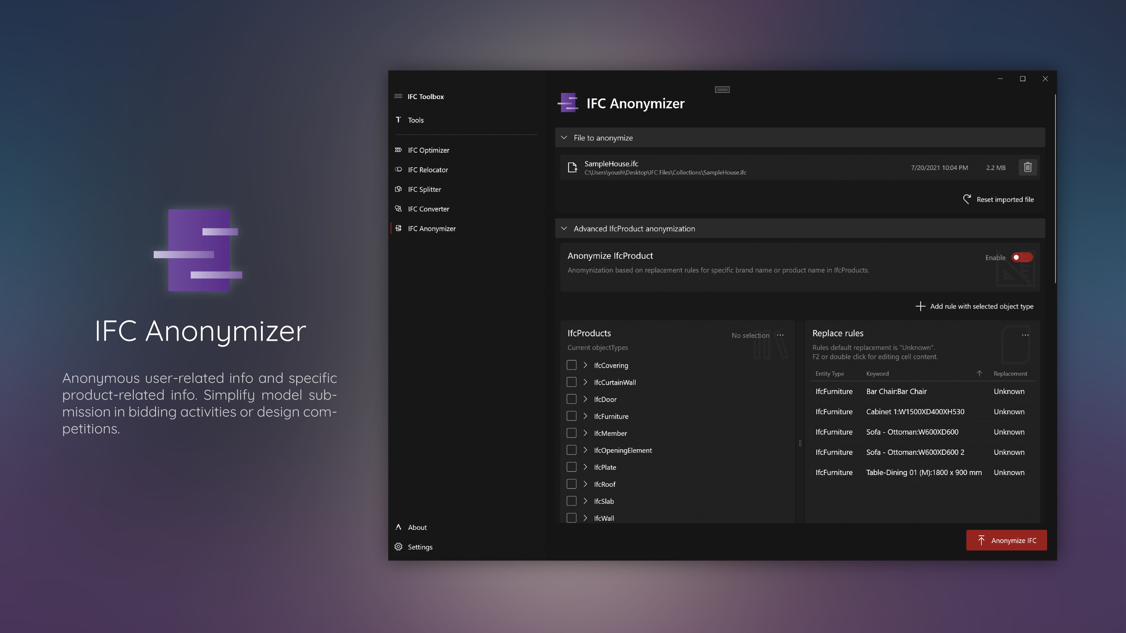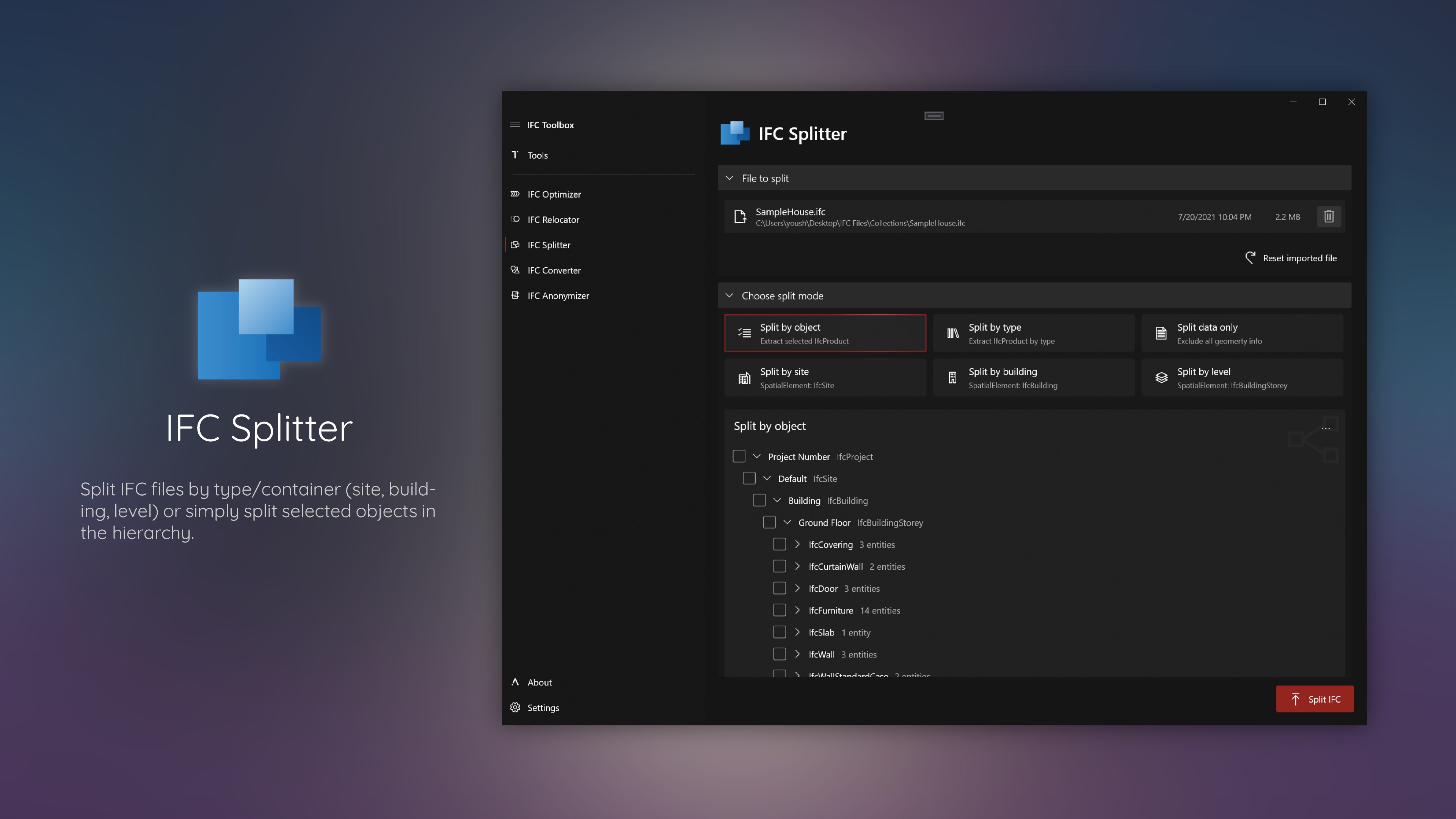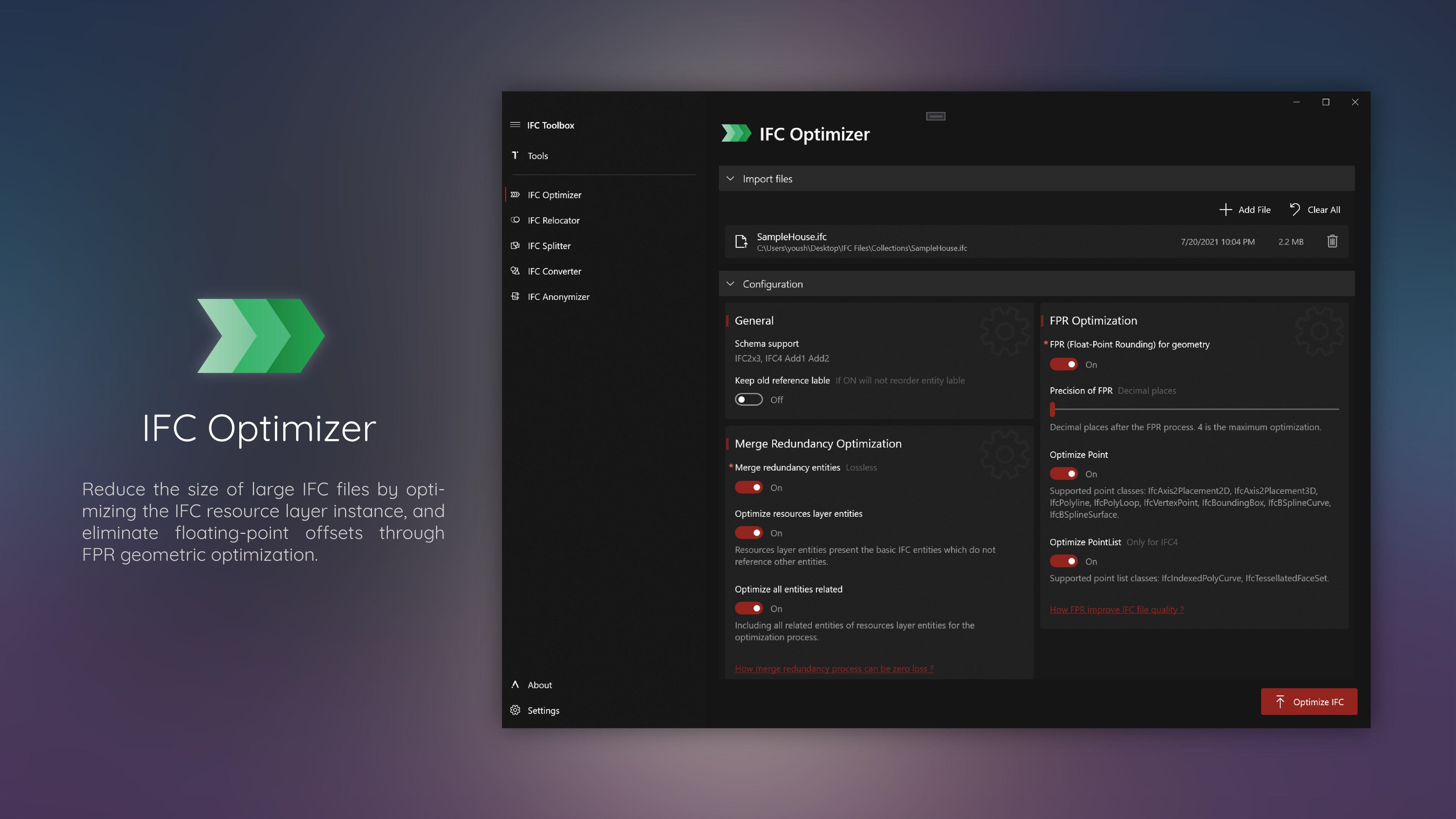 Optimize, convert, split, relocate, anonymize and validate IFC files easily.