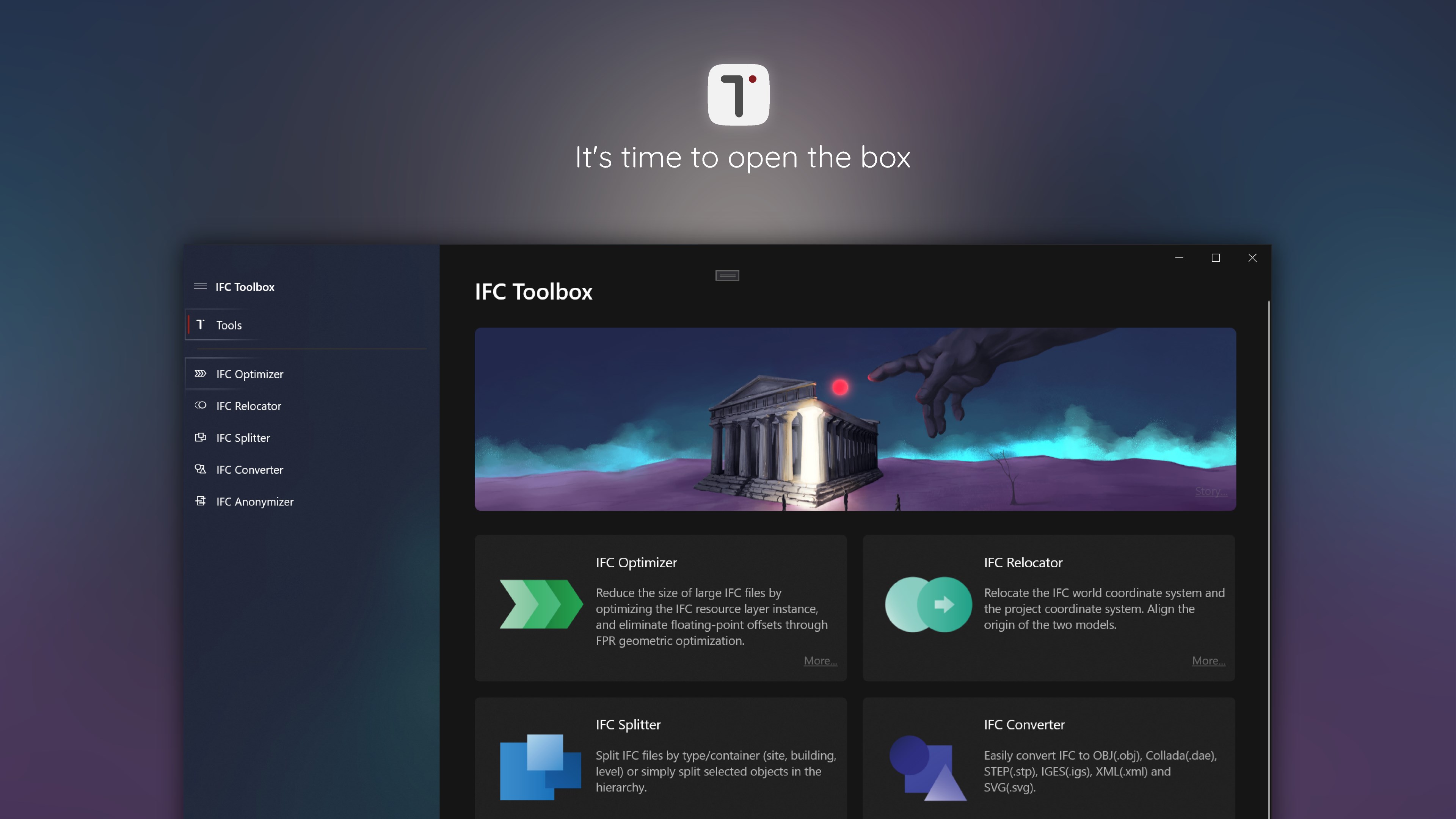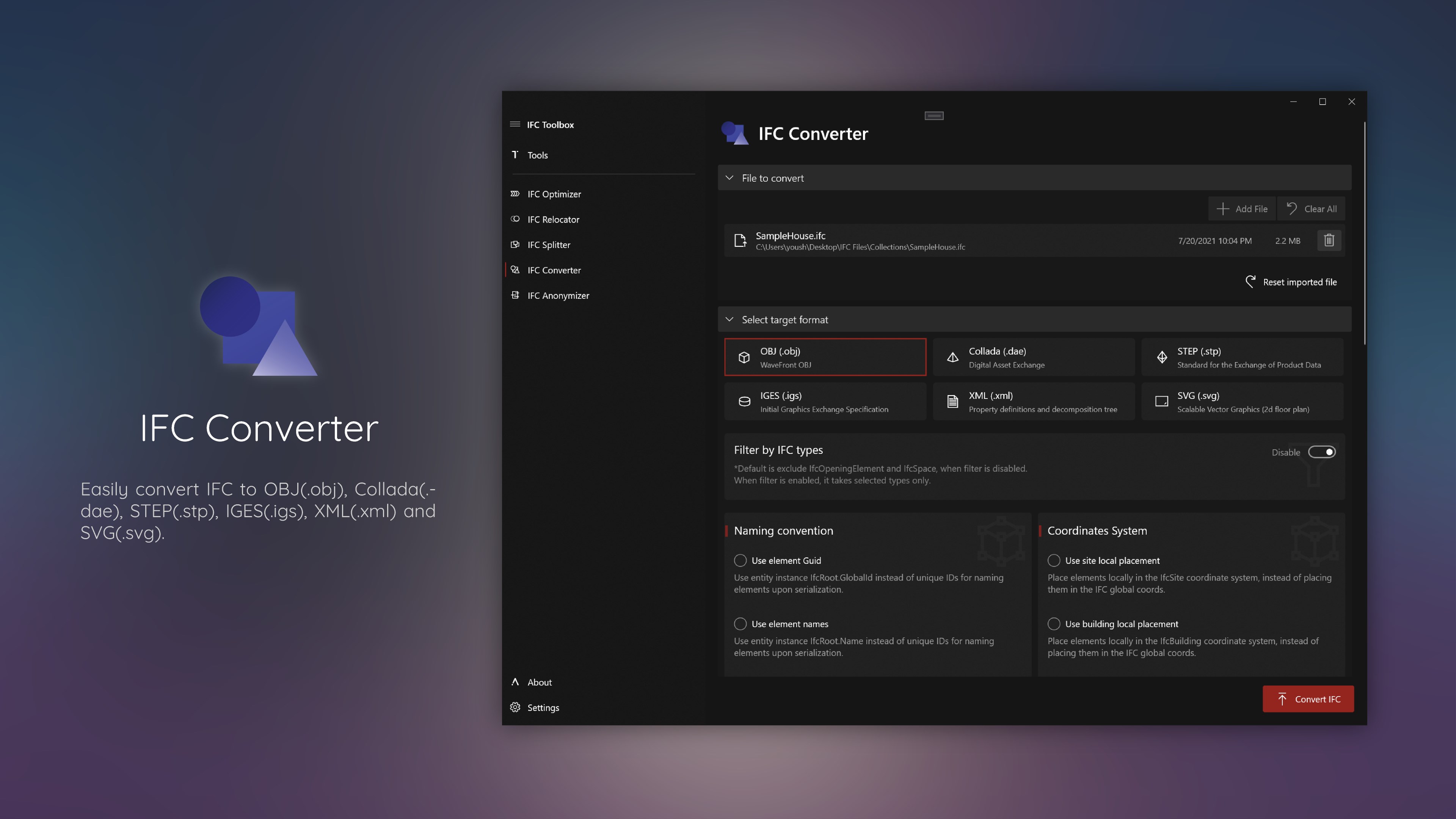 IFC Optimizer – Optimize IFC file size and geometry resources with FPR(Float-Point Rounded) method.IFC Converter – Converte IFC to OBJ(.obj), Collada(.dae), STEP(.stp), IGES(.igs), XML(.xml) and SVG(.svg).IFC Splitter – Split IFC file by type / by site / by building / by level or only property data.IFC Relocator – Relocate IFC world coordinate system and project coordinates system (Align models origin points).IFC Anonymizer – Anonymize user-related info and some specific product-related info for bidding or design competition use.IFC Validator – Validate the existence of the properties of classifications in the IFC file. Powered by buildingSMART Data Dictionary - bSDD OpenAPI.