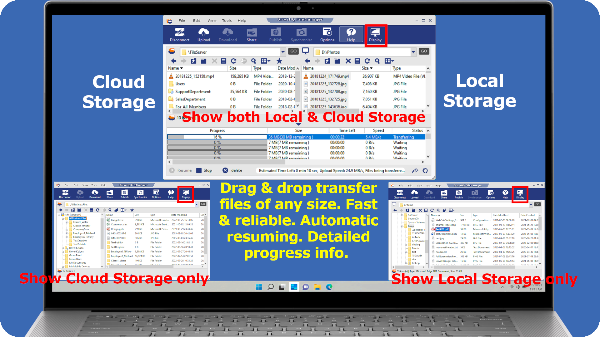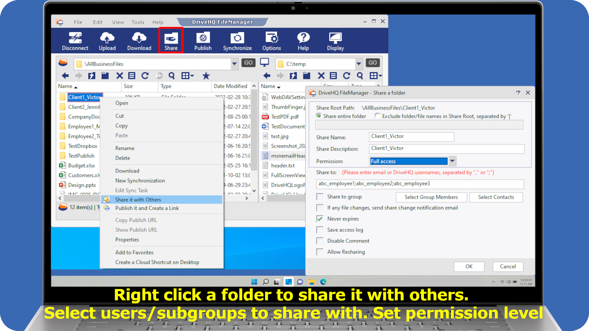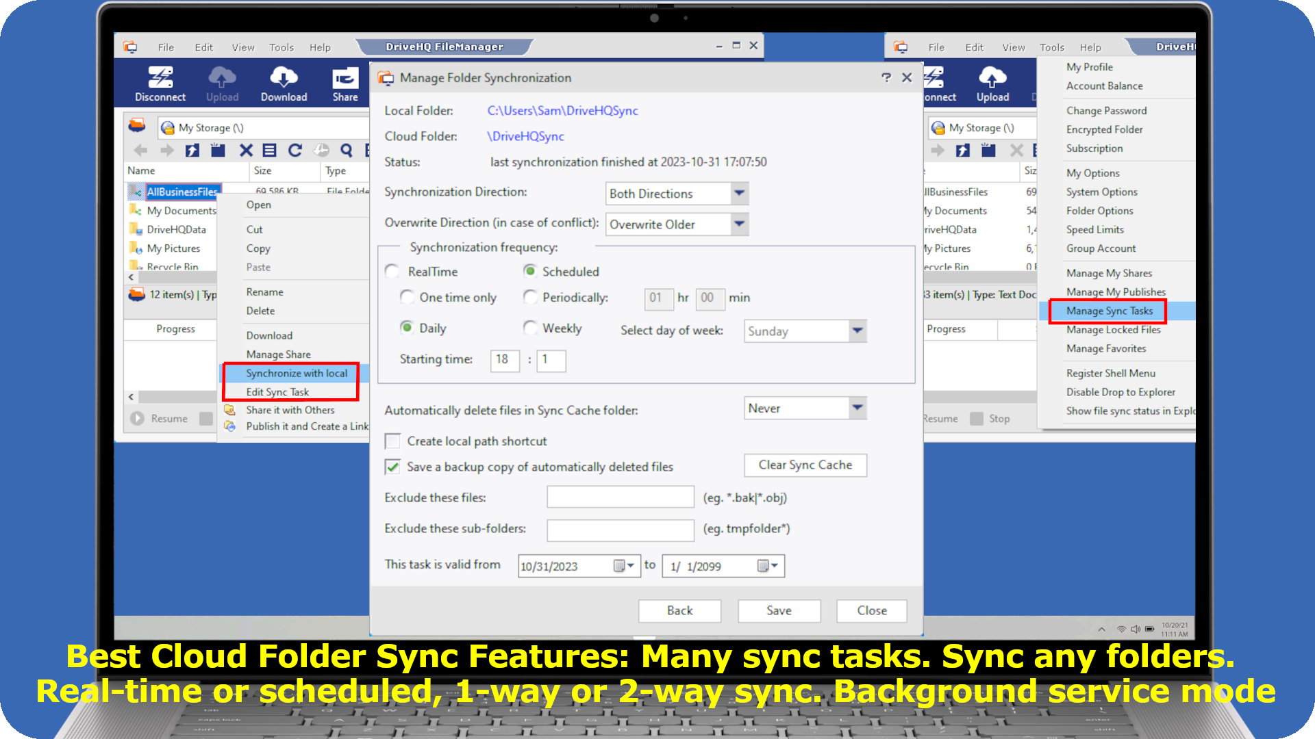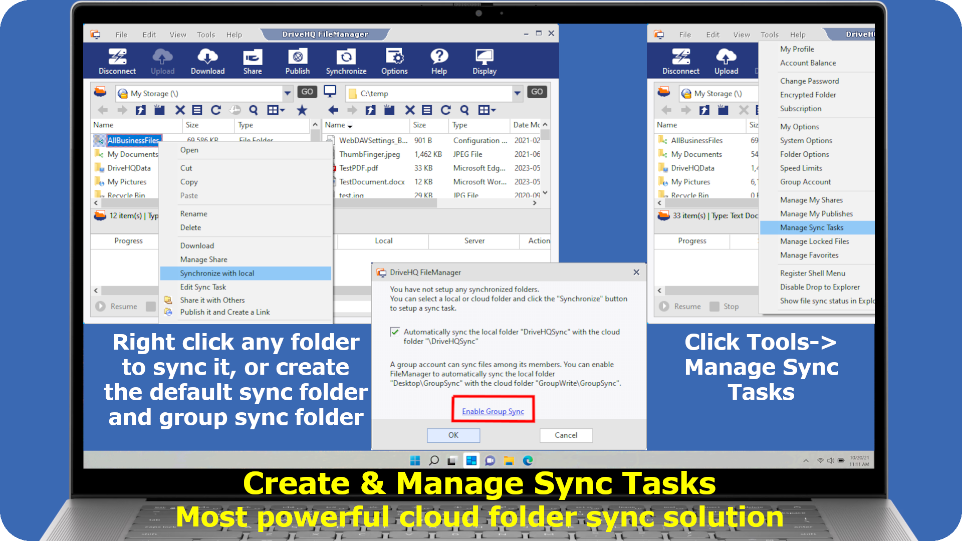 DriveHQ FileManager is a flagship client app for DriveHQ's Cloud IT service. It can manage both cloud and local files. You can easily drag and drop files/folders between the local drive and cloud storage; you can directly edit cloud files and save back to the cloud; create multiple folder synchronization tasks to sync different folders with different schedules; share folders with different users/subgroups and set different permissions.