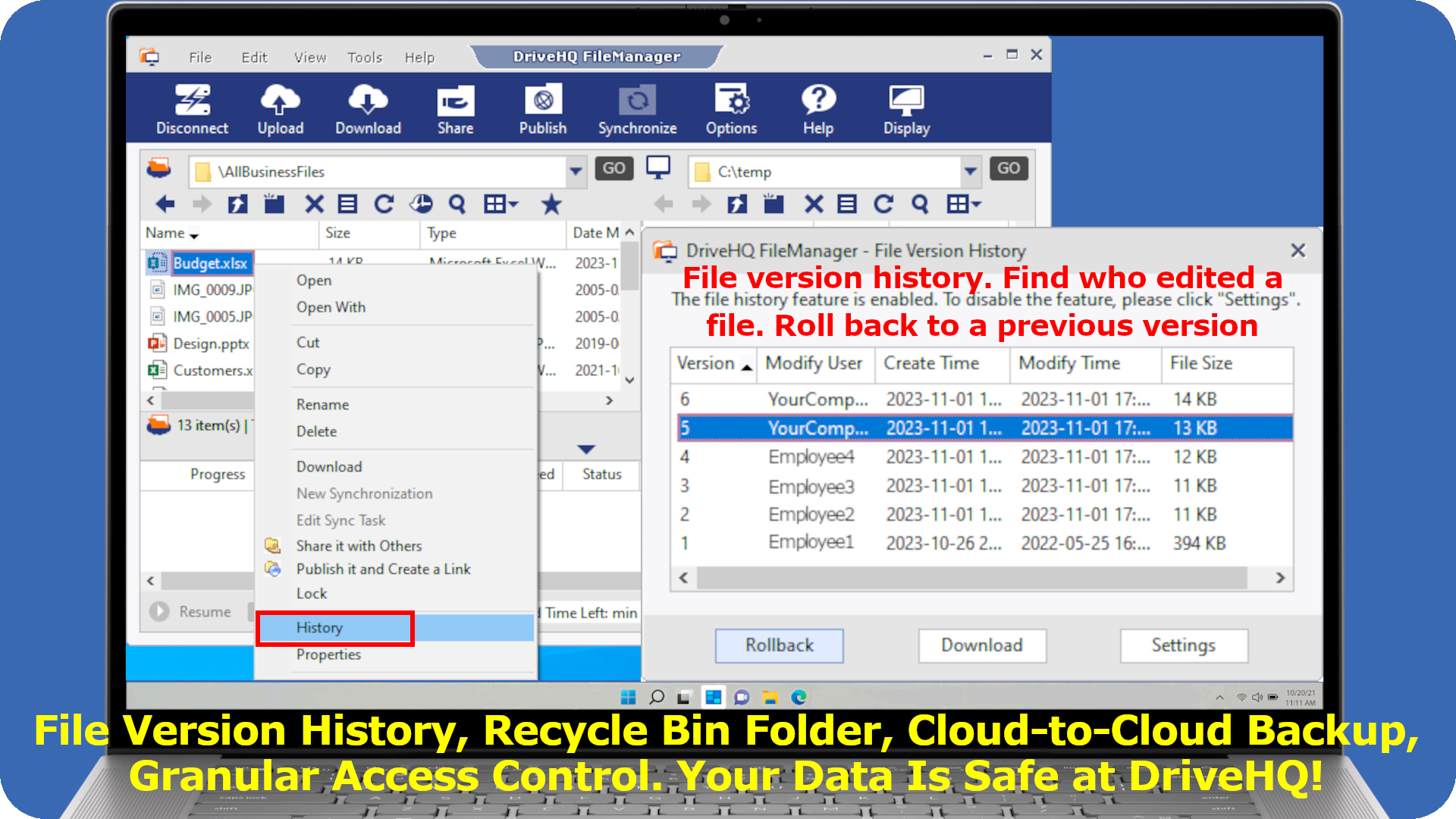 DriveHQ has offered cloud IT service since 2003, quite a few years before other companies started offering cloud services. We have over 20 years of track record. Our system is extremely secure and reliable, with over 99.99% up-time. DriveHQ has far more and better features than our competitors. Please sign up for a free account to receive 5GB free cloud storage or sign up for a free business trial.