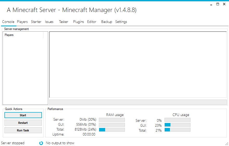 Mine Server Manager is intended to provide Minecraft server owners with a easy to use, powerful GUI. Except from clearly displaying server information, it also adds some powerful functions, like a task planner, error logger and solver, plugin manager...