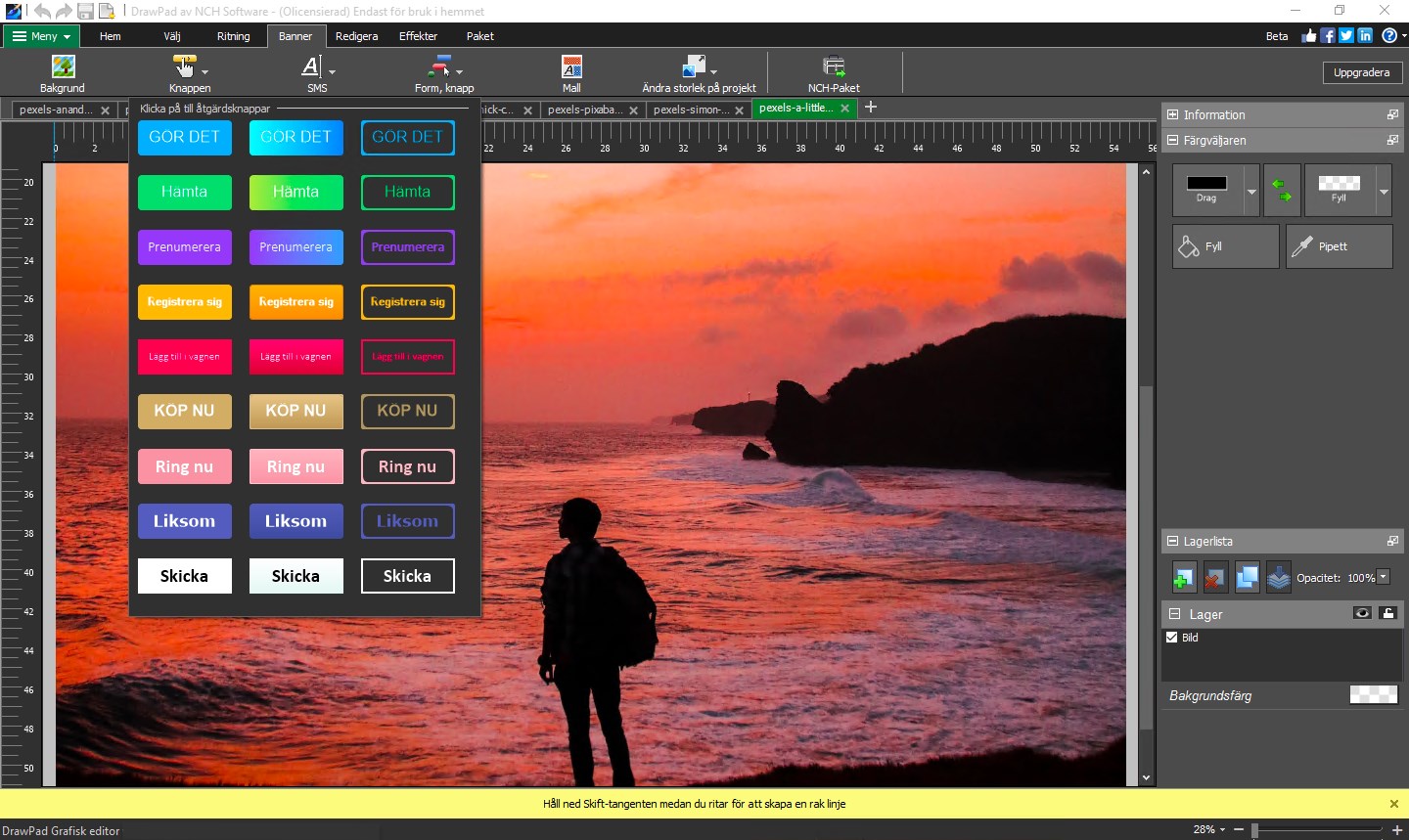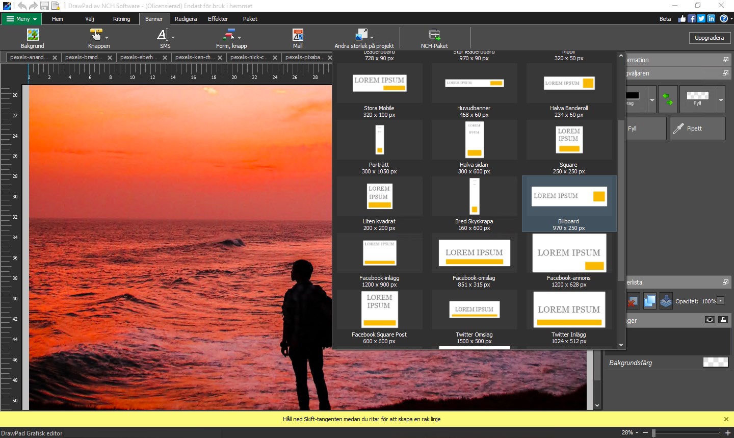 Med DrawPad kan du enkelt rita och skapa alla typer av grafiska designprojekt. Om du är nybörjare kan du börja med en färdig mall för många populära projekt som logotyper, inbjudningar och bannerannonser. Detta snabba och roliga program för bildkomposition och manipulation fungerar med både raster- och vektorbilder. När du arbetar kan du lägga till bildlager för att göra oförstörande ändringar. Detta ritprogram är fullt av kreativa verktyg och redigeringsfunktioner så att du kan göra din grafiska design precis som du föreställt dig den. För affärer, för projekt och för skojs skull är DrawPad det perfekta grafikverktyget för dig.