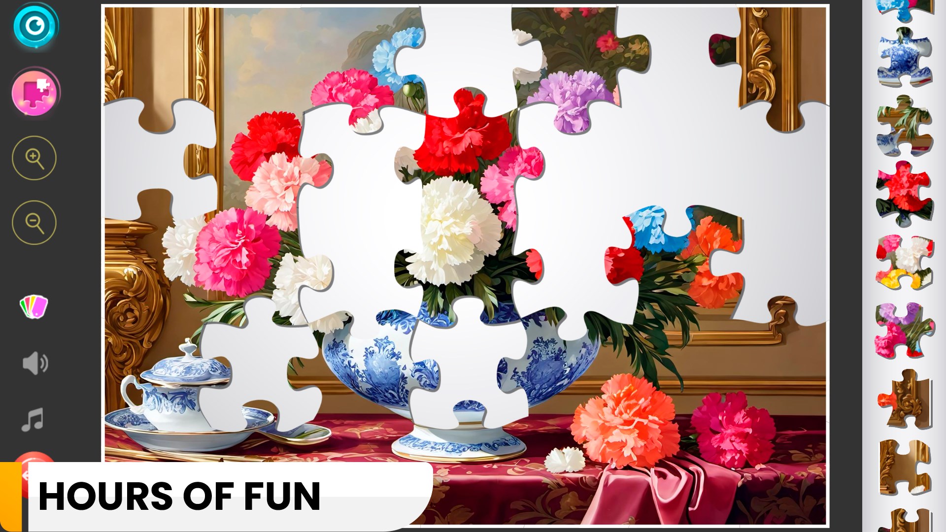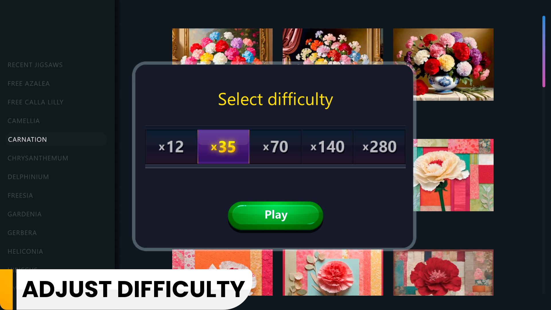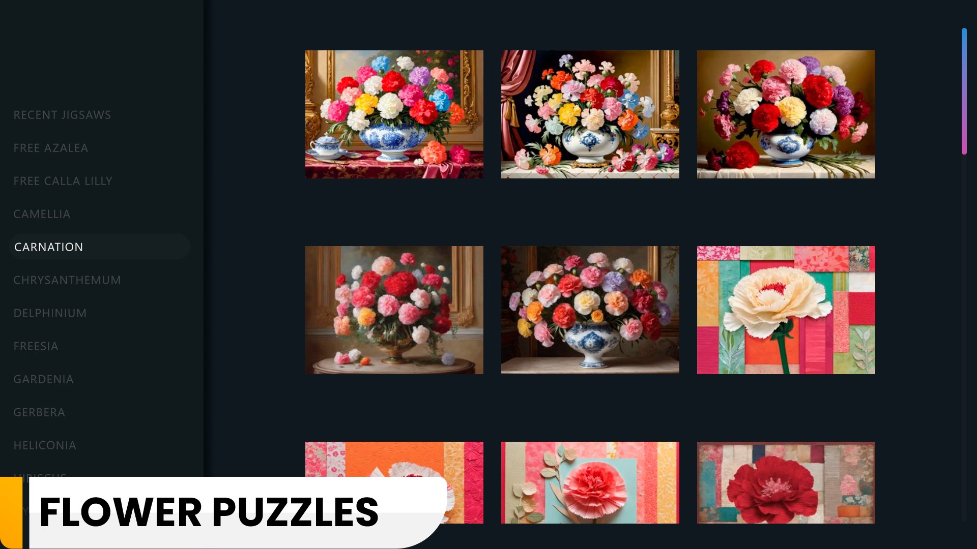 Hundreds of hand-picked, high-resolution flower imagesTailor your puzzle experience with 16-280 pieces Simple, intuitive user interface Relaxing background music enhances your experiencePerfect for beginners and puzzle enthusiasts alikeIdeal for mindfulness and relaxationFrequent updates with new beautiful imagesSuitable for all ages