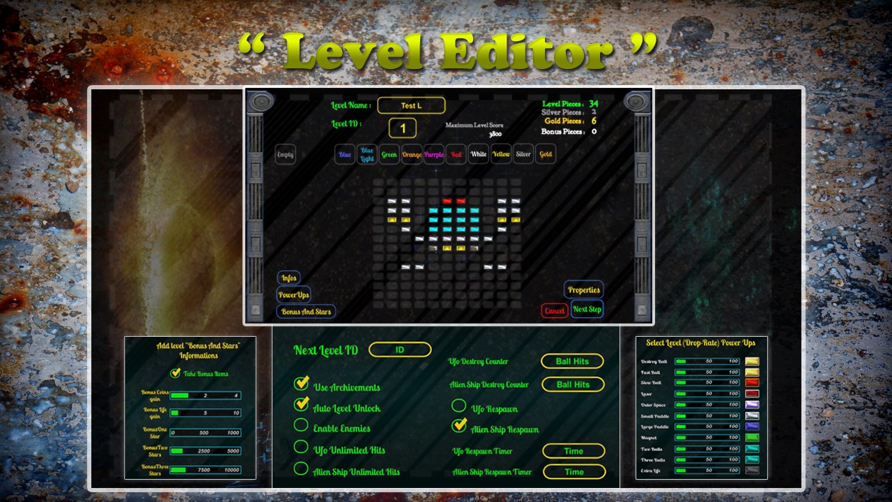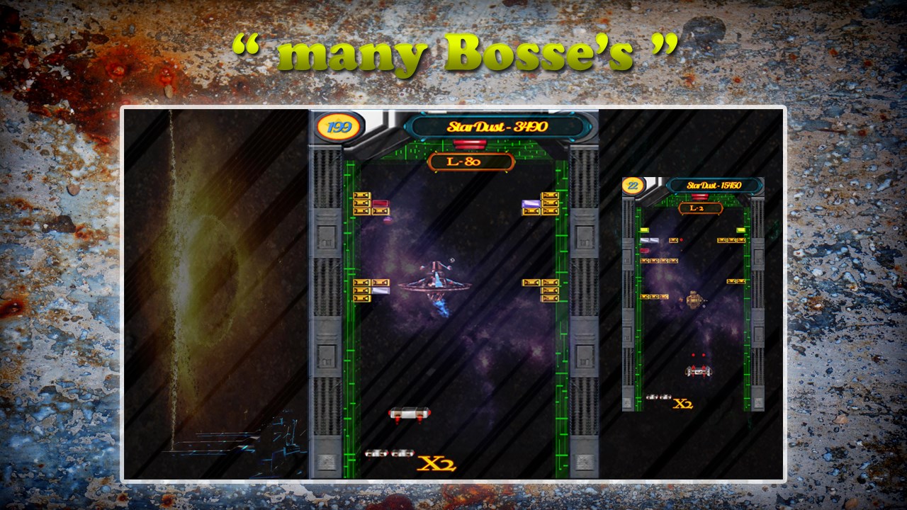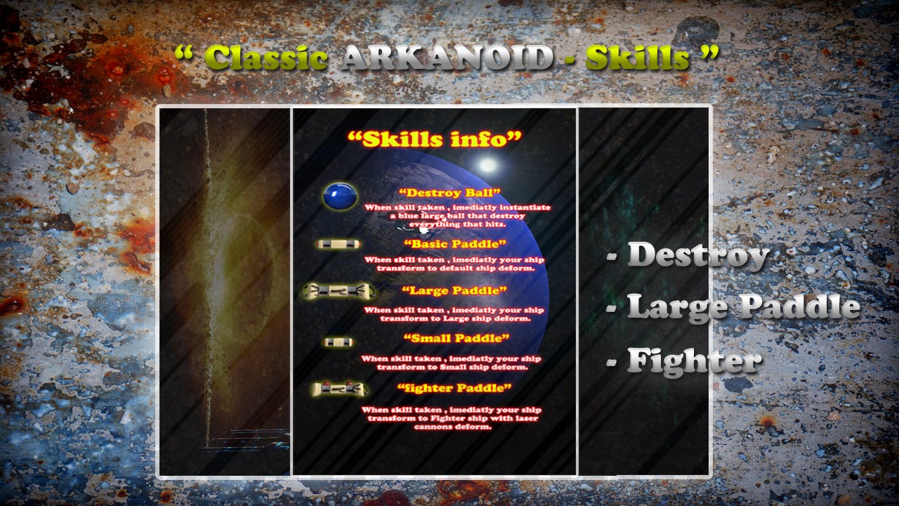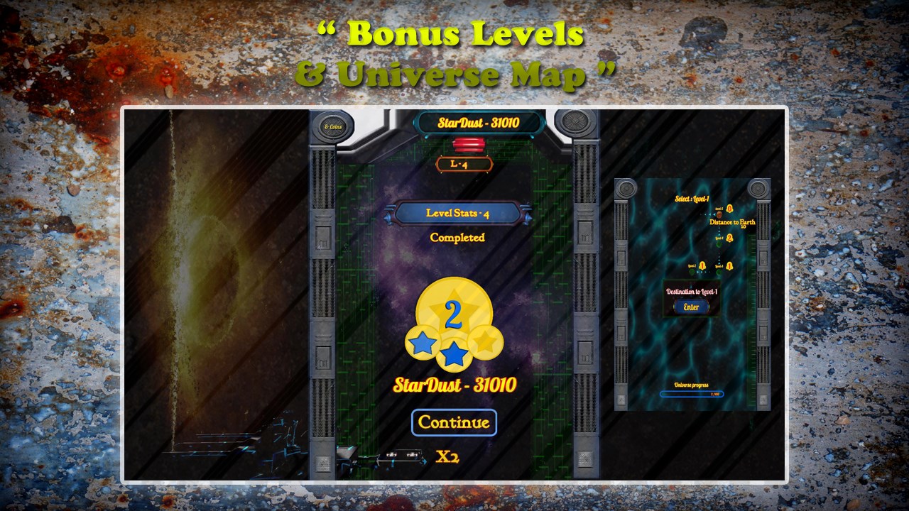 Classic Arkanoid (Skills)Star Score (System) Explore Universe (Map increase - Levels)Many UFo and BossesArchivements and Stats Level Editor (Create your Levels)Many Controlls (PC Mouse - Touch - Joystick - Gamepad)Save Family System (You can Save your Progress and Loaded at any Time)