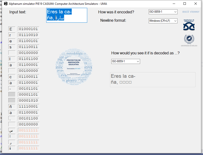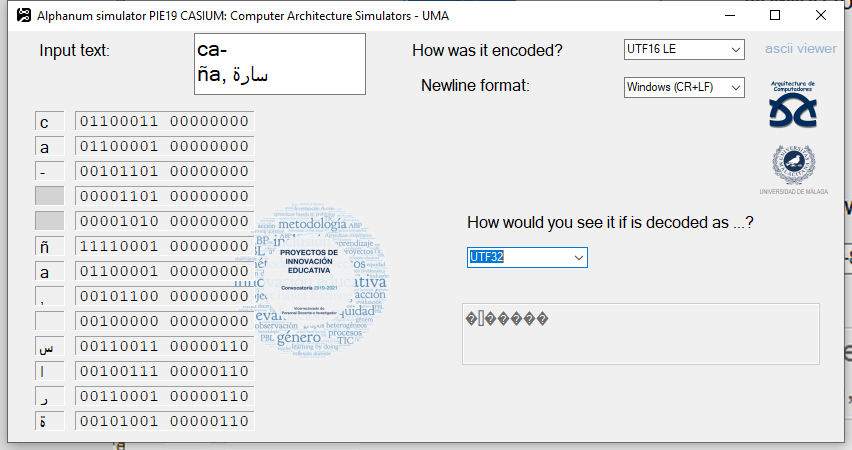 Alphanumeric character encoding simulator in different formats (ASCII, UTF8, etc).