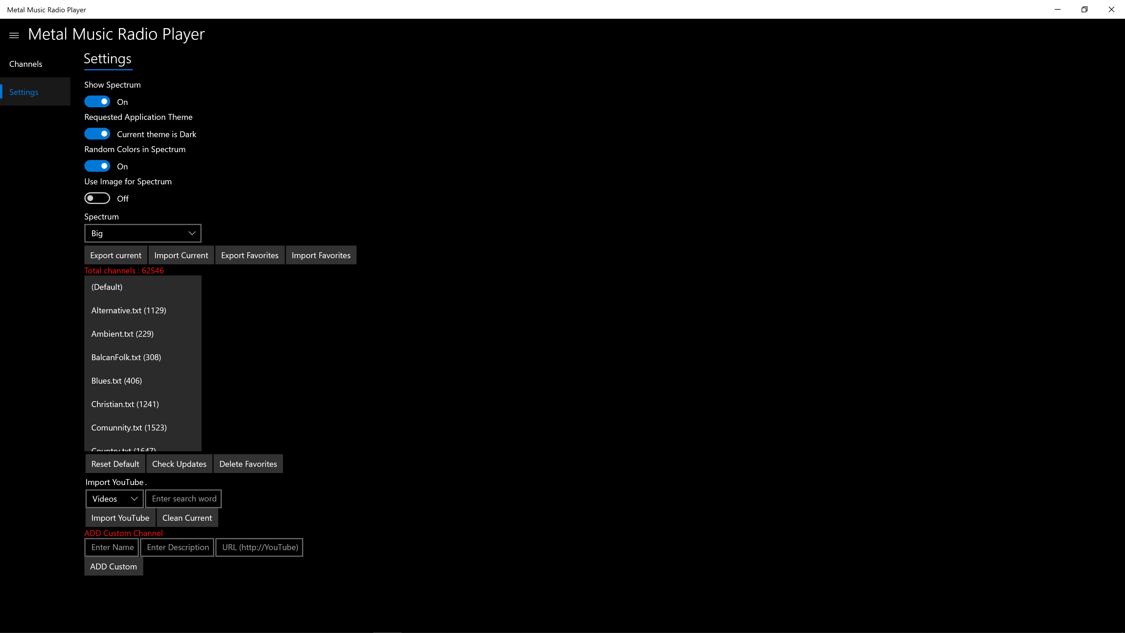 Added Custom channel under settings to merge with current station list. (Supports also YouTube).