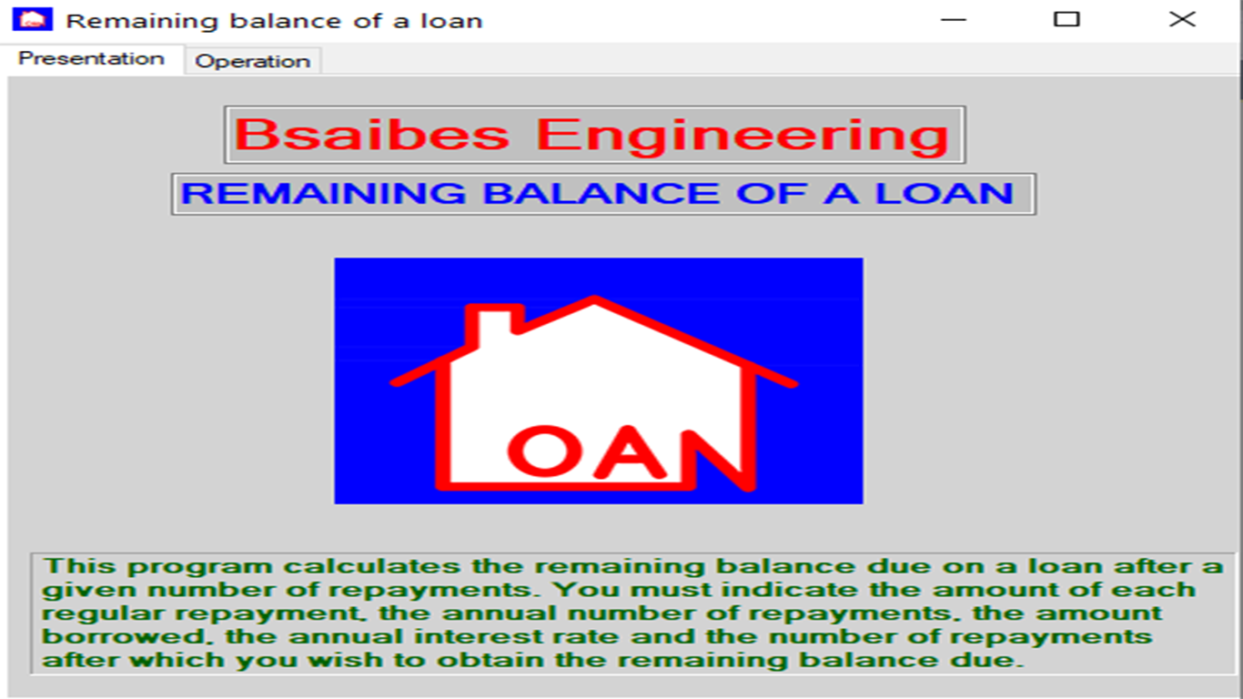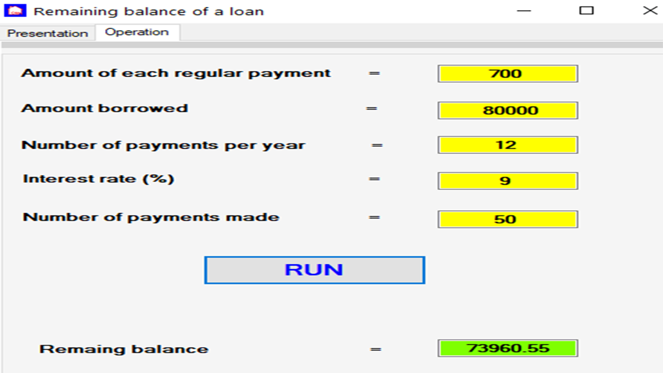 This program calculates the remaining balance due on a loan after a given number of repayments. You must indicate the amount of each regular repayment, the annual number of repayments, the amount borrowed, the annual interest rate and the number of repayments after which you wish to obtain the remaining balance due.