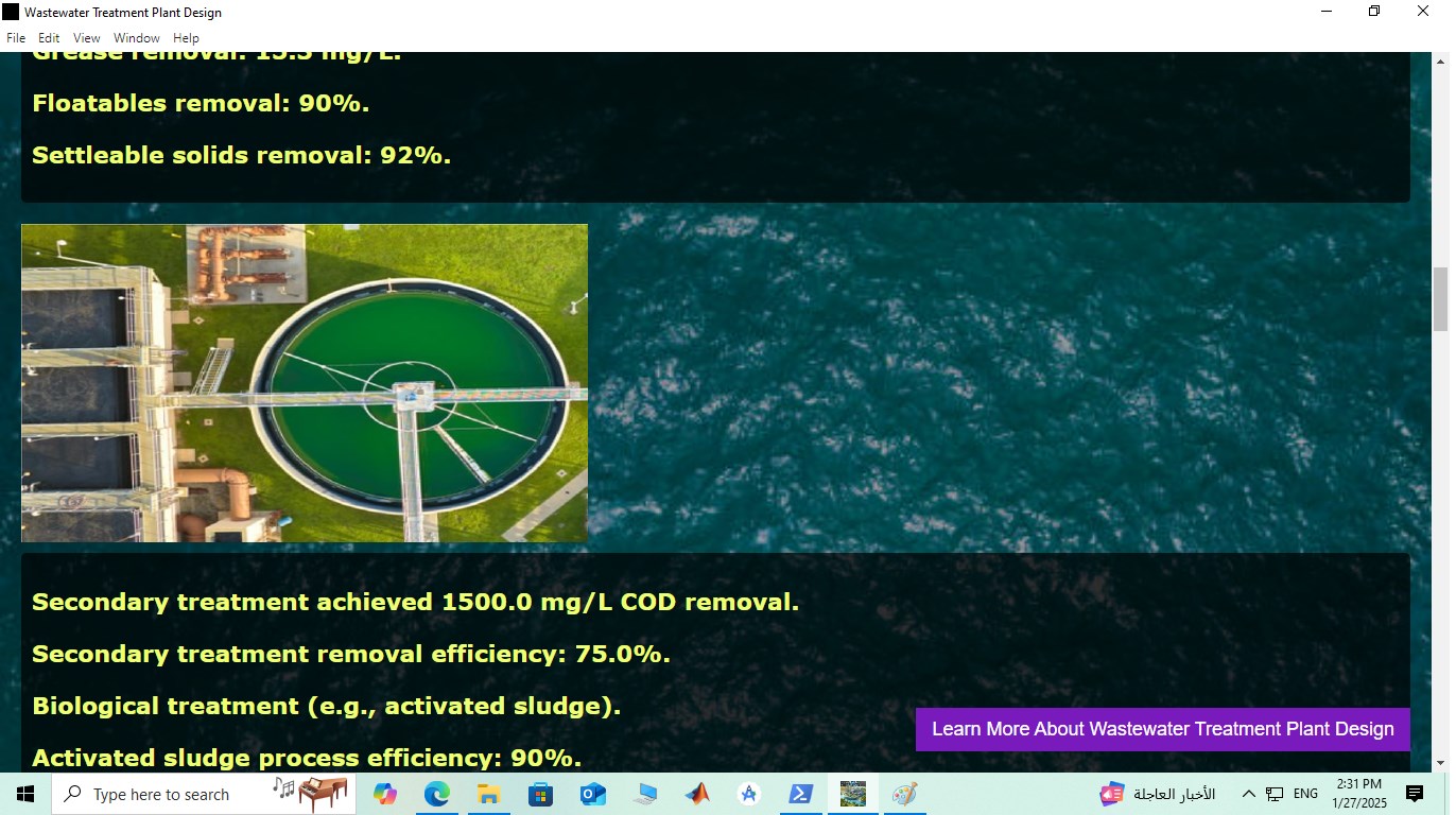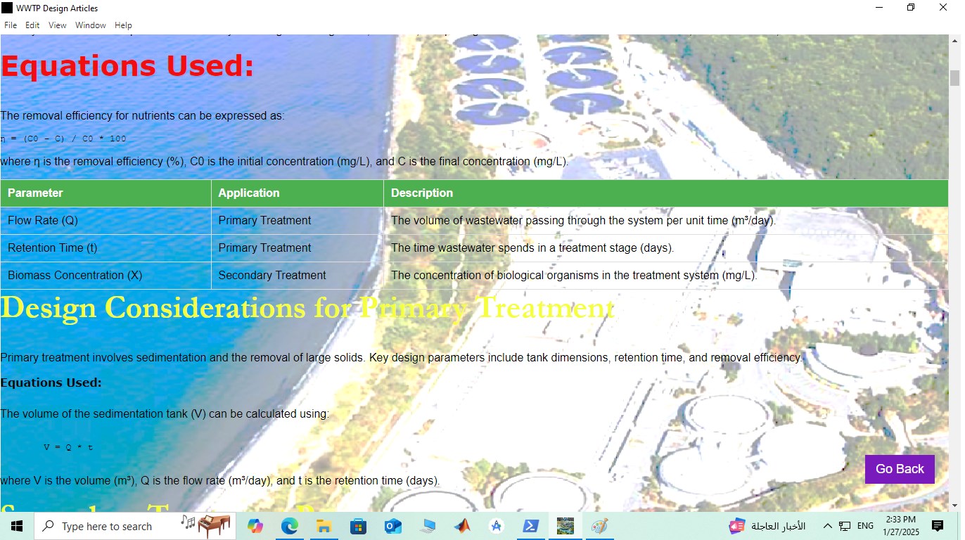 - Detailed calculations for primary, secondary, and tertiary treatment processes