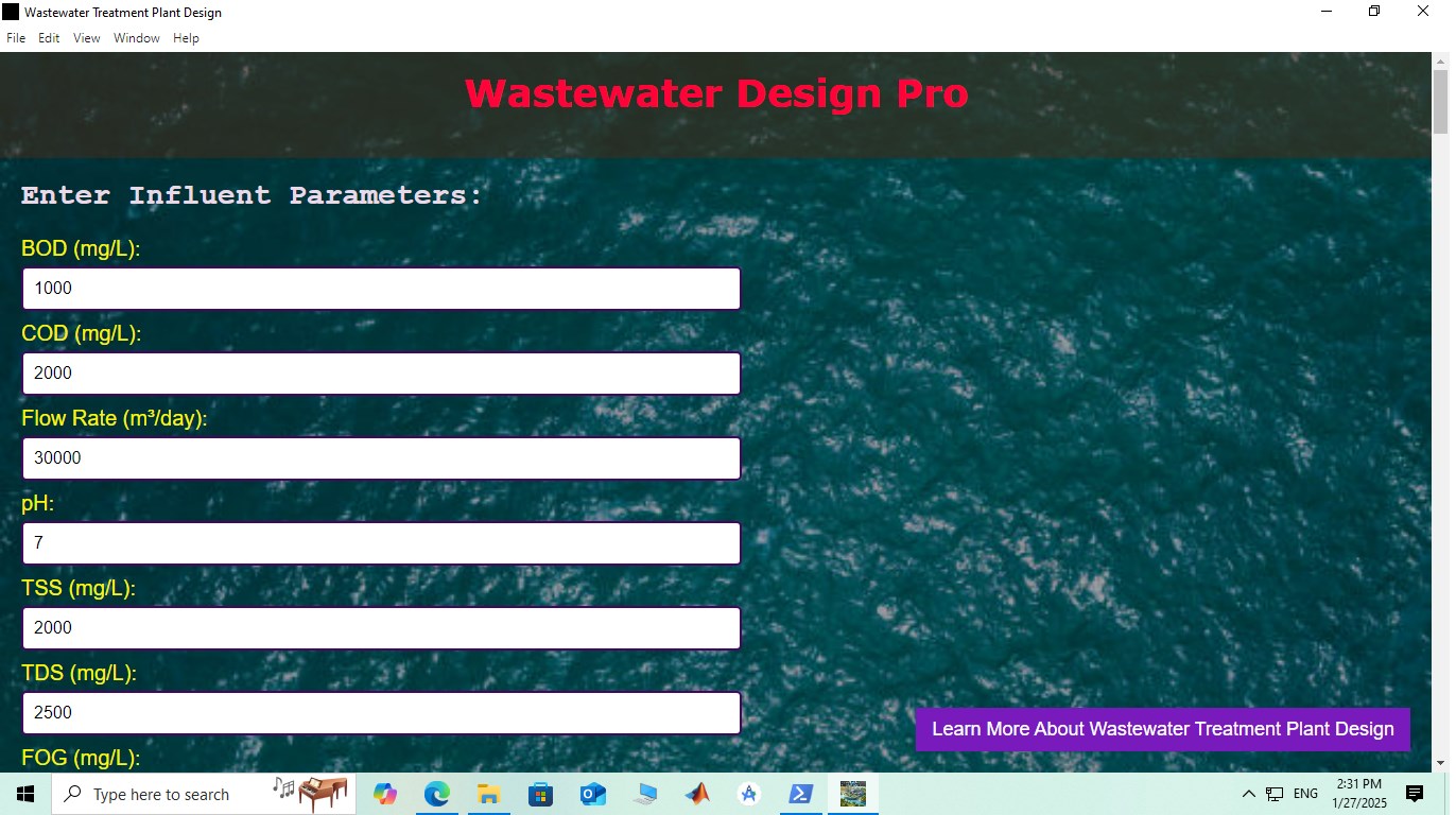 Comprehensive input options for influent parameters (BOD, COD, TSS, TDS, FOG, NH₃, PO₄, etc.)