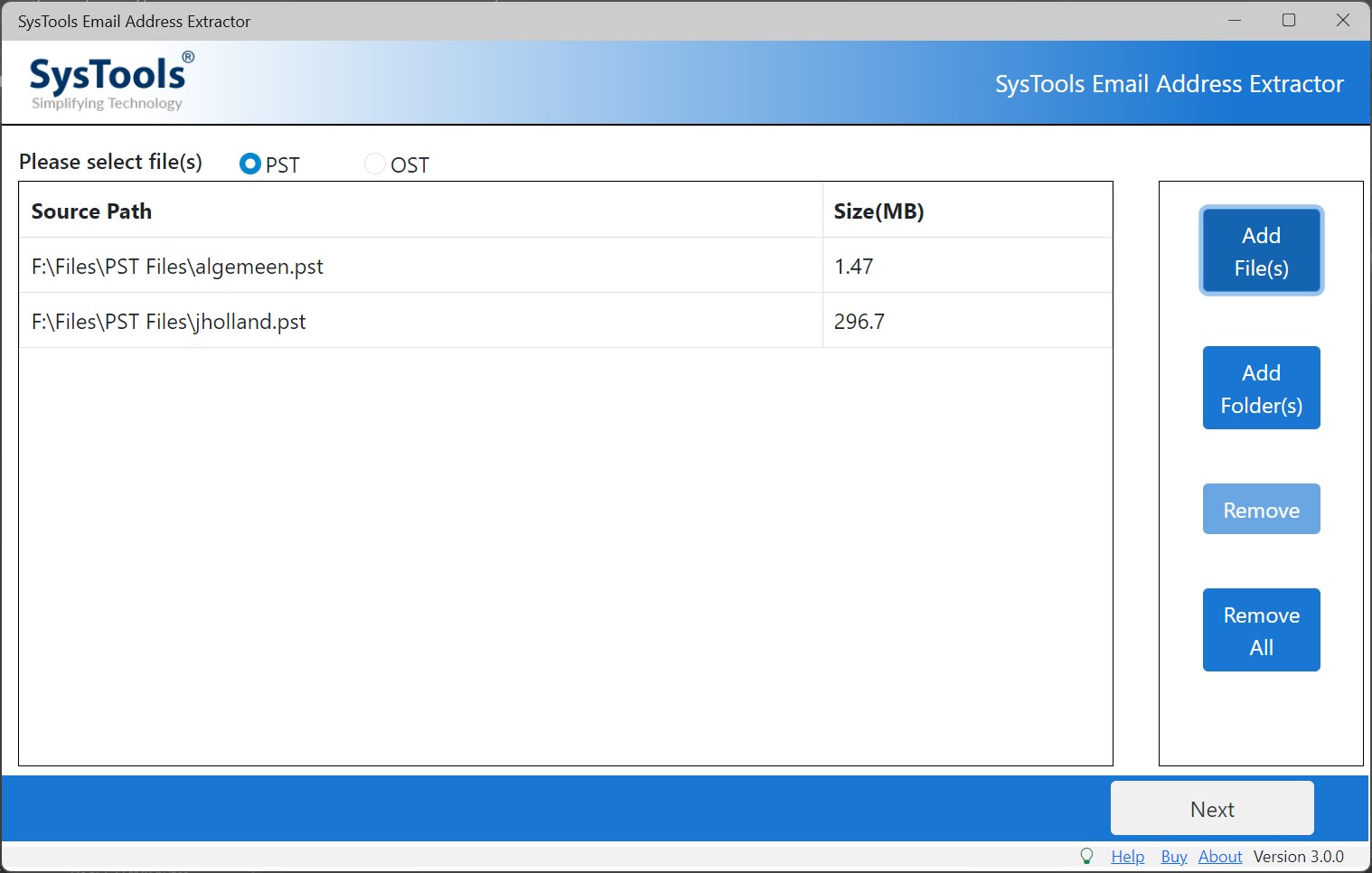 Limitation: The demo version will process the first 5 files, extracting 10 email addresses from each PST/OST file and the default storage.