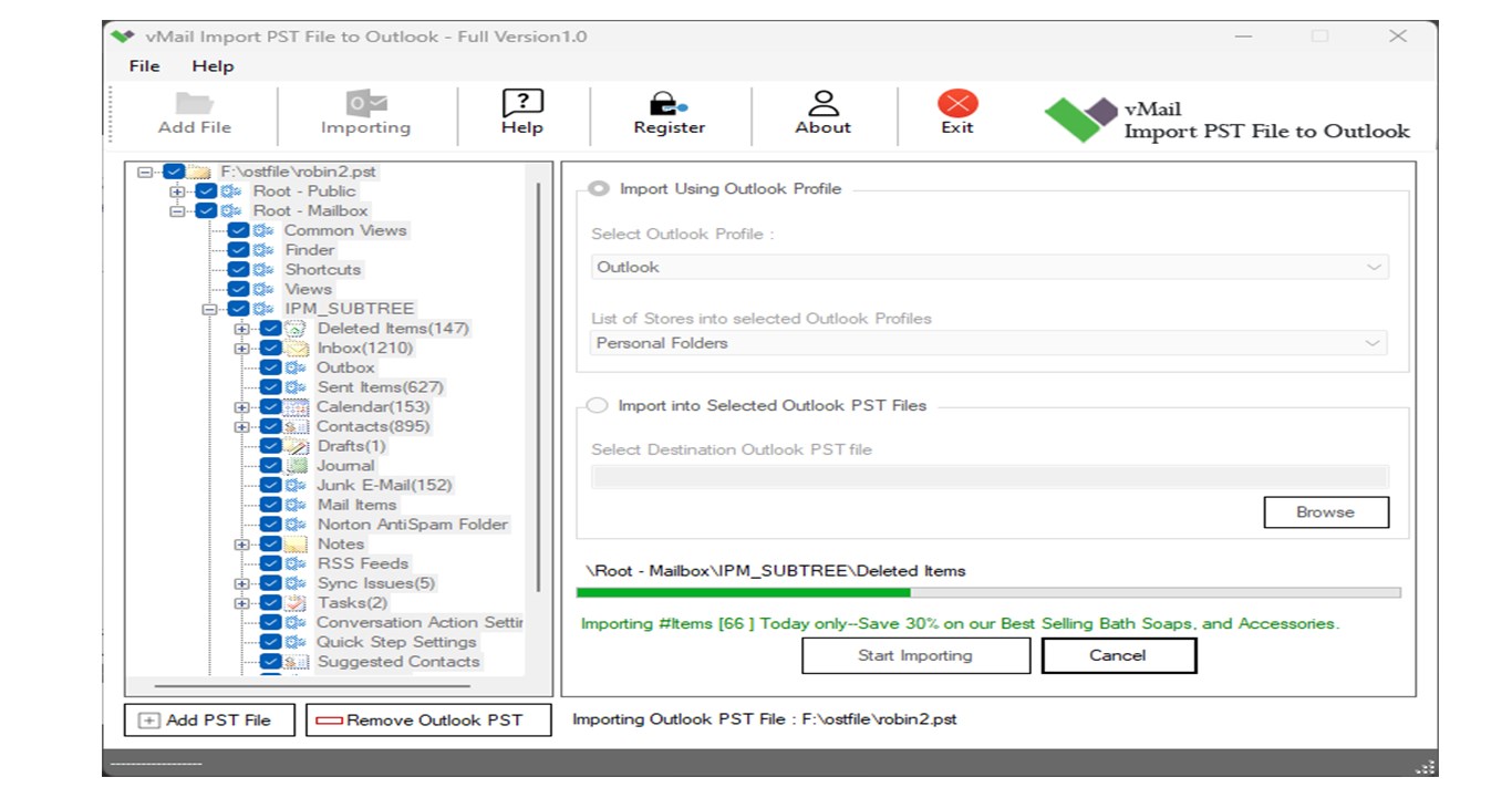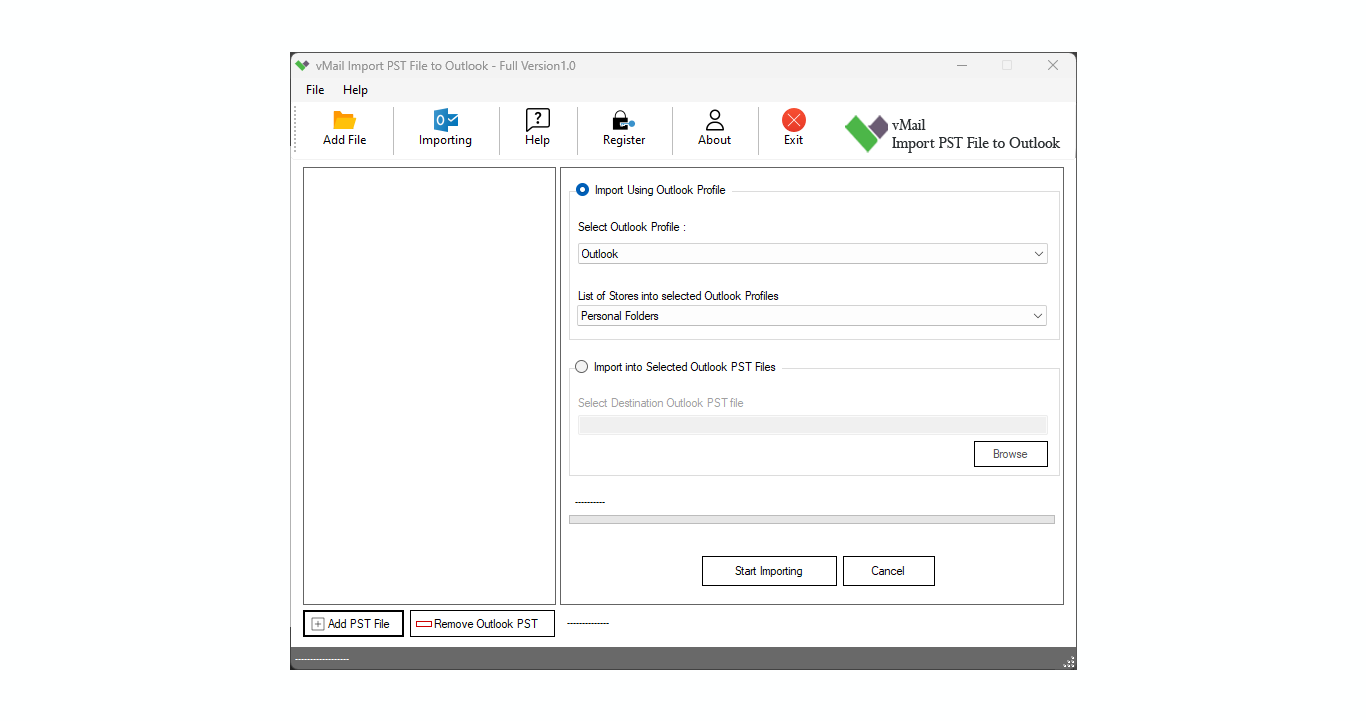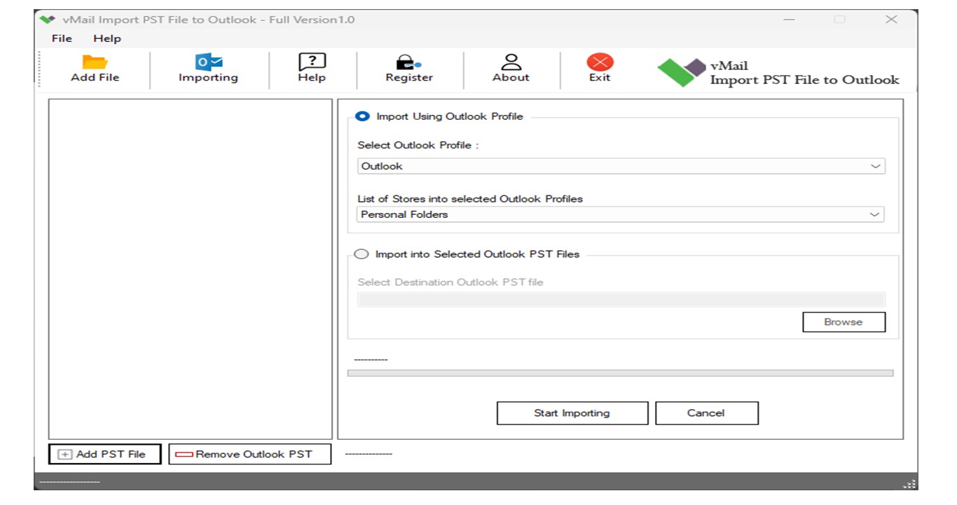 vMail Import PST File to Outlook to open healthy Outlook PST file message like as emails, contacts and other data into your Outlook Profile selected Profile or selected Outlook PST File without any issue.