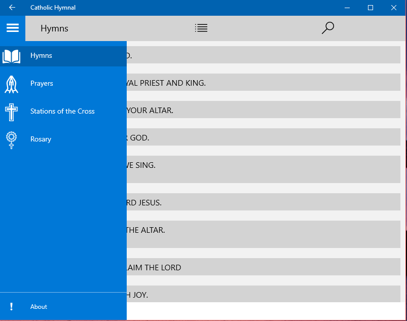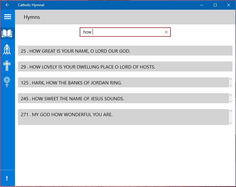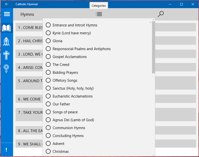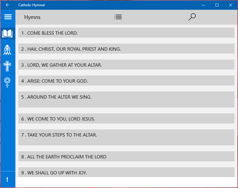Catholic Hymnal is a mobile version of the Catholic Hymnal as is used in Ghana. It has a simple and clean user interface and includes search functionality that enhances searching for specific hymns.