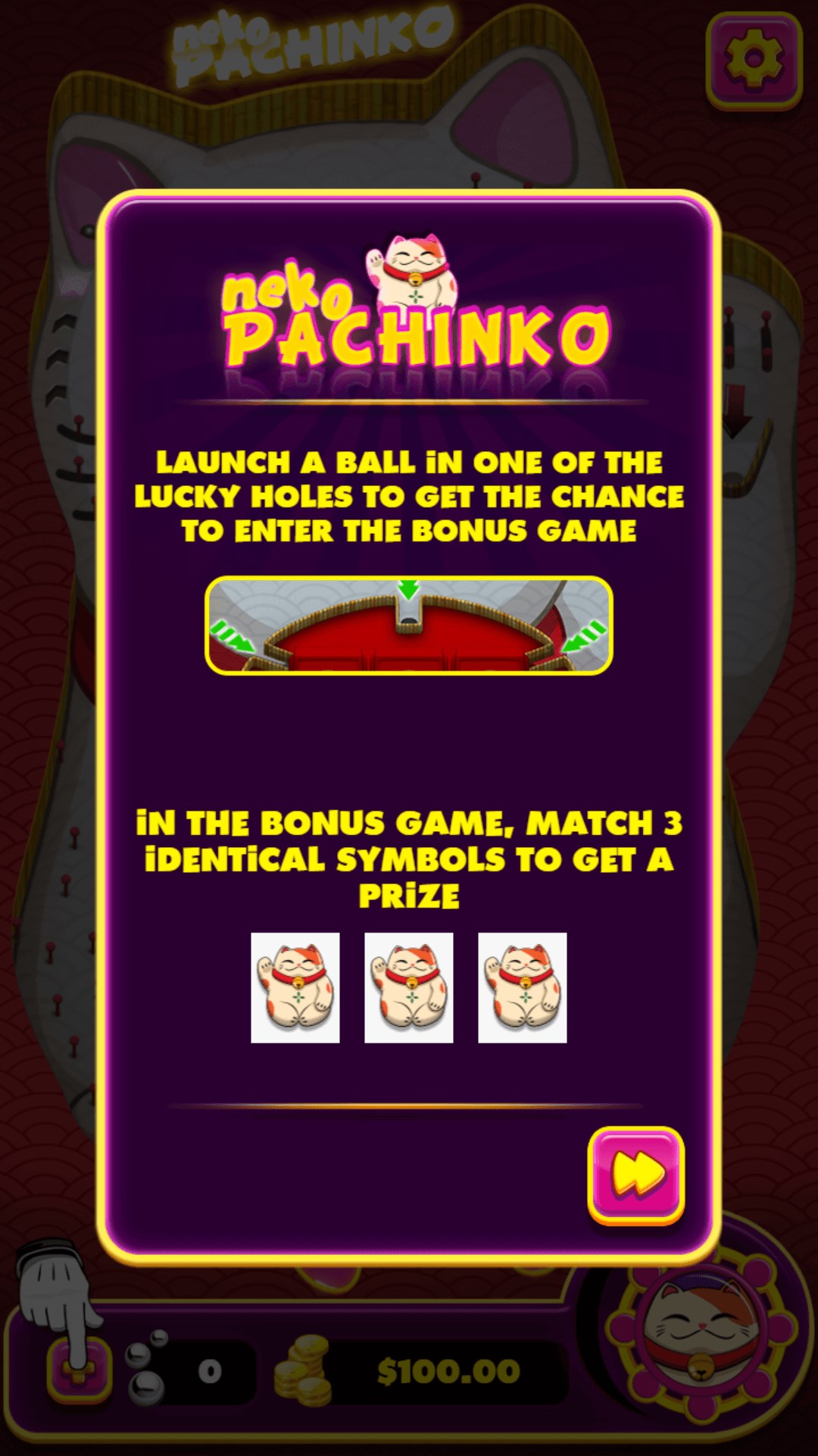 Your aim is to throw as many balls as possible inside the lucky holes to enter the bonus game, where, if you get three identical symbols, you'll win a prize!