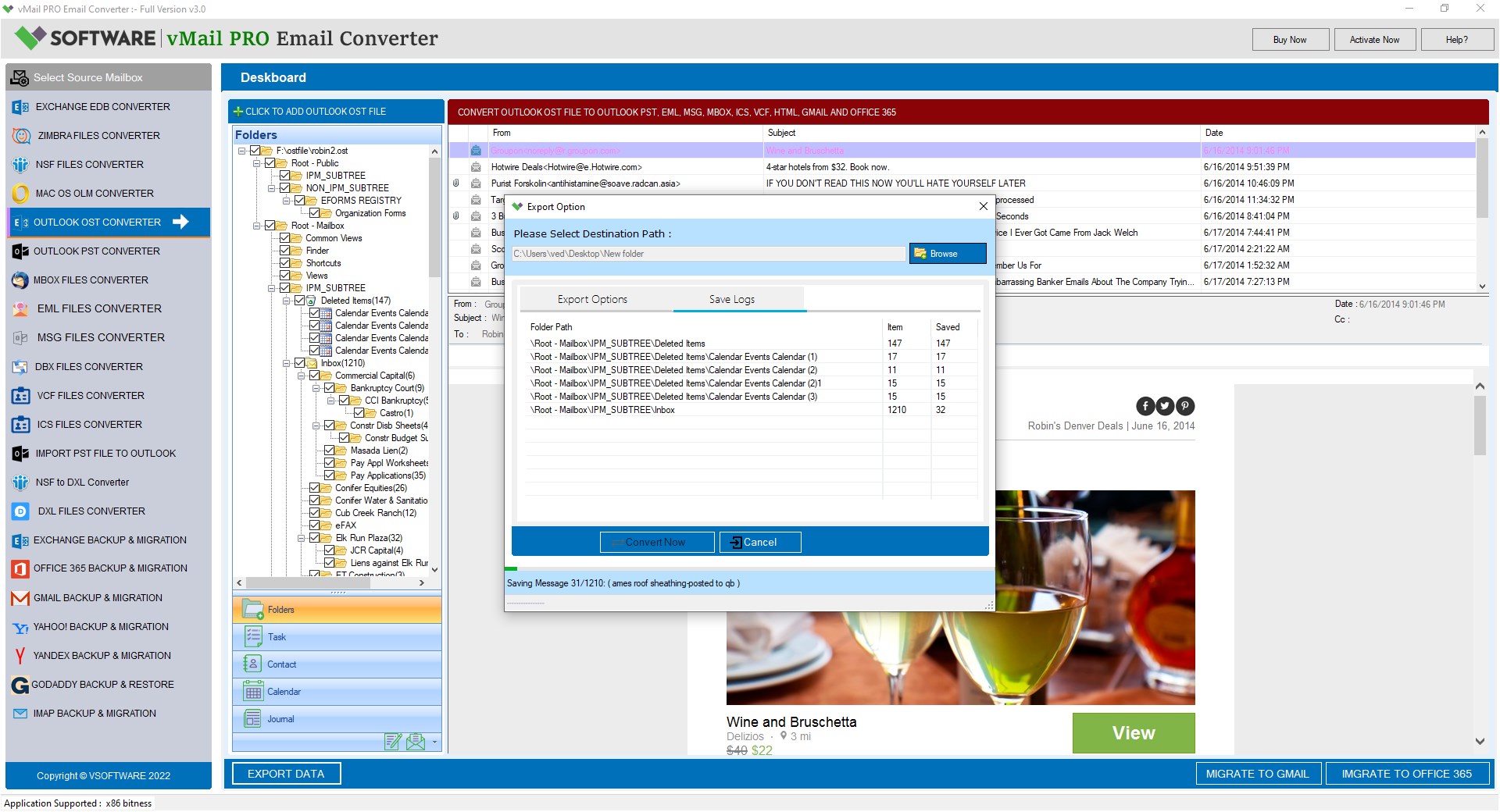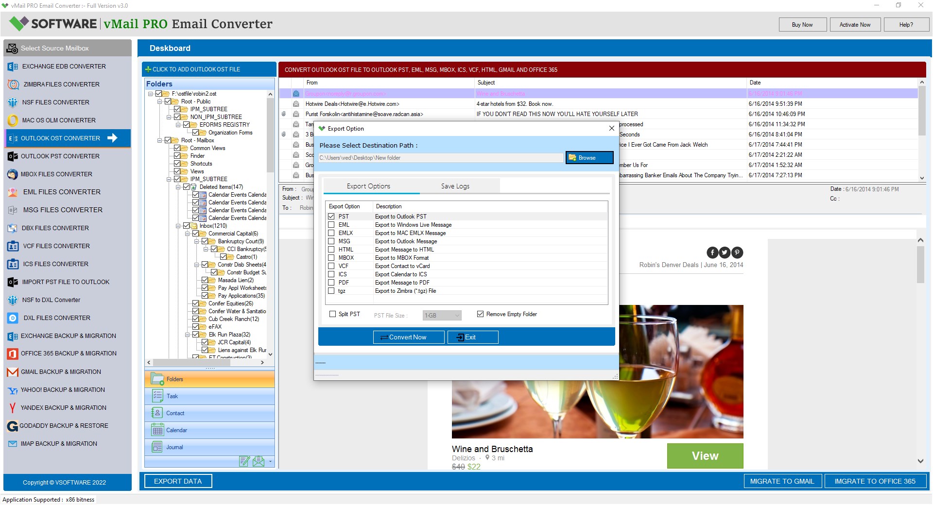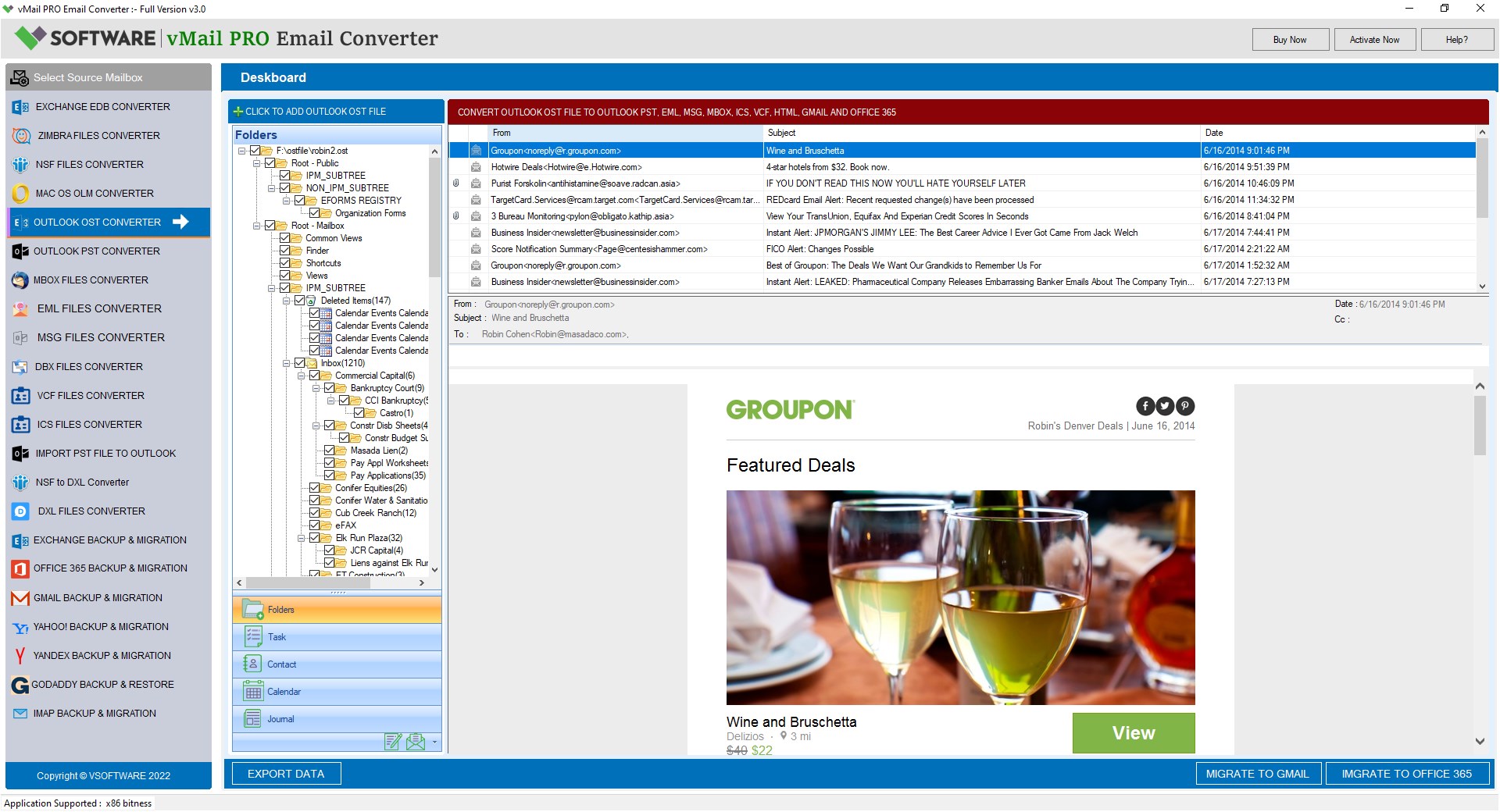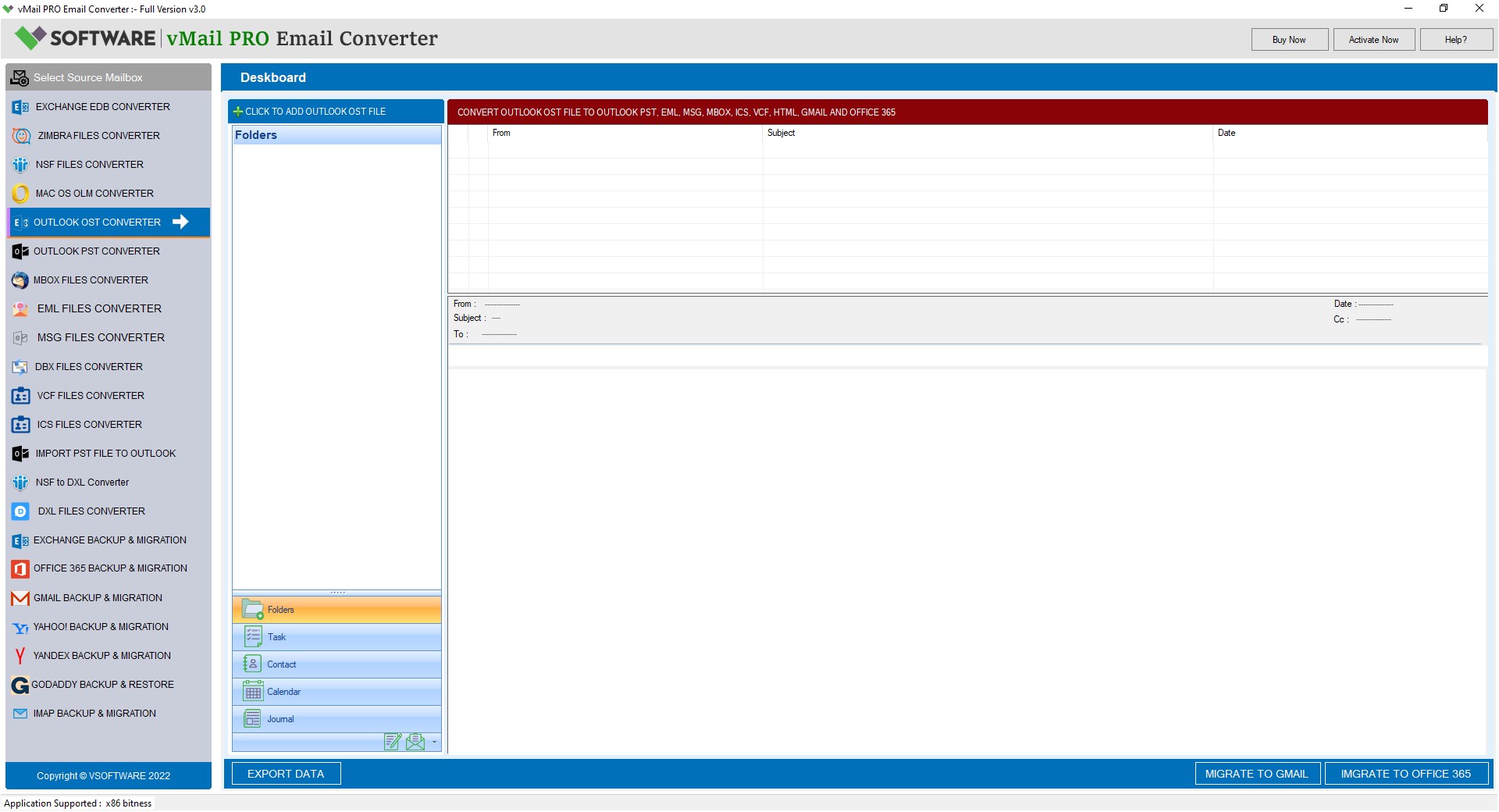 vMail Email Converter Software is an easy-to-use email converter which is helps you access emails, contacts, drafts, attachments, etc. of your inaccessible EDB File, OST file, PST File, OLM File, NSF File, Zimbra File, MBOX File, EML and MSG File & perform a smoothly converted into PST file & EML/MSG/MBOX Format. * Converted EDB to PST/EML/MSG and MBOX Format. * Recovery OST to PST/EML/MSG/ICS/card and MBOX Format. * Repair Outlook PST File into PST/EML/MSG/MBOX/PDF/NSF/Zimbra and card format. * Lotus Notes NSF to PST, EML, MSG and MBOX Format. * Any Email clients version of MBOX File Converted to PST/EML/MBOX and MSG Format. * Windows EML File Converted to PST, MSG and MBOX Format. * Outlook MSG File Converted to PST, EML, MSG and MBOX Format. * Cloud Migration Gmail, Yahoo Mail, IMAP and Office 365 Demo vMail Pro Email Converter Software is also converted 30 Items from Each folder to supported file format as Outlook PST, EML, MSG, MBOX, ICS and card format and without outlook installation on your machine. EDB to PST, OST to PST, EML to PST, NSF to PST, MBOX to PST, MSG to PST, OLM to PST, NSF to PST, Zimbra to PST, Zimbra to MBOX, OST to MBOX, OST to Gmail, OST to Office 365