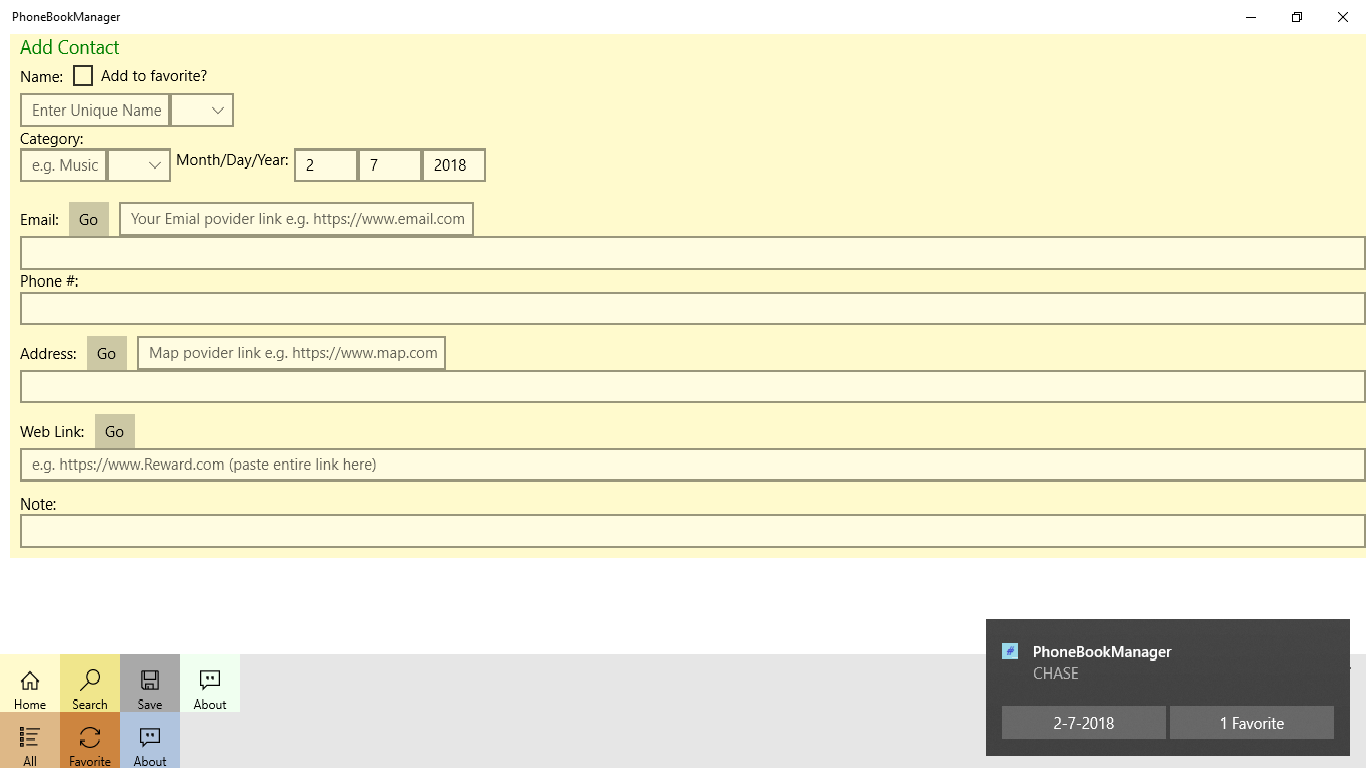 Help you to know your keep your own phone book. Bbuilt in Cortana voice commands including PhoneBookManager Show All and PhoneBookManager Show Favorite to show you the list. You will also get toast notification or live tile for your favorite contact you entered. Supporting Window 10 Universal Windows Platform (UWP).