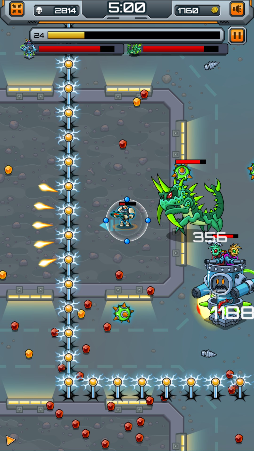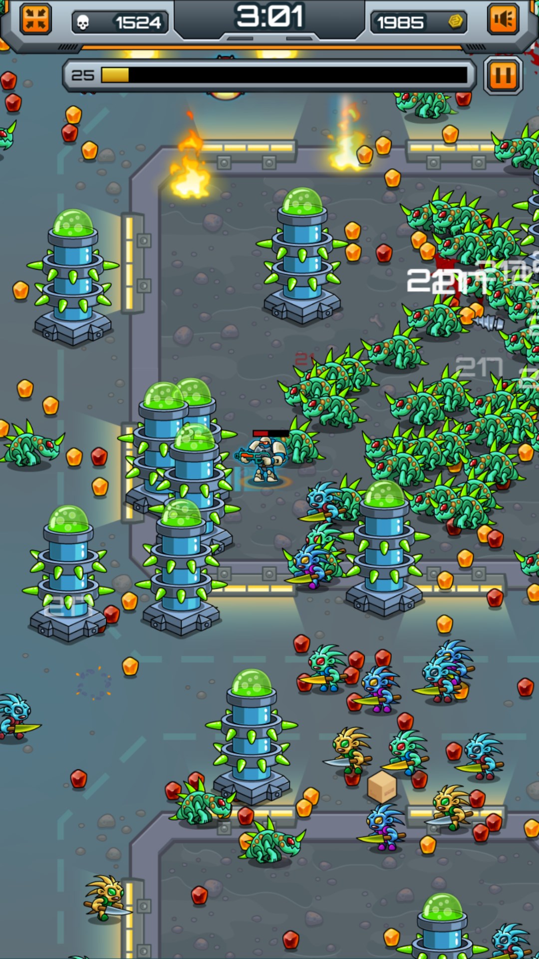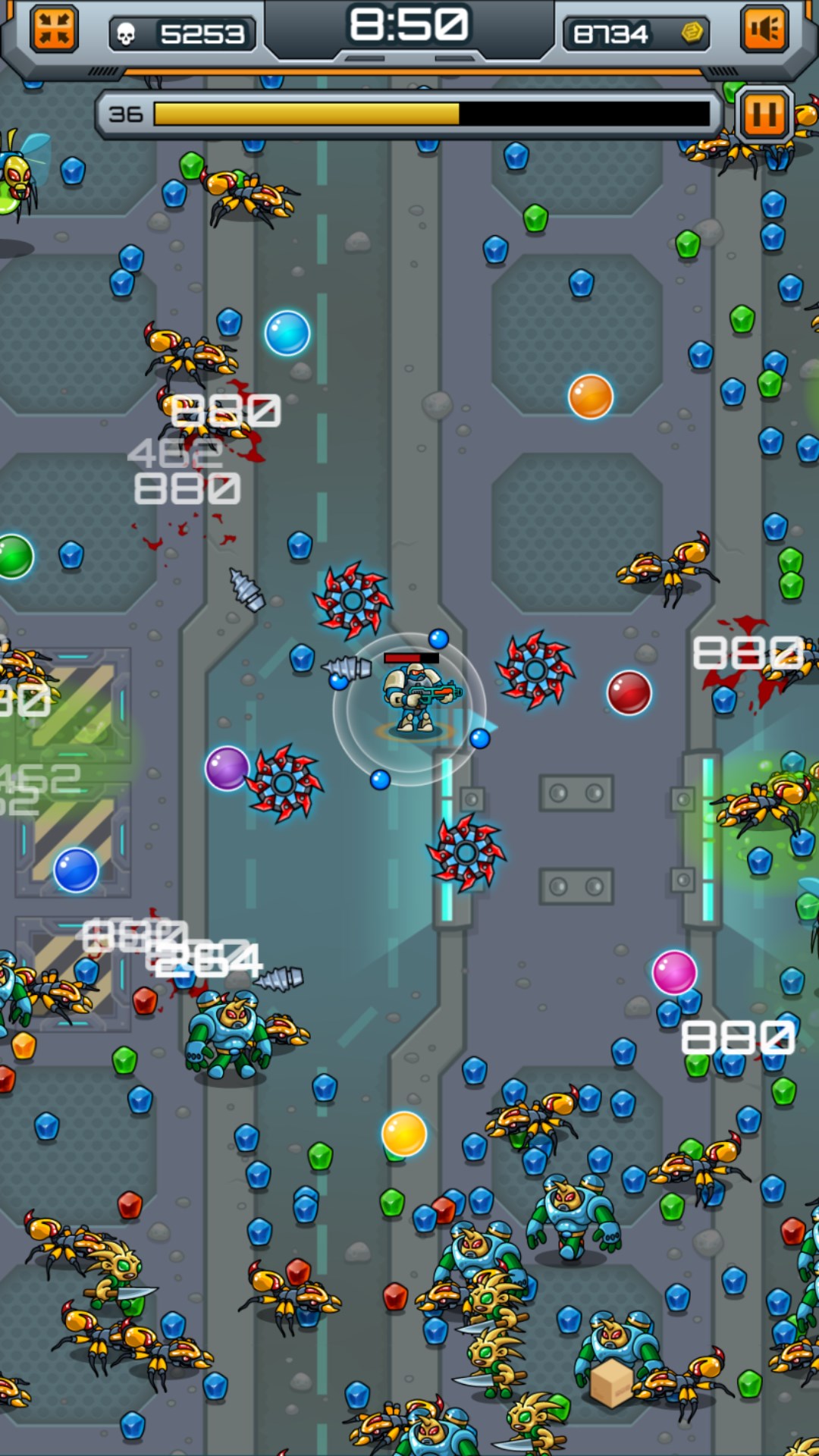 Move your character around on the screen to attack and defeat enemies. Make sure not to get hit when you pick up the gems dropped. Upgrade your weapons and abilities. Use the power-ups if you're in a tough spot.
