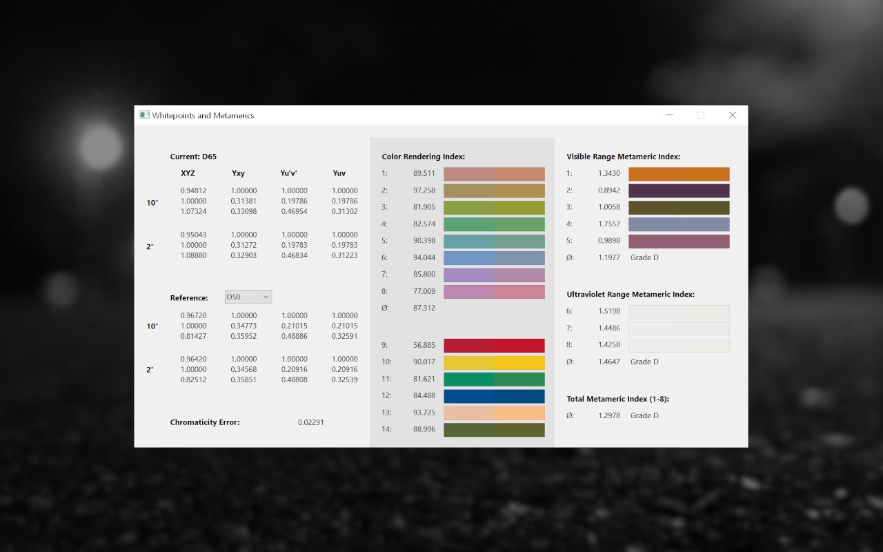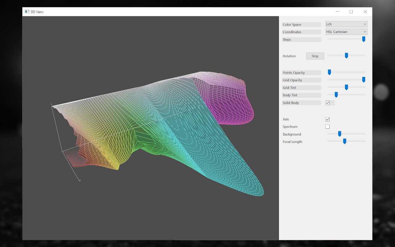 Colorspaces: XYZ, Yxy, Yuv, Yu\'v\', Luv, Lab, Lch, RGB, HSV, HSL, YCbCr.Observer: CIE 1931 2°, CIE 1964 10°, Judd 1951 2°, Judd Vos 1978 2°.Illumination: Arbitrary blackbody, CIE A, B, C, D (arbitrary or D50, D55, D65, D75, D93), E, F1 to F12, arbitrary whitepoint.RGB-Colorspaces: Adobe 98, Apple, Best, Beta, Bruce, CIE, ColorMatch, Don 4, EBU Monitor, EDI, Ekta Space PS5, HDTV, Rec. BT.601 (525 and 625), Rec. BT.709, Rec. BT.2020, Kodak DC, NTSC 53, PAL/SECAM Lab-Colorspaces: CIELAB (L*a*b* 1976), Hunter Lab (Original and whitepoint-adapted), arbitrary Adams-Chromatic-Valence spaces.3D-View: All colorspaces can be viewed in any other colorspace with 3 channels. Lch, HSV and HSL can additionally be viewed in a cartesian coordinate system.Metamerics and Illumination: Chromaticity error, Color rendering index, Visible range metameric index and UV range metameric index according to ISO 3664:2009 and ISO 23603:2005 with reference illuminaAll computations of this application are based on the Color Machine Library (CML).