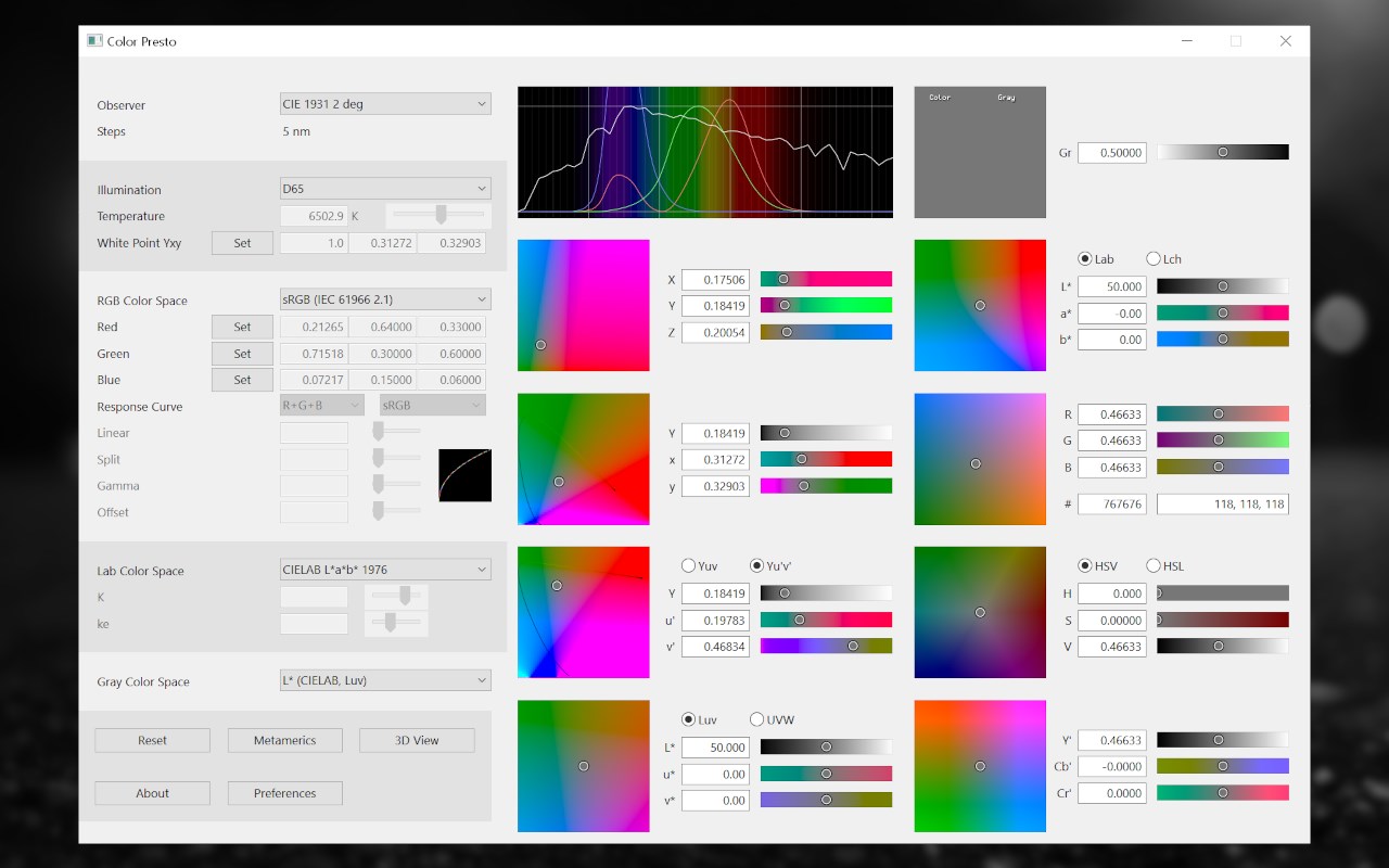 Color Presto allows you to visualize colorspaces in 2D and 3D and computes colorimetric values such as the color rendering index or metameric index.