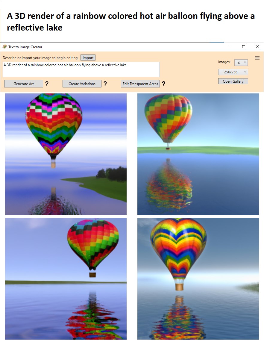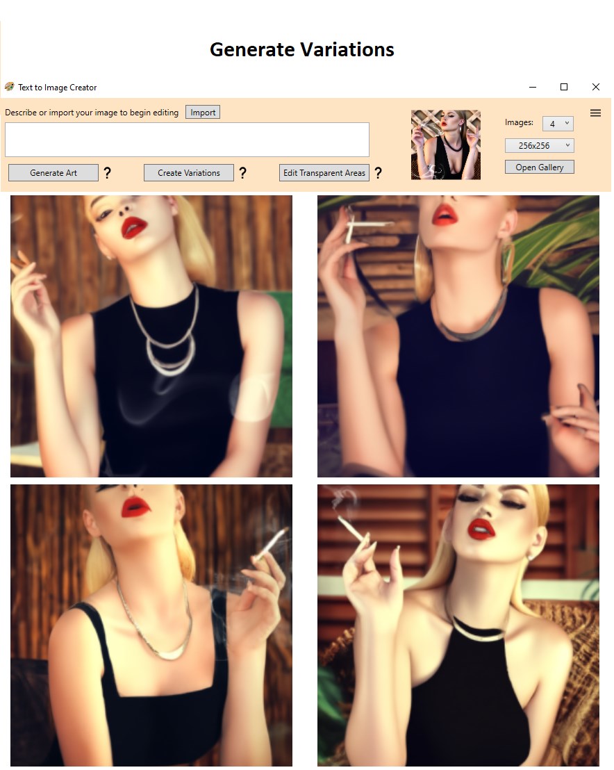 DALL-E API integrationUser-friendly interfaceCustomizable images 256x256 - 512x512 - 1024x1024Cloud-based processingSave all created images to your galleryCreate up to 4 images per requestCreate variations of input image Edit transparent areas of input imageimage edit tools like erasing, drawing, cropping, resizing, adding text, and many more