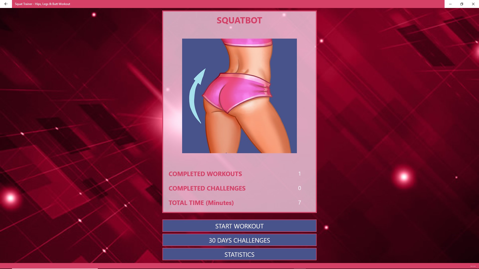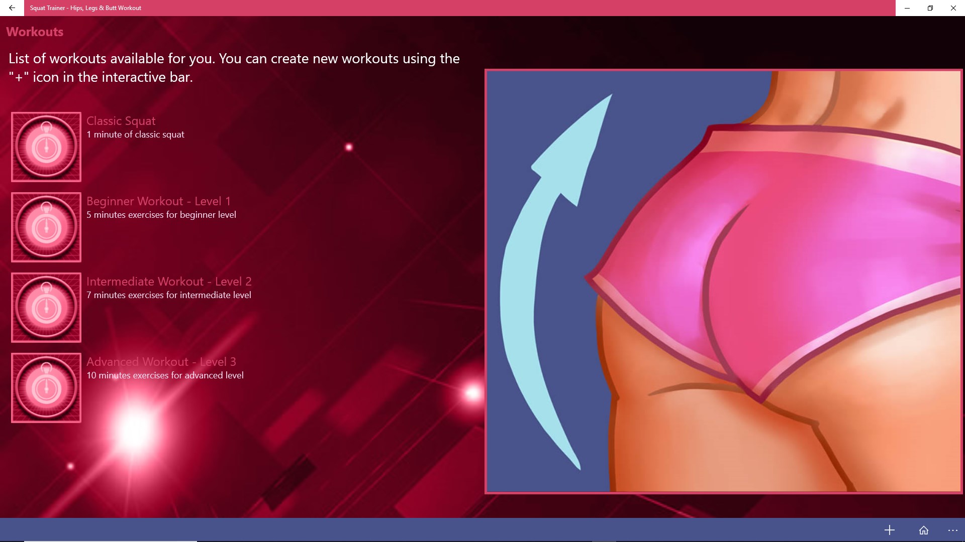 Squat Trainer contains a set of different butt workout, hips and legs exercises which will help you to get a perfect body.