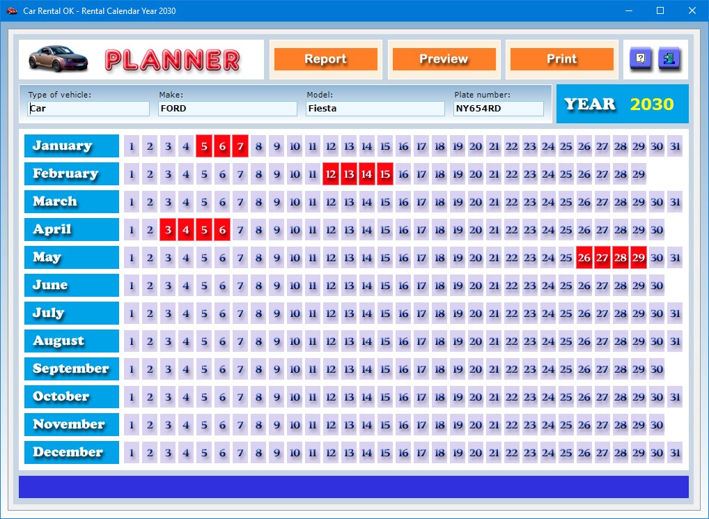 The Report button allows you to get and print out the list of all vehicle bookings stored in the annual planner in chronological order, showing the rental reservation days followed by the names of the clients. The vehicle reservation calendar can be previewed or printed on paper.