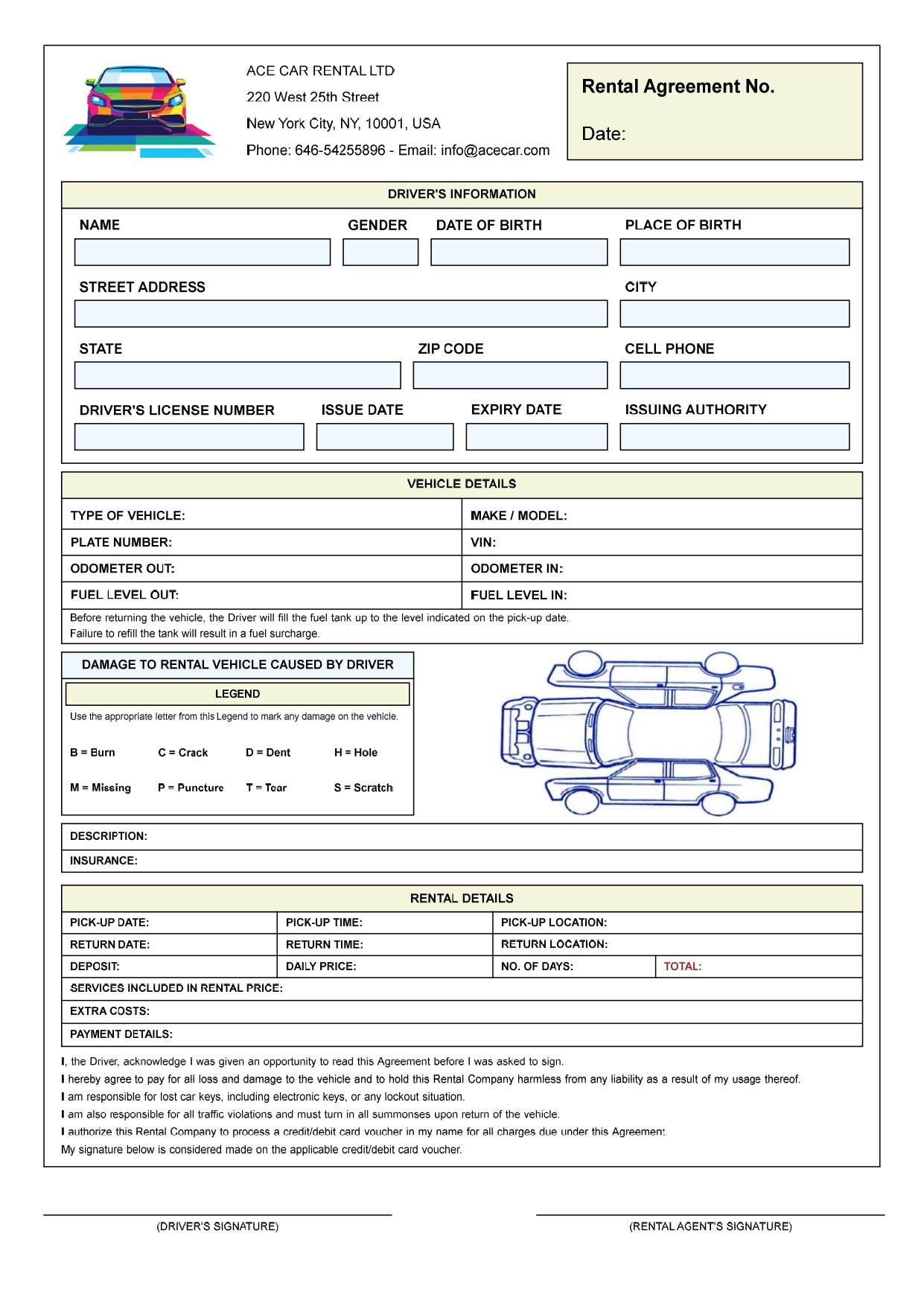 At the bottom of the Rental Agreement, the driver acknowledges he was given an opportunity to read the Agreement before he was asked to sign. He agrees to pay for all loss and damage to the vehicle and to hold the rental company harmless from any liability as a result of his usage thereof. He agrees to be held responsible for lost car keys, including electronic keys, or any lockout situation. He recognizes he is also responsible for all traffic violations and pledges to turn in all summonses upon return of the vehicle. He authorizes the rental company to process a credit/debit card voucher in his name for all charges due under the Agreement. Finally, he states that his signature is considered made on the applicable credit/debit card voucher.