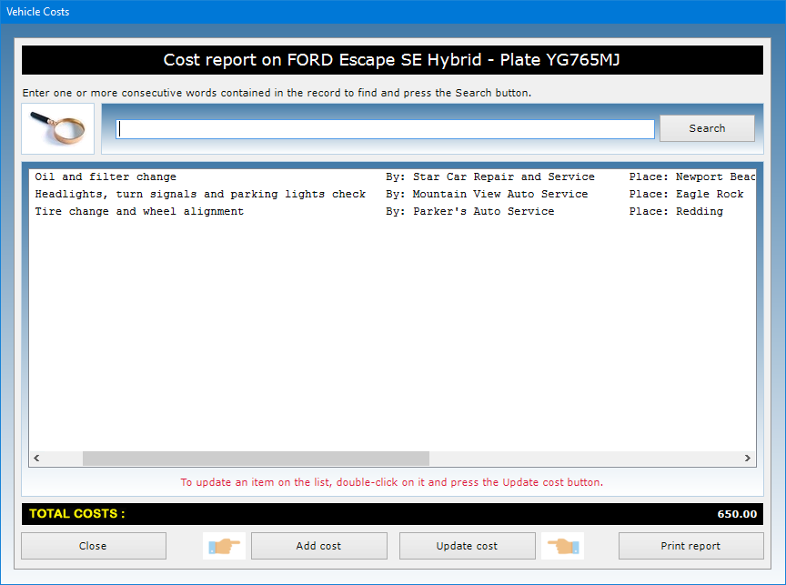 After saving the record, pressing the Vehicle Costs button gives you access to a window where you can list and print all of the costs incurred for the vehicle. For each cost you must indicate the date, the type of service (e.g. maintenance, repair, refueling etc.), the service provider (e.g. garage, auto electrical workshop, gas station etc.), the place where the service was provided, and the amount paid. At the bottom of the list is the total amount of costs incurred over the life of the vehicle.