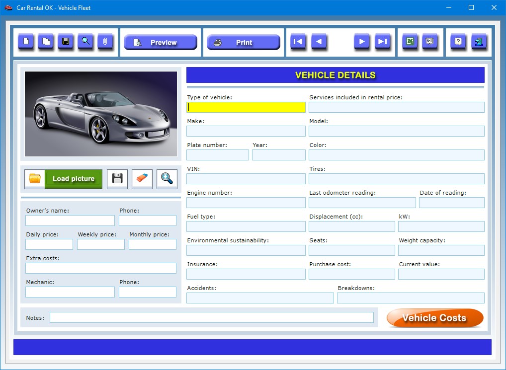 But the information you can record does not end there, as you can also add your last odometer reading and the day it was taken, the services included in the rental price, any extra costs incurred by the driver who hired the car, the daily, weekly and monthly rental rate, the name and phone number of the owner of the vehicle and, finally, the mechanic who normally takes care of the vehicle in your rental company's trusted garage. The vehicle data can be imported into the Rental Agreements to allow you to fill out the text boxes faster.