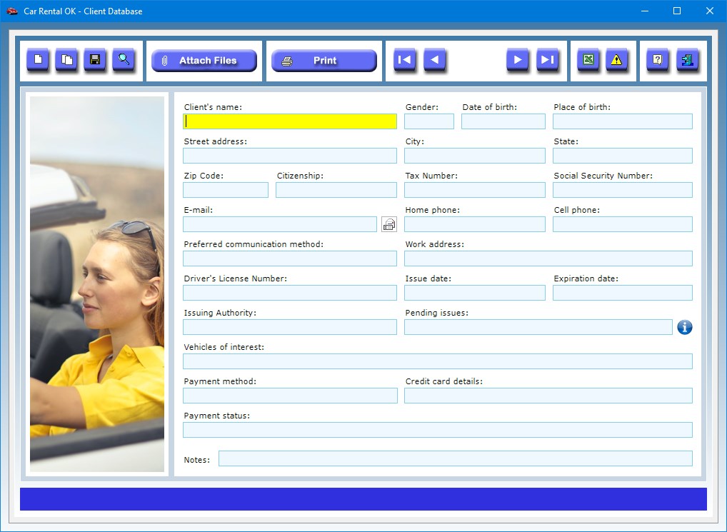 By using the Attach Files button you can attach documents of any kind to the record of each client (for example, a copy of their driving license).