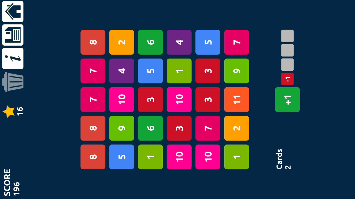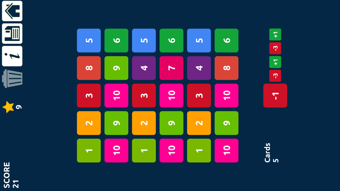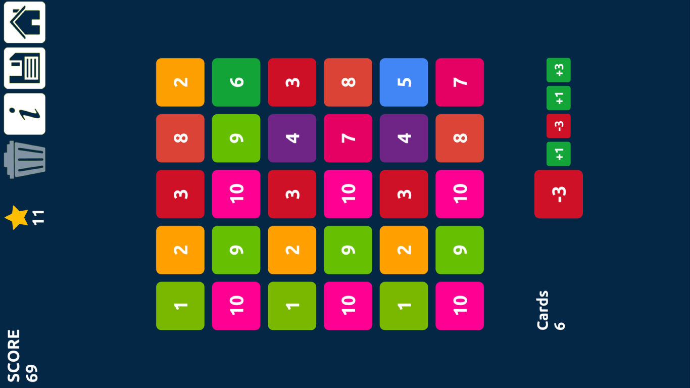 First, You have 5 cards. Every match gives you 1 new card. The value of each card is selected randomly from the list [+1, +2, +3, -1, -2, -3].