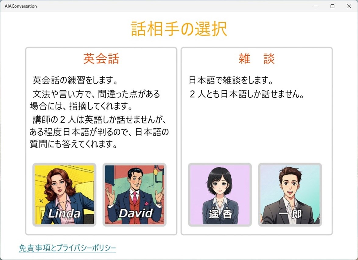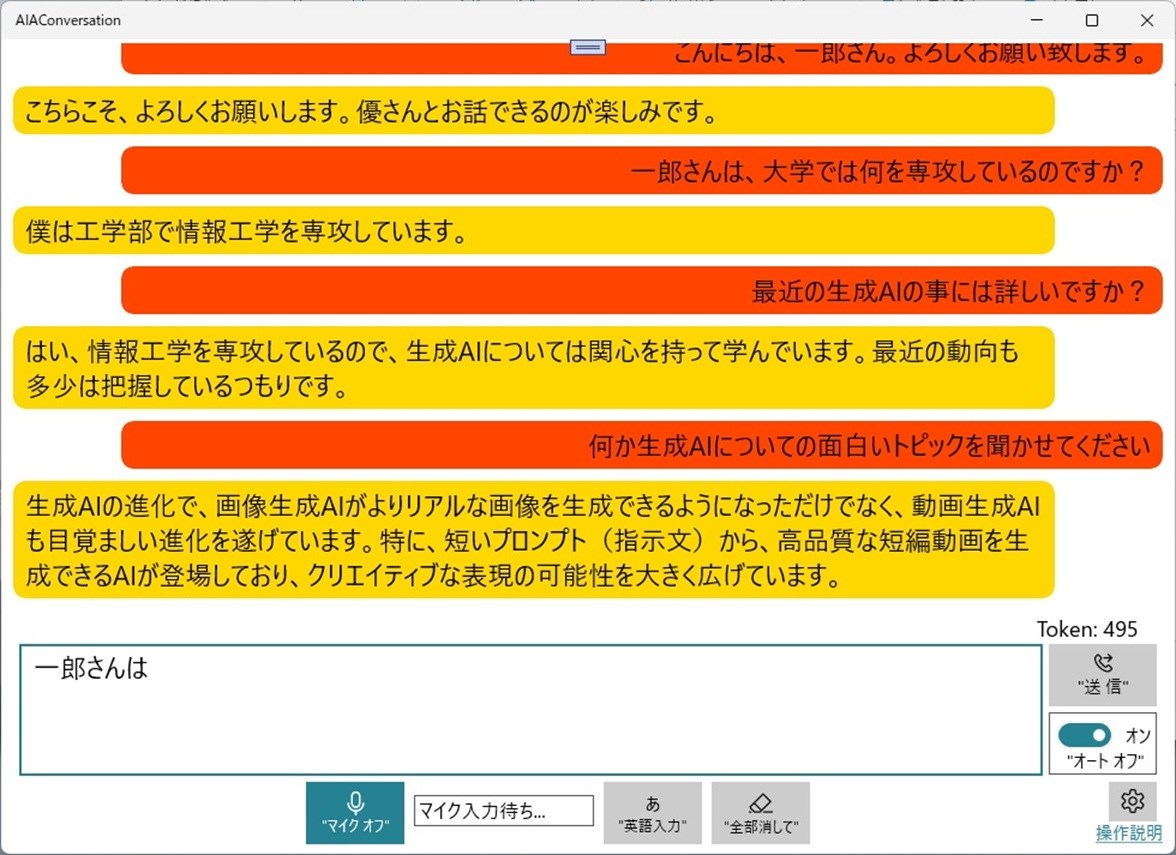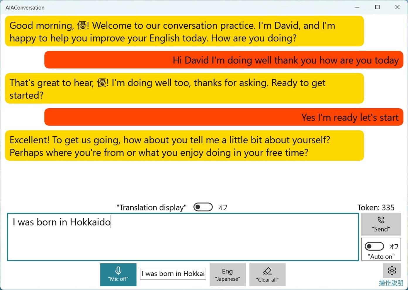特徴として、会話の音声関連の処理はWindowsOSの機能を利用し、AIの作業は単純なチャット機能とする事で、無料の範囲でAIを用いた英会話の練習を行う事ができます。