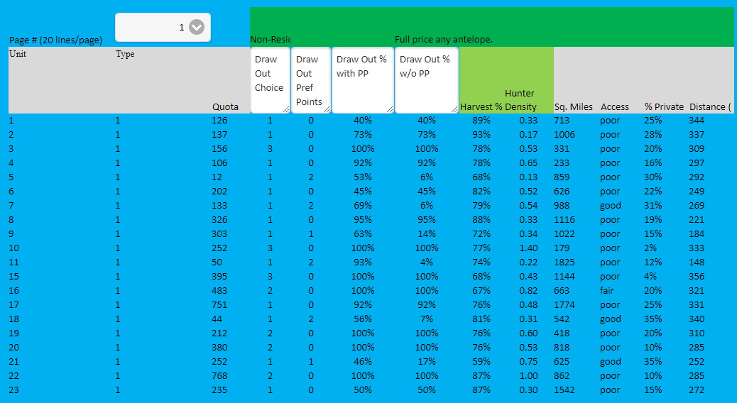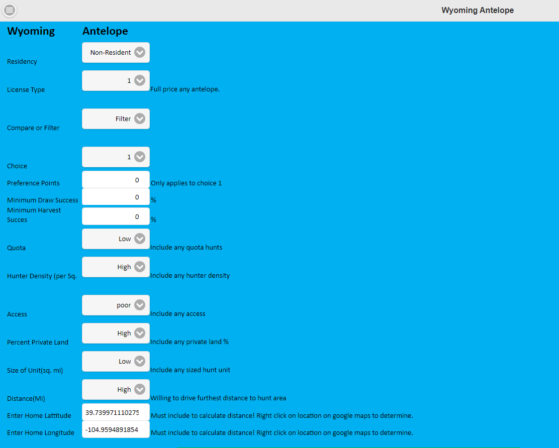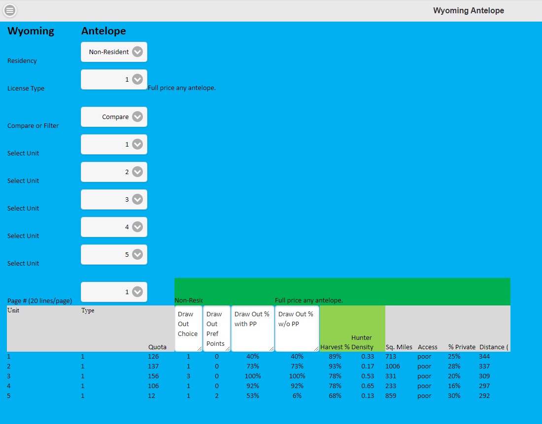 Wyoming Antelope Draw enables you to conquer the dismal challenge of selecting hunt codes from hundreds of choices in Wyoming. This tool matches up statistics from Drawing Odds and Harvest Success Rates along with GMU specific information to give you the best chance at drawing and harvesting an antelope this year. The tool offers many selection criteria from residency to minimum draw percent to minimum harvest percent based on current Dept of Wildlife Information. It also allow you to choose unit specific information such as % private land, access, and commute distance. Plus lots more. This tool will help you make the hunt code decisions that will make you successful this year. Made by hunters for hunters.