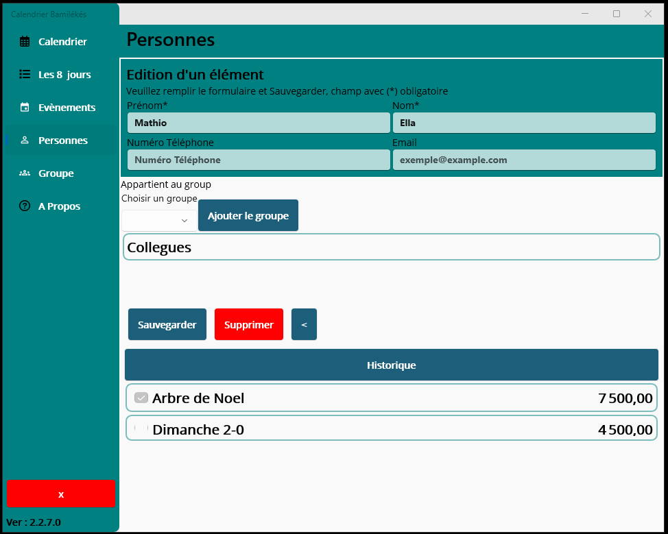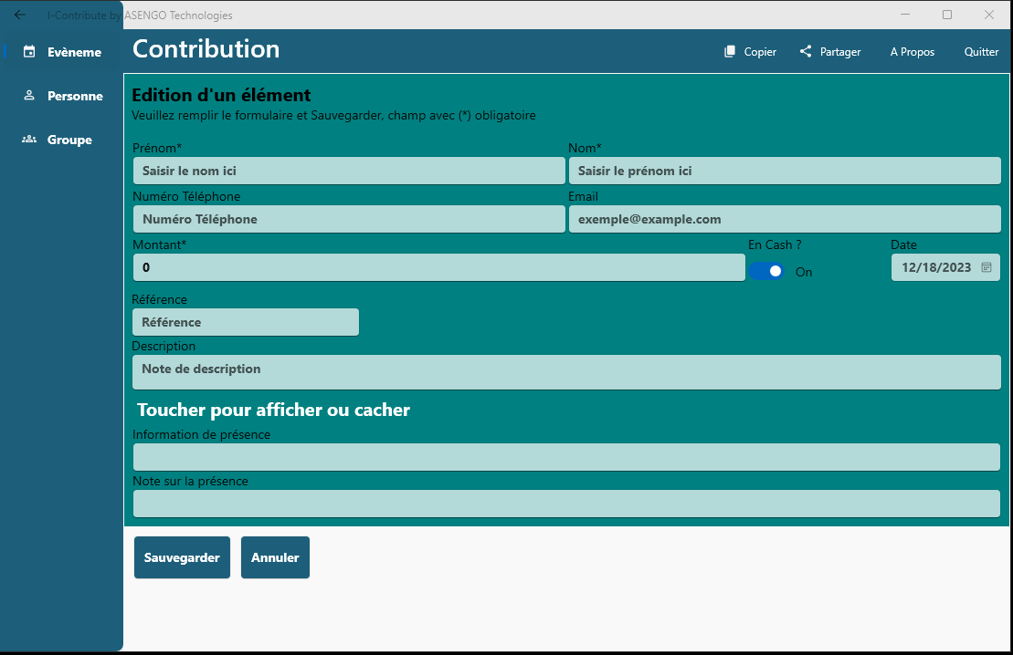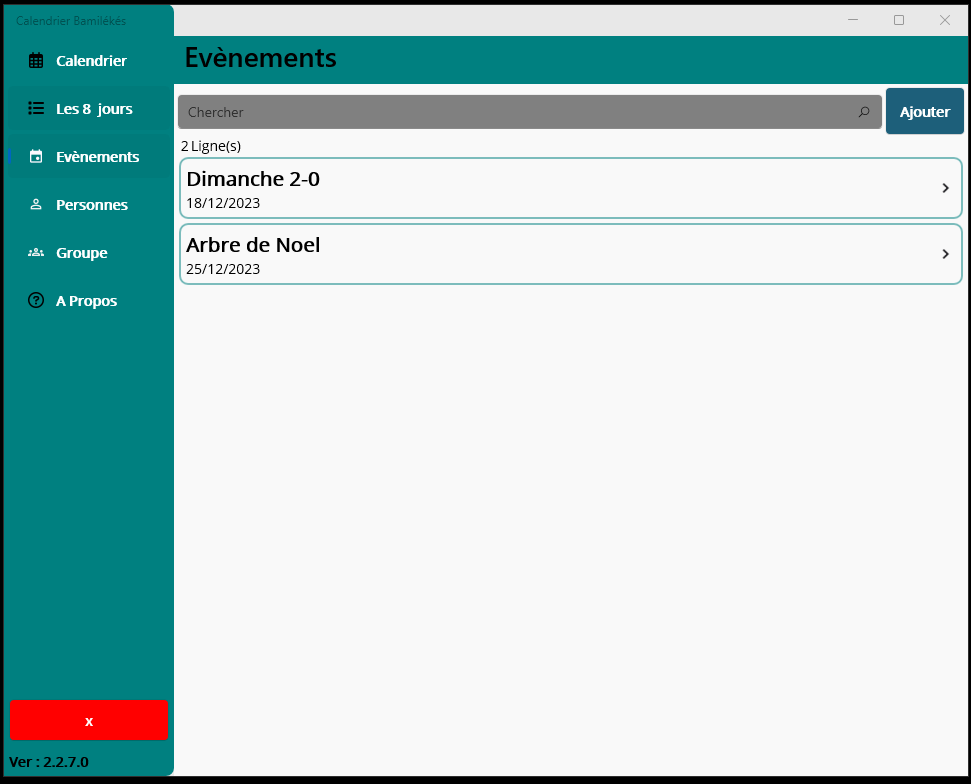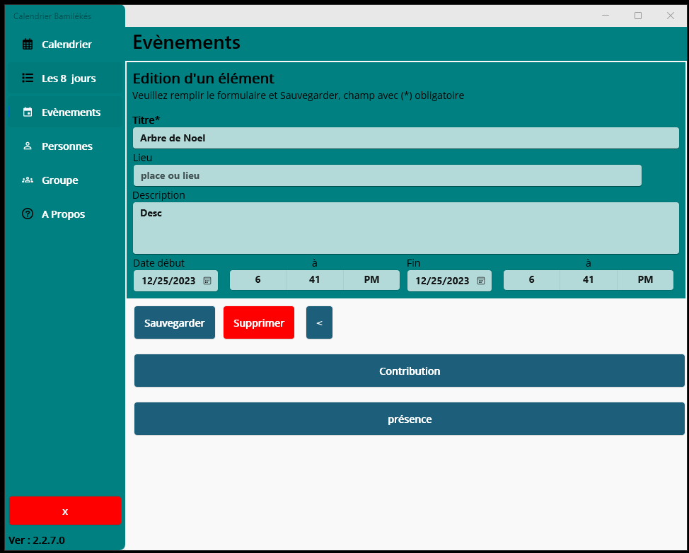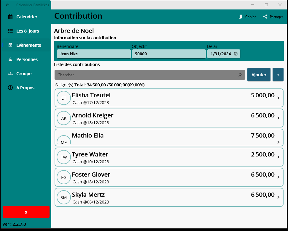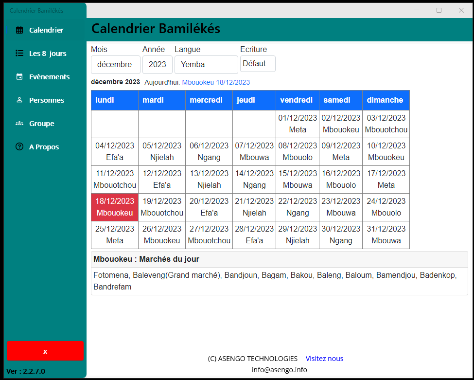Baloum, Fondjomekwet, Bamena, Deunkouop/Bandenkop, Bangou, Bangoua, Bapa, Ngombale, Batchingou, Fotouni, BatoufamBafung, Fefe, Ghomala, Gomba, Medumba, Mengaka, Nguemba, Nguimba , Yemba,Memorizes the language selected for the next timeEvent creationsCreate different group of contributorsHistory of donations of a contributorCreate a contributor and assign to a groupCheck-in contributors, Nda\'Nda, Fussep, Bahouan.