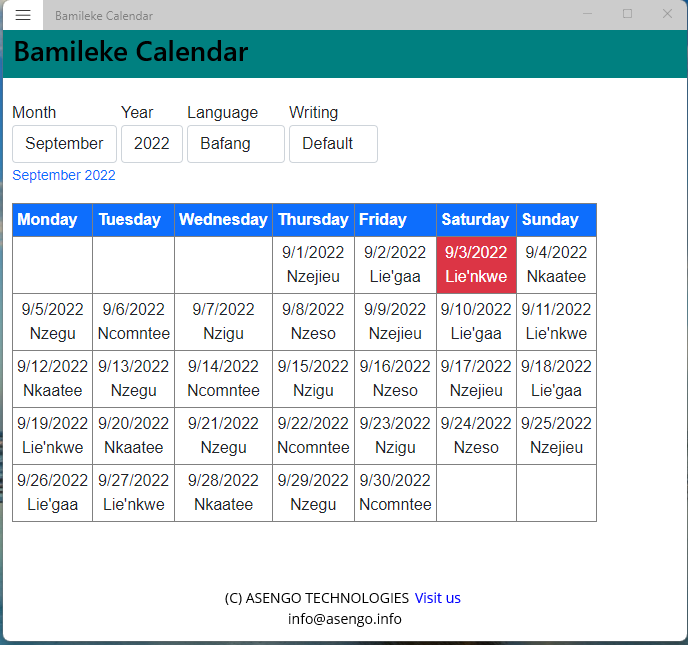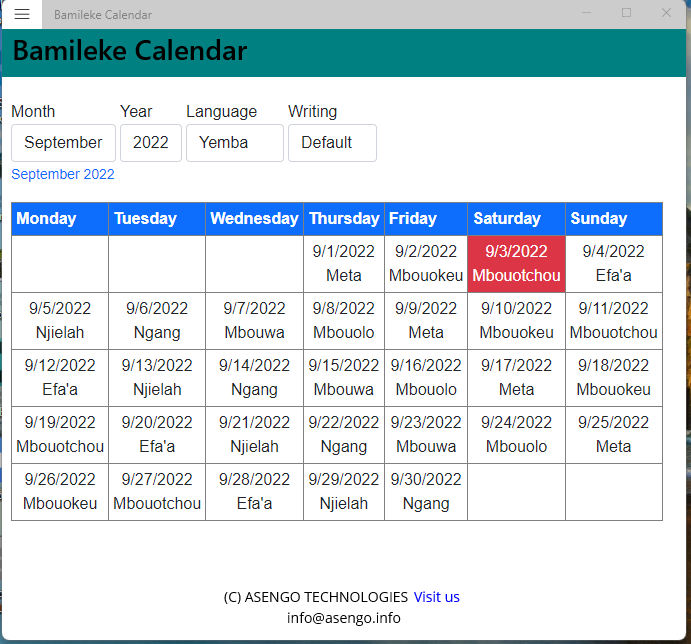 Bamileke Calendar is a standalone application; it displays the days of a bamileke language in the commonly used Greece calendar.