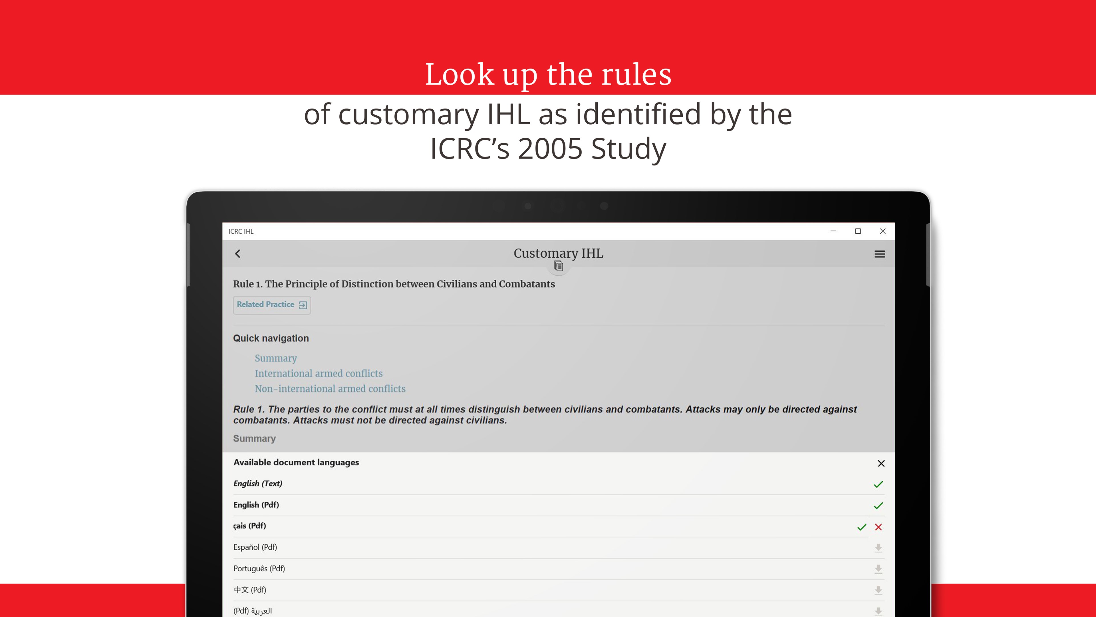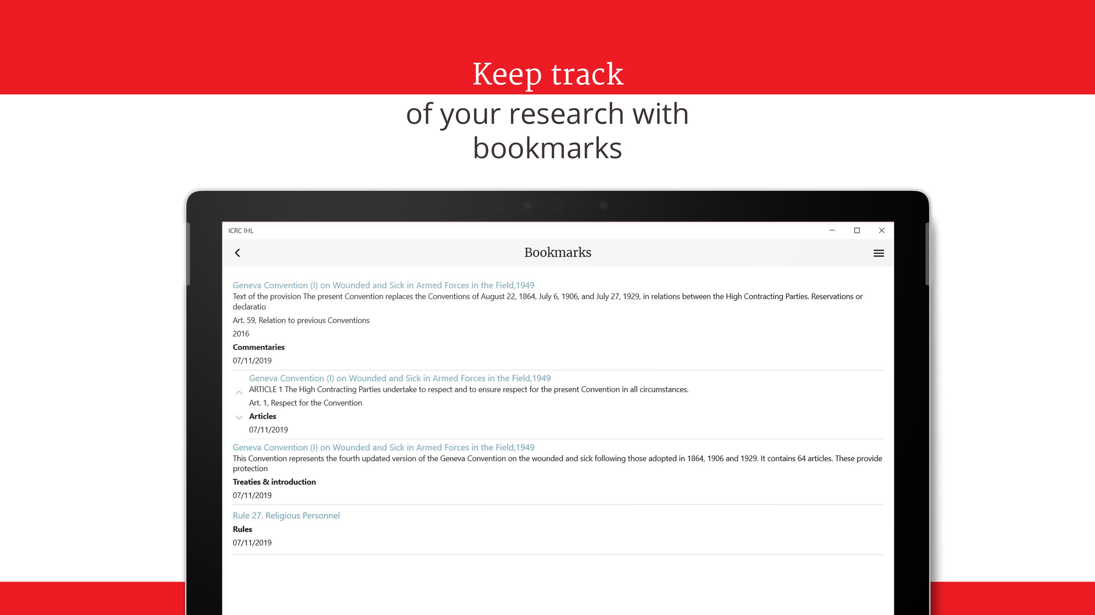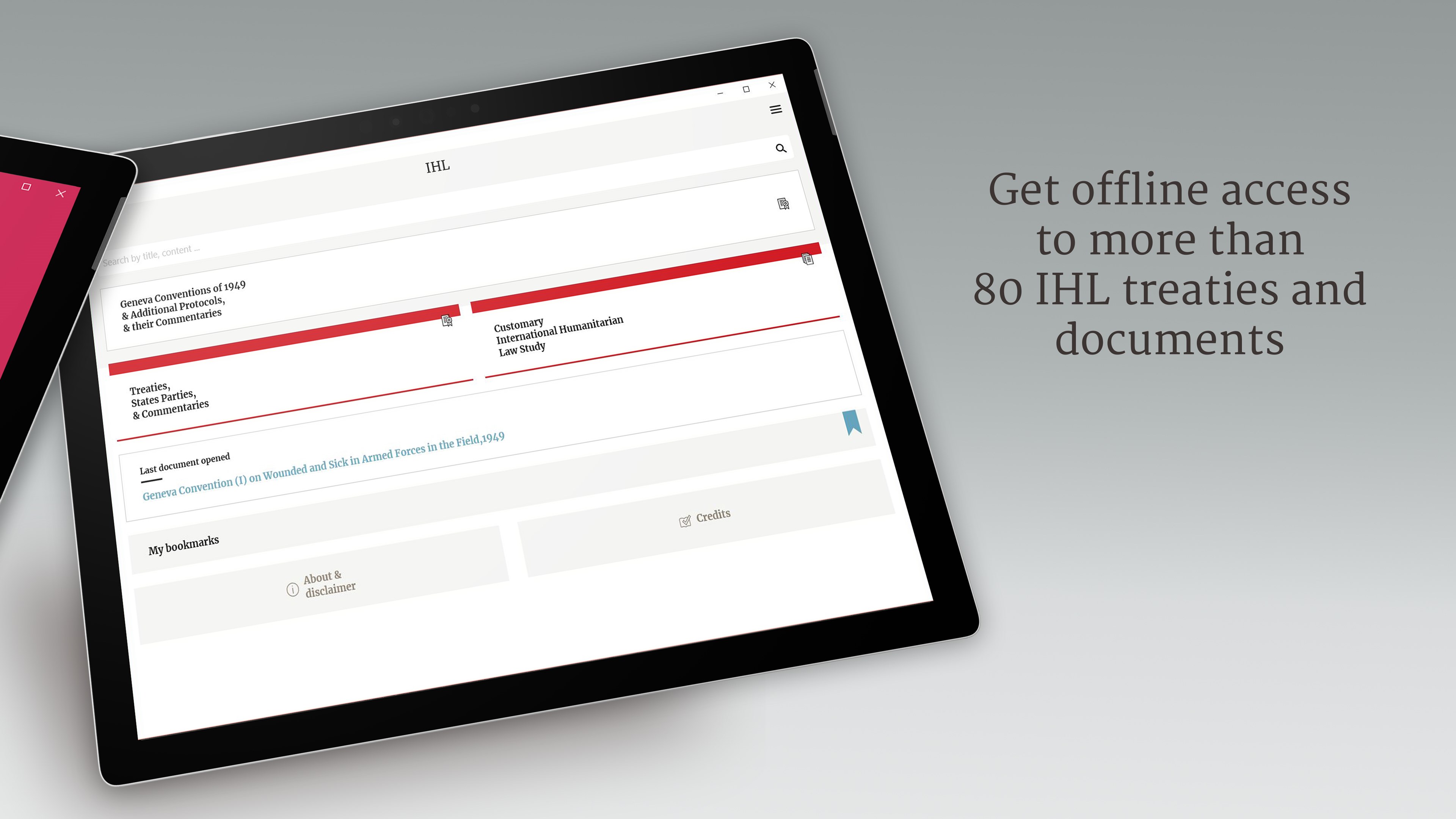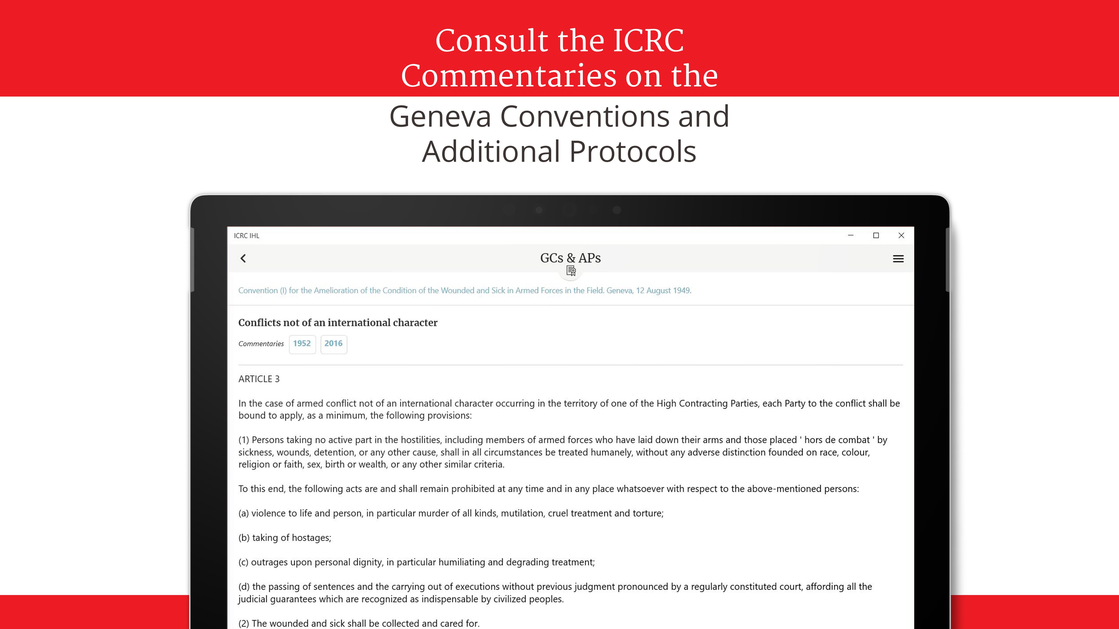 A reference app for international humanitarian law (IHL)Get offline access to more than 80 IHL treaties and documentsConsult the ICRC Commentaries on the Geneva Conventions and Additional ProtocolsFind out more about treaties and States PartiesLook up the rules of customary IHL as identified by the ICRC\'s 2005 StudyFind what you need quickly using filtersChoose from Arabic, Chinese, English, French, Keep track of your research with bookmarks