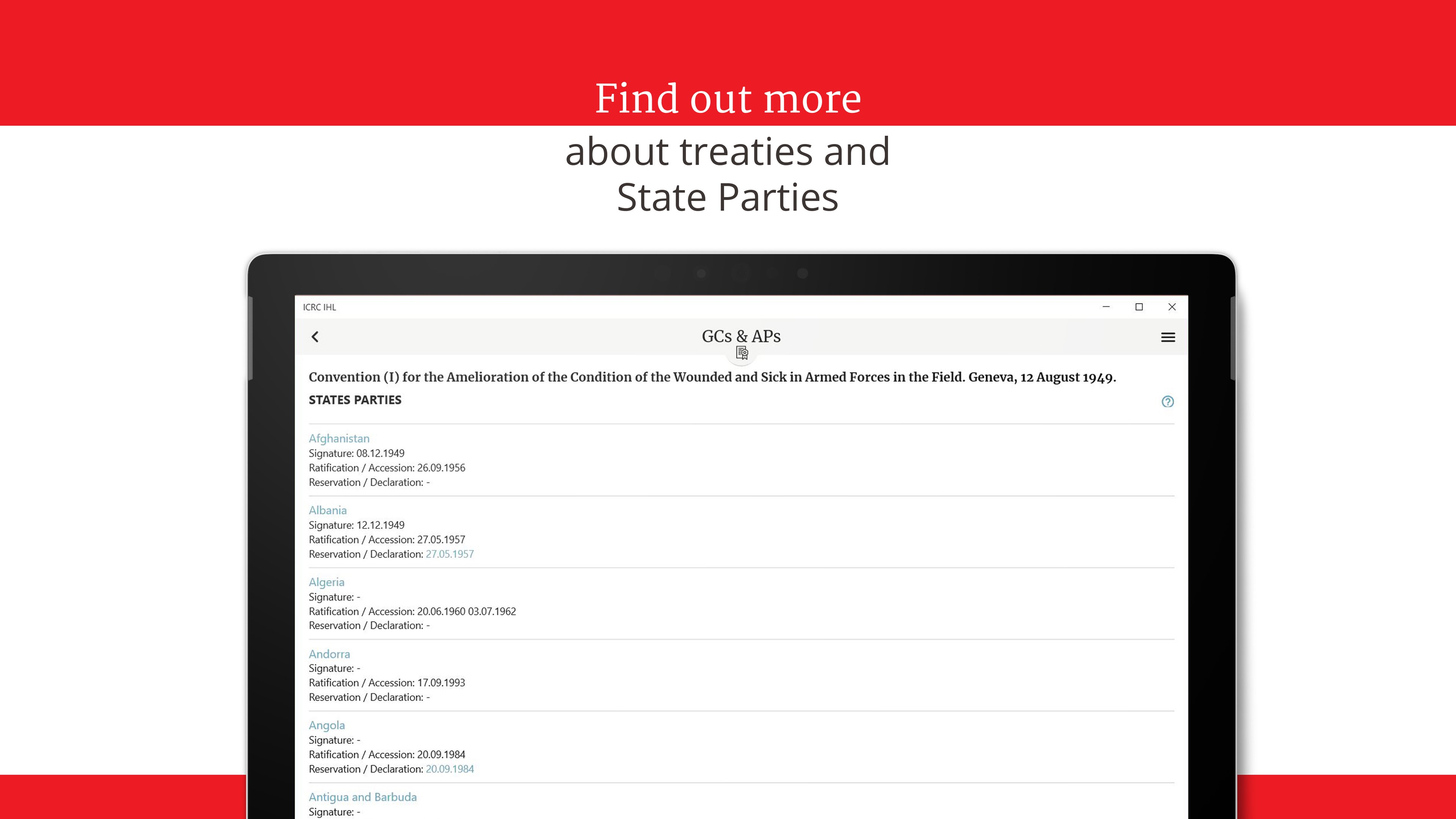 The section on IHL treaties is divided by topic and States Parties. Each treaty has a home page with an introduction; specific articles can be accessed from this page. The Geneva Conventions and their Additional Protocols are accompanied by the ICRC’s original and updated Commentaries. The various articles of each treaty can be consulted by swiping from right to left and from left to right. Tapping on “About this text” gives users access to general information about a treaty. Tapping on “States Parties” – on the top left of the page – lets users see the list of States party to that treaty, along with the dates of signature and ratification/accession, and the dates of any texts of declaration/reservation. Tapping on the name of a State redirects users to a list of all the treaties in force for that State. By tapping on “States Signatories” – on the top right of the page – users can see the list of States Signatories for each treaty, along with the dates of signature; tapping on the name of a particular State, they can also see all the treaties ratified by it.