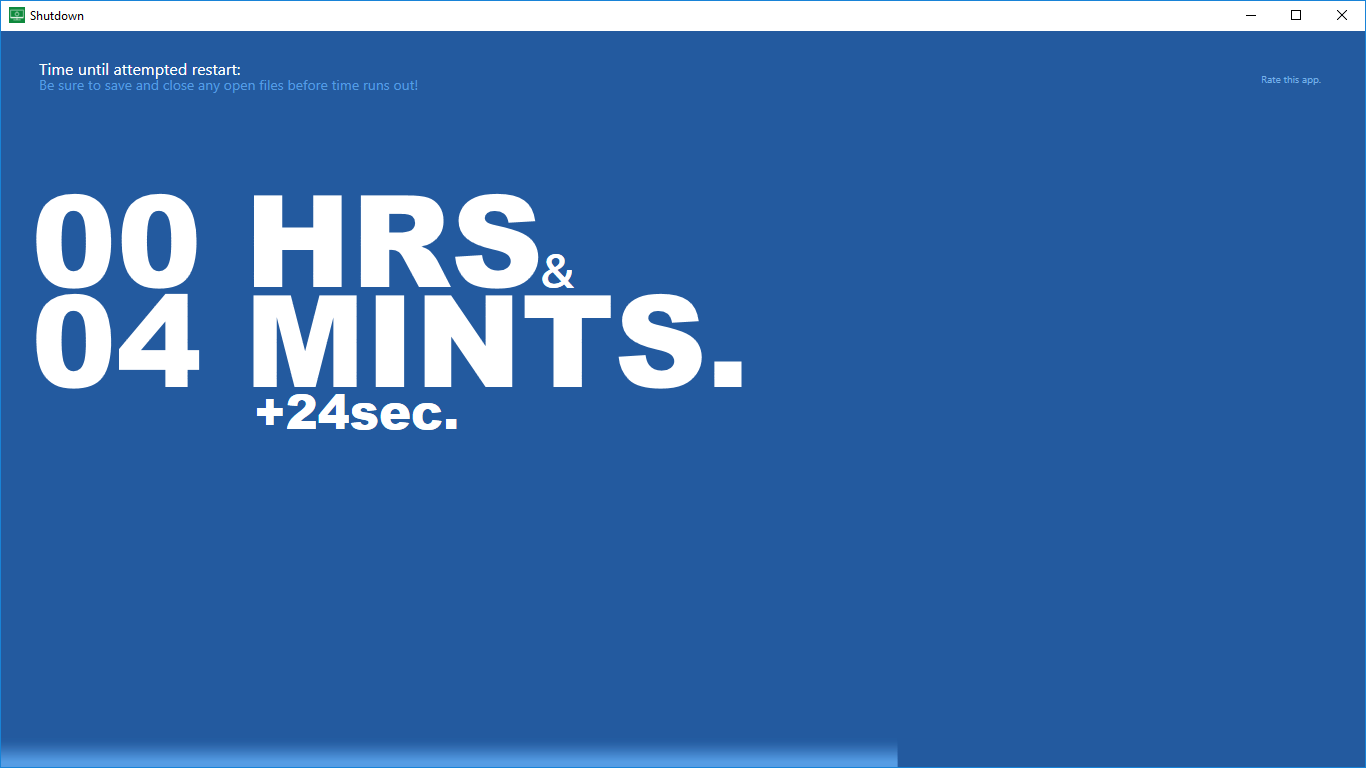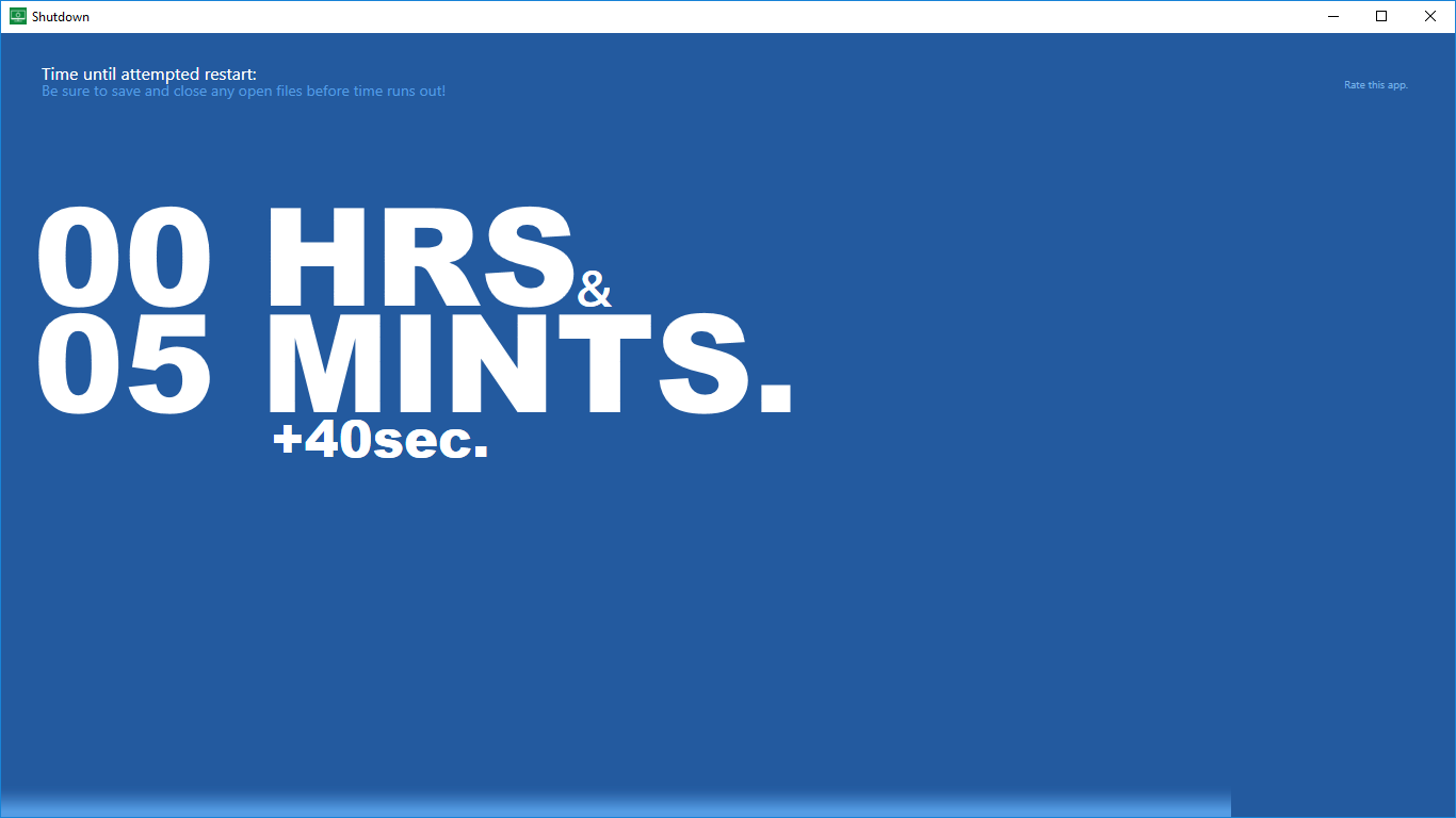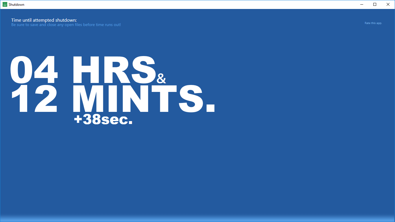 Automatically shut down your computer after a certain time has passedShutdown is a super tiny app: just a bit of memory and storage is sufficient to automatically shut down your system!No administrator privileges needed (though your user needs sufficient \'standard\' rights to shut down the computer)Easy to use and understandNo need to use a keyboard!What you see is what you get, no further in-app purchases!No advertisements!Choose between shutdown, restart or sleep functionality