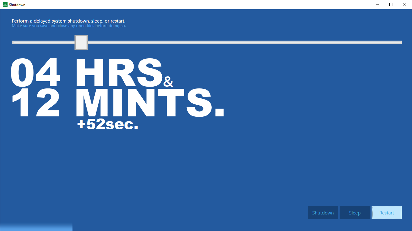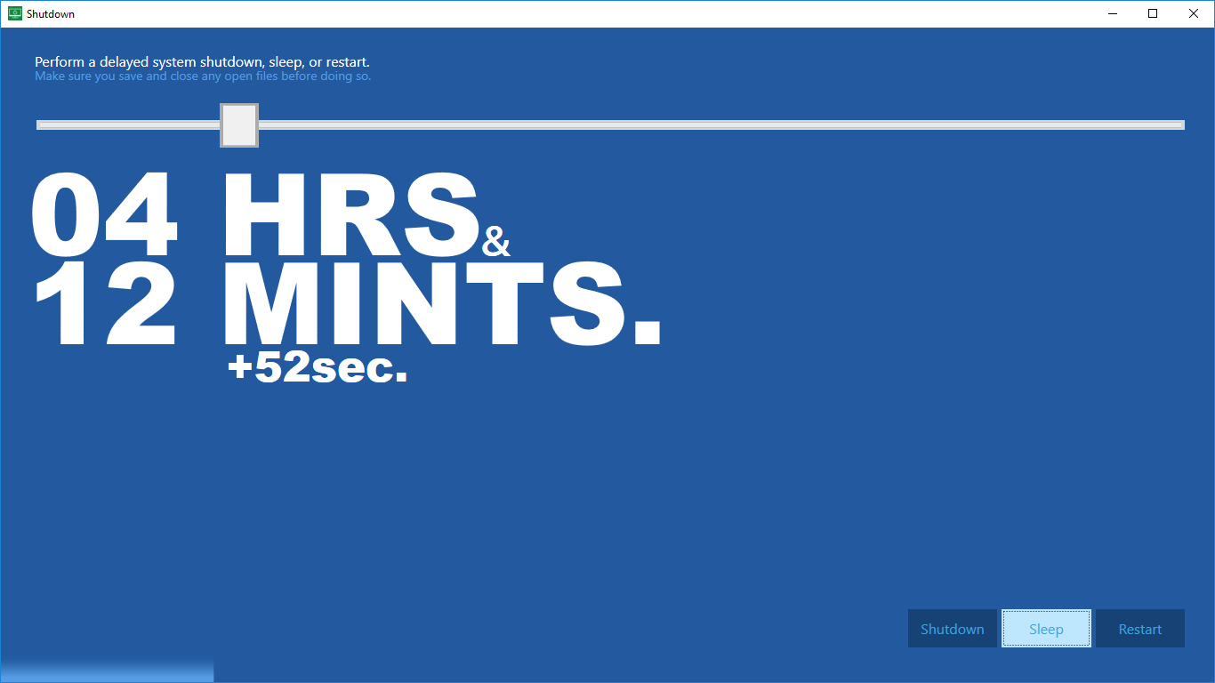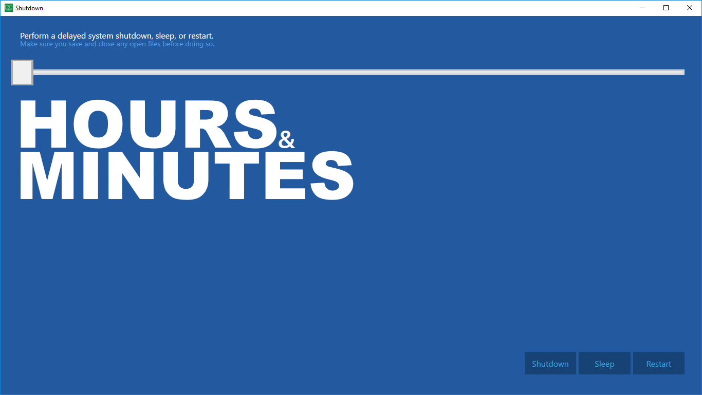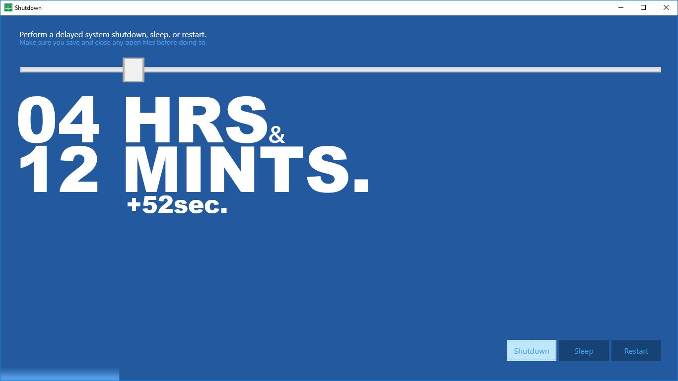 Automatically shut down your computer after a certain time has passedShutdown is a super tiny app: just a bit of memory and storage is sufficient to automatically shut down your system!No administrator privileges needed (though your user needs sufficient \'standard\' rights to shut down the computer)Easy to use and understandNo need to use a keyboard!What you see is what you get, no further in-app purchases!No advertisements!Choose between shutdown, restart or sleep functionality