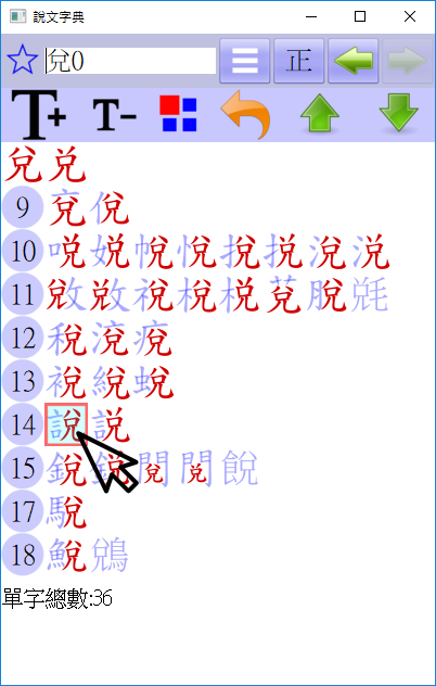 根據輸入的〔偏旁組合〕,在單字的〔字形〕中顯示高亮度的顏色,突顯出偏旁的位置。