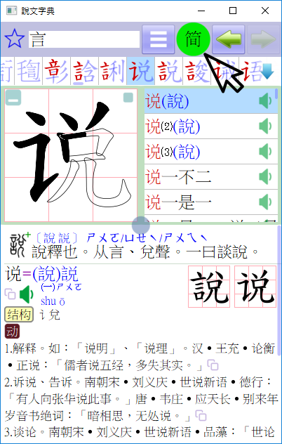 可同時輸入〔簡繁〕字詞,〔字形檢索、詞彙檢索〕皆適用。也可隨時按下〔簡〕的按鈕,每個窗口都會切換字體,不會中斷任何操作狀態。