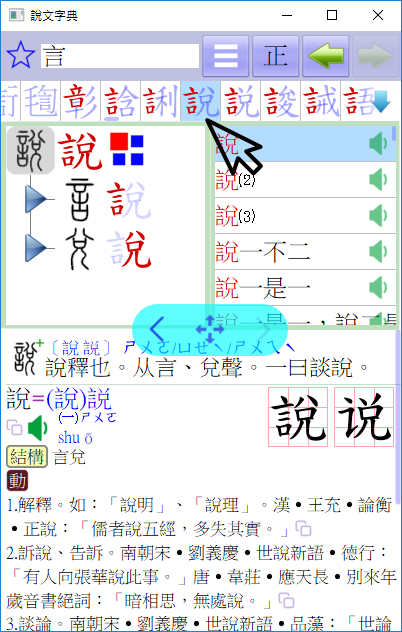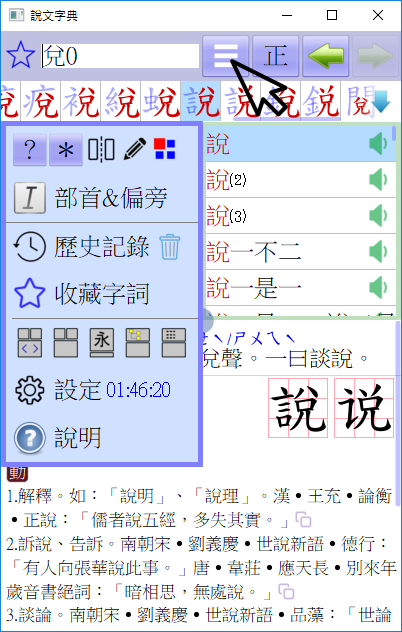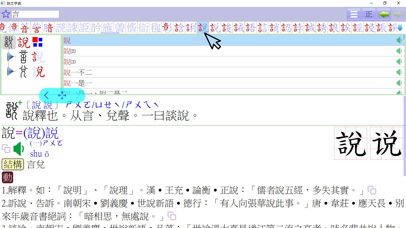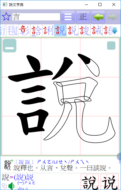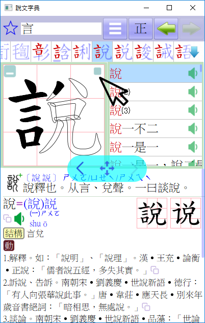 採用〔樹狀架構〕詳細解析單字的字形結構,同時列出〔小篆〕與〔楷書〕互相比對,還可打開每一層來觀察偏旁的位置及解析筆畫的變化,並且關連到〔詞彙列表〕,一個〔點選〕動作即可查看相關的解釋,省去繁瑣的查詢過程,提升學習的效率。