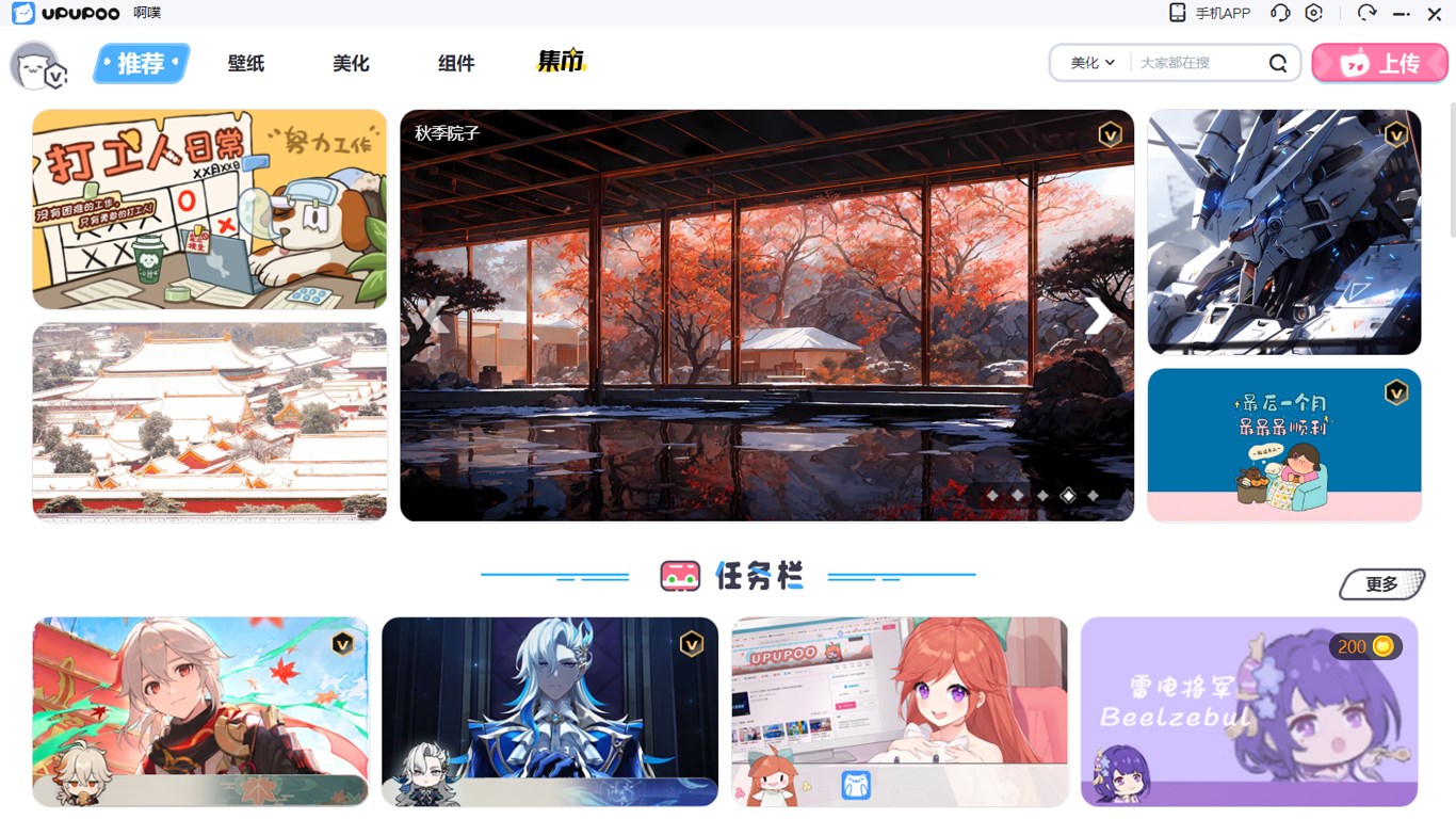 UPUPOO动态壁纸是一款电脑美化软件。 UPUPOO拥有超多高清视频、图片壁纸资源,支持网页交互壁纸,满足各种壁纸幻想。除壁纸外,还有实用组件和系统美化功能。