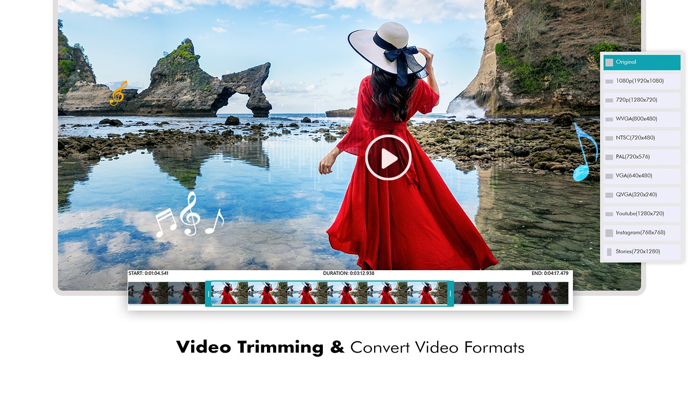 * Music - You can add/remove background music to/from your video, select music file provided in the list or pick your music file.
