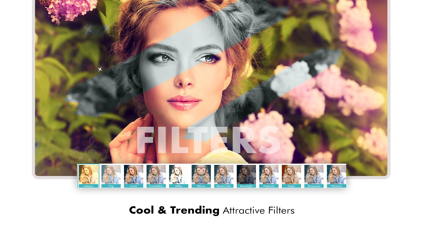* Filter - Add various effects on photo such as antique, sepia, black and white, hue, light, exposure, and many more.