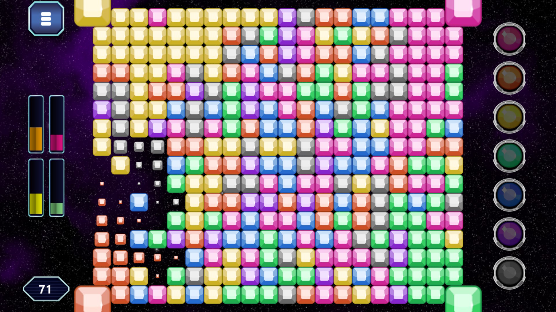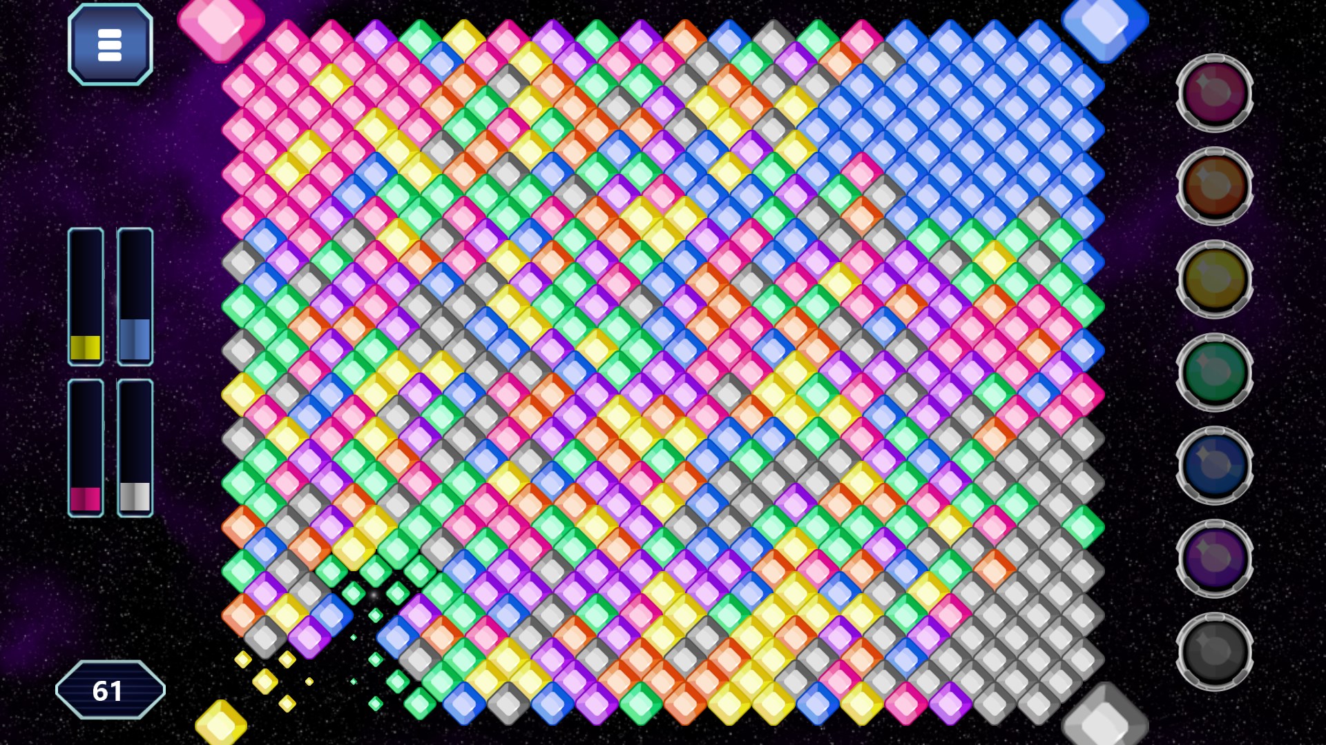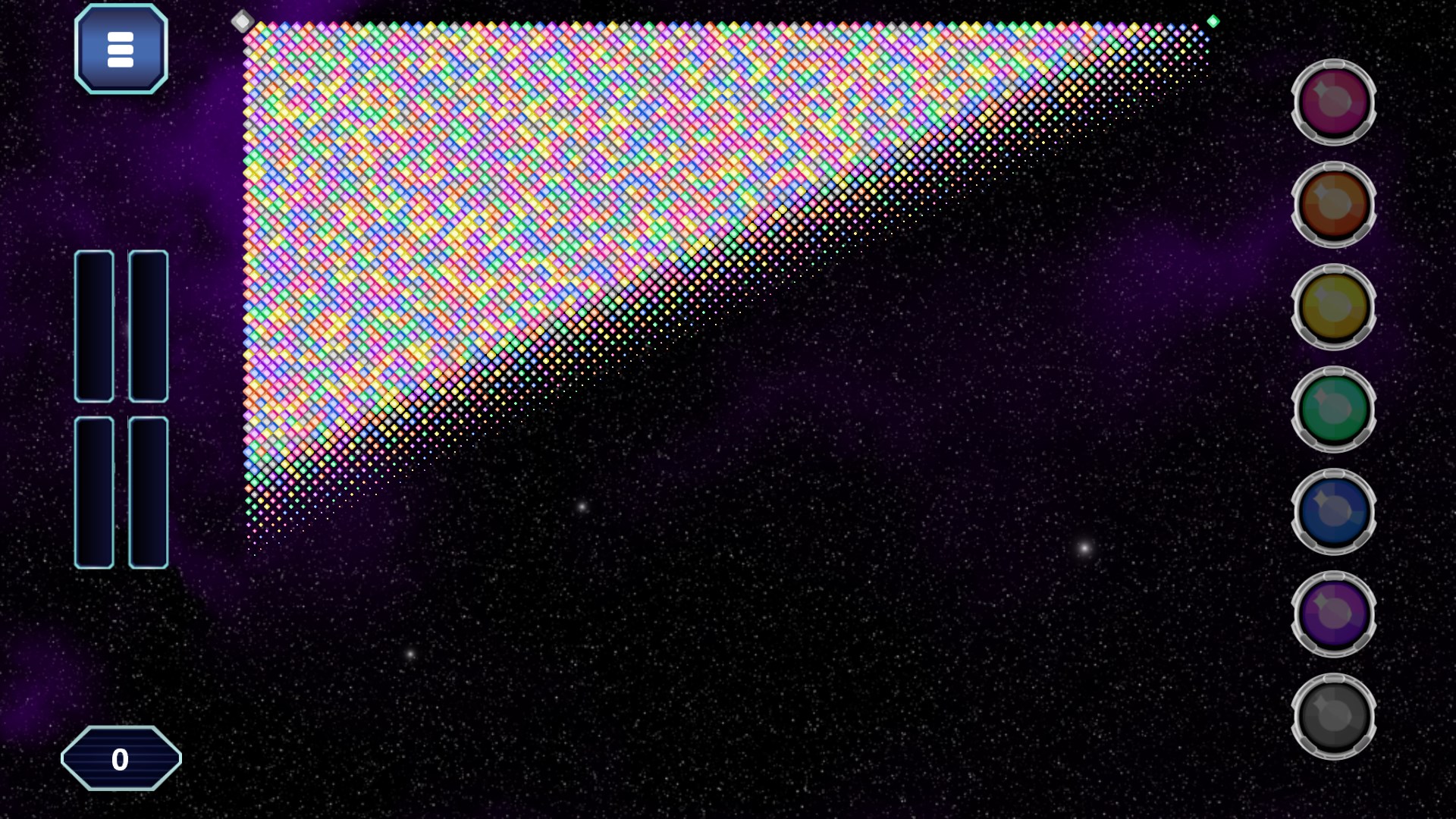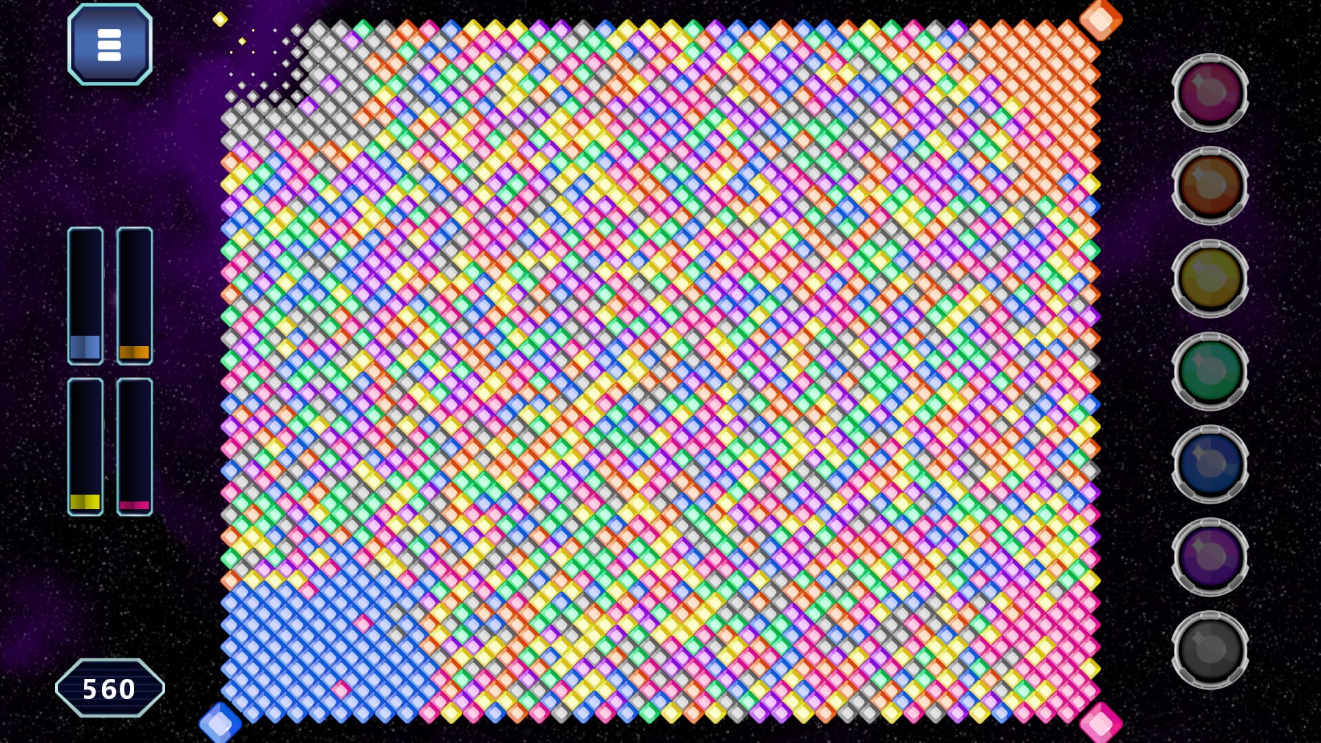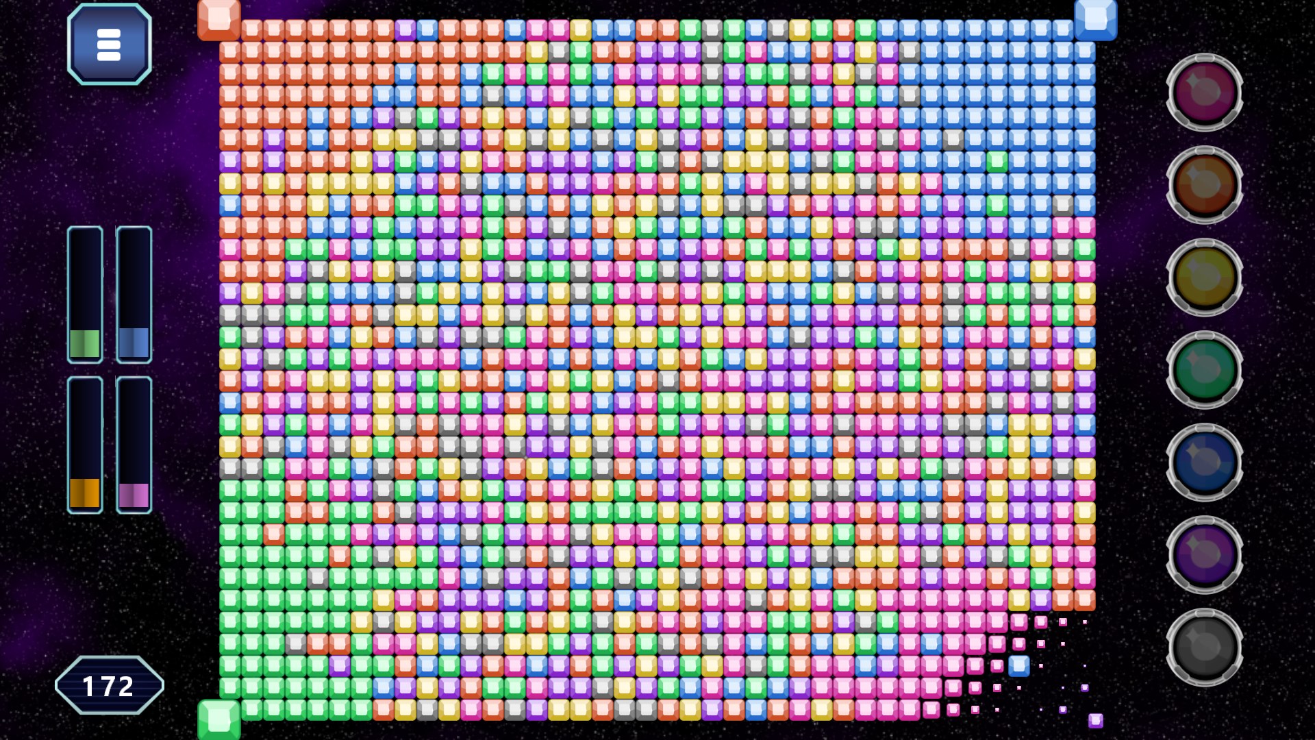You start in the bottom-left corner. The buttons on the side let you change the color of your edge and all adjastent gems of the same color. With each coloring you win more gems for your side, until one player dominated the board by reaching a simple majority.