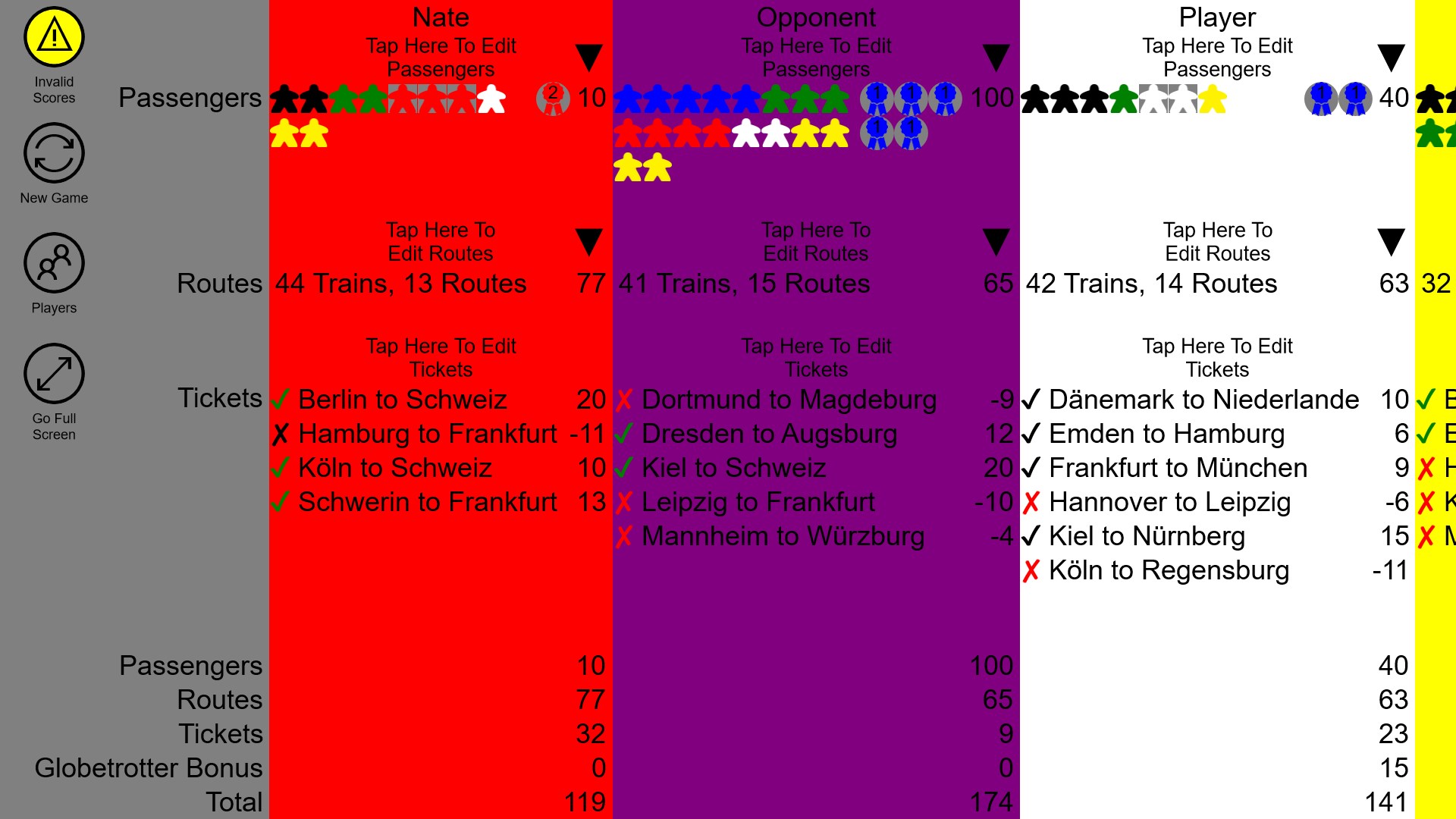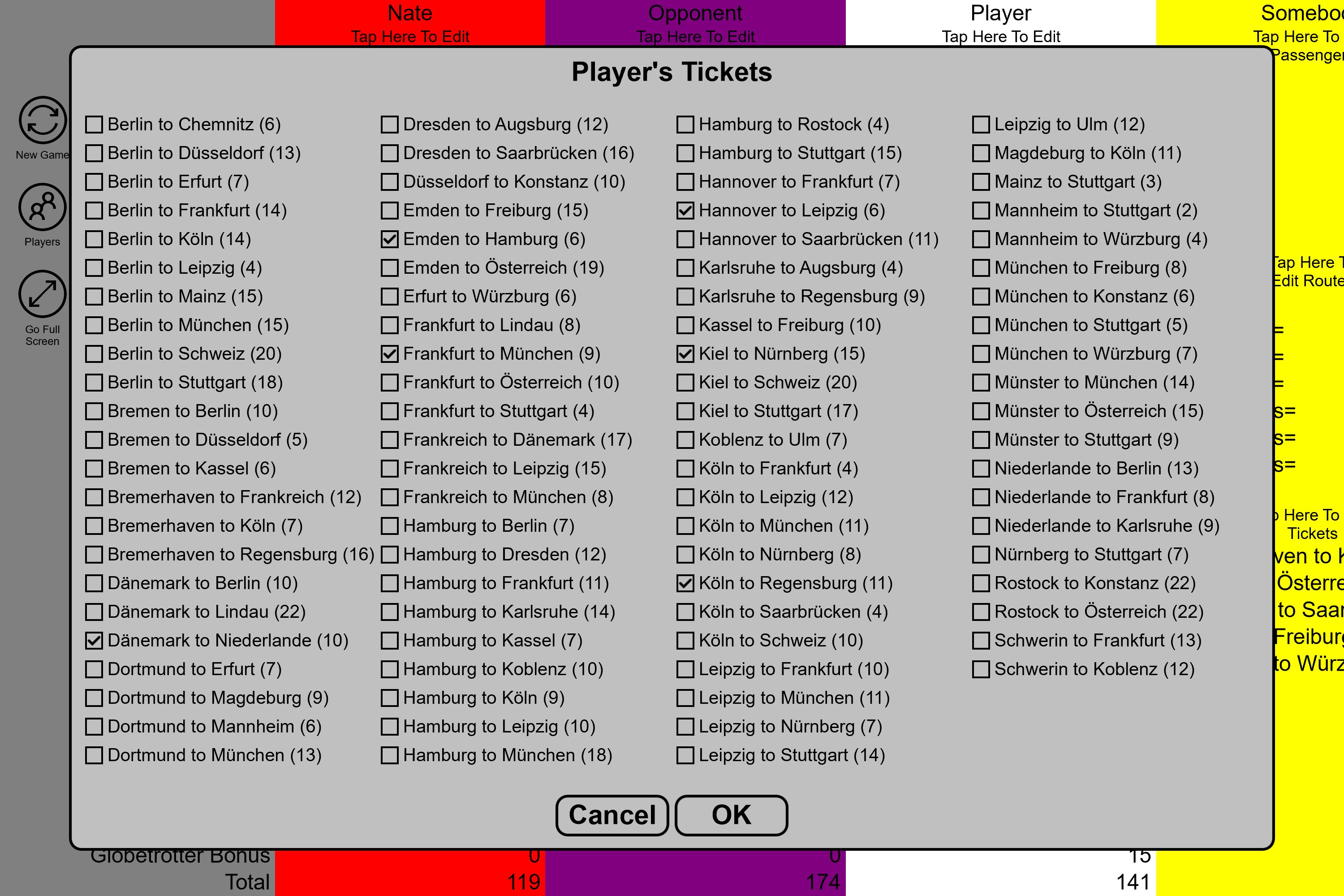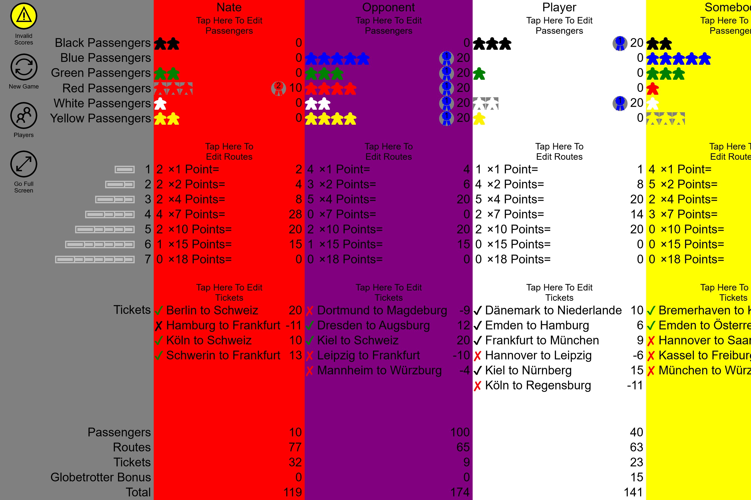 This is a scorekeeping app for the boardgame Ticket To Ride: Germany. Features include score calculation & validation. Users can specify the number of passengers collected, which tickets have been chosen, and what routes have been claimed. Routes claimed are selected using a visual map which displays the routes claimed by all players. All scores are dynamically updated. Users with smaller screen sizes may not be able to see details for all scoring components at the same, but will have the option of expanding or collapsing each section while editing score input.