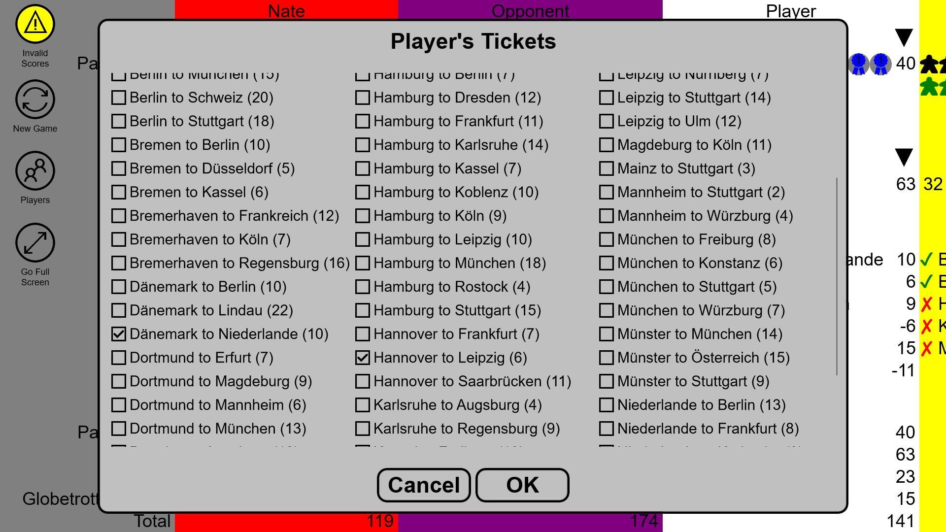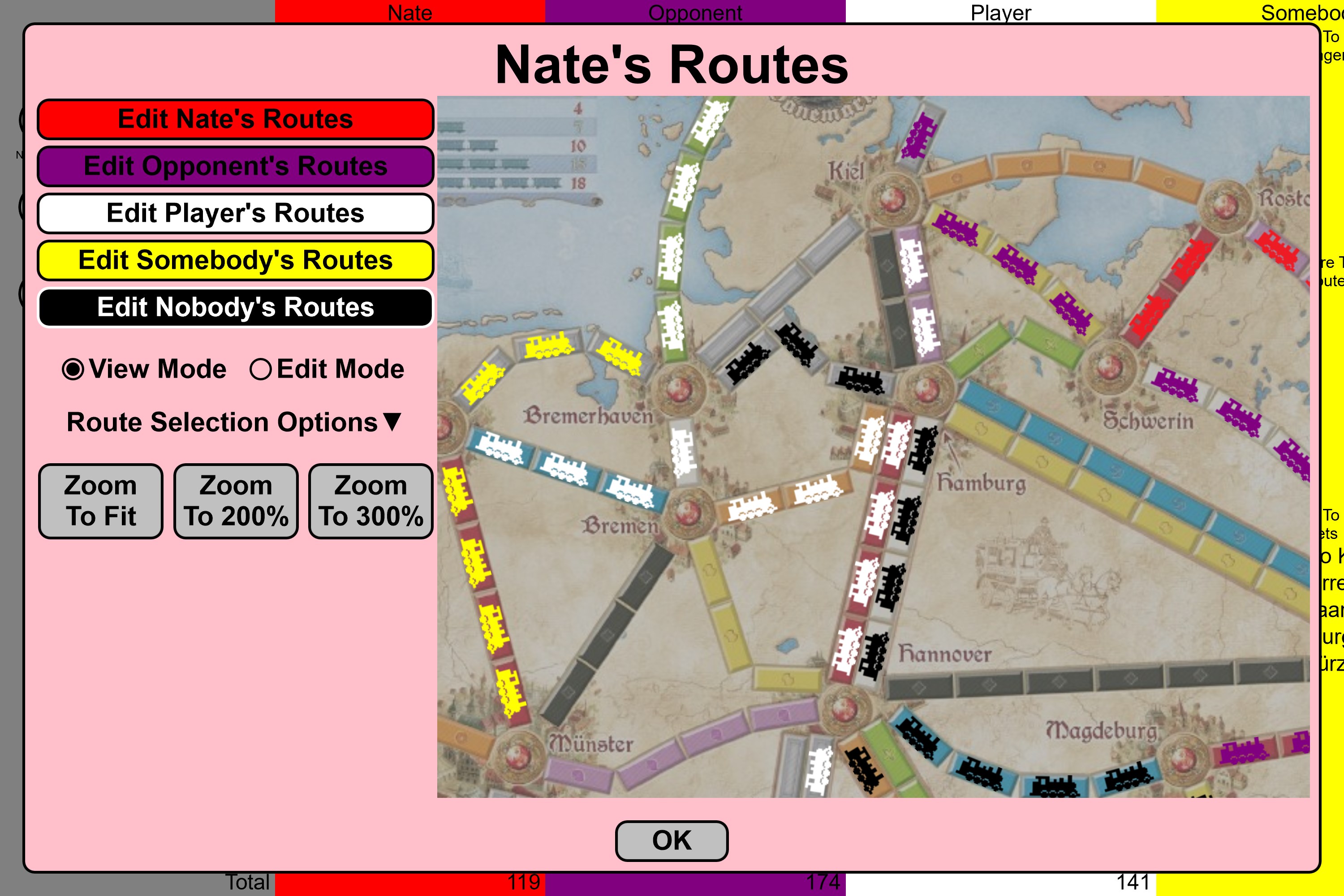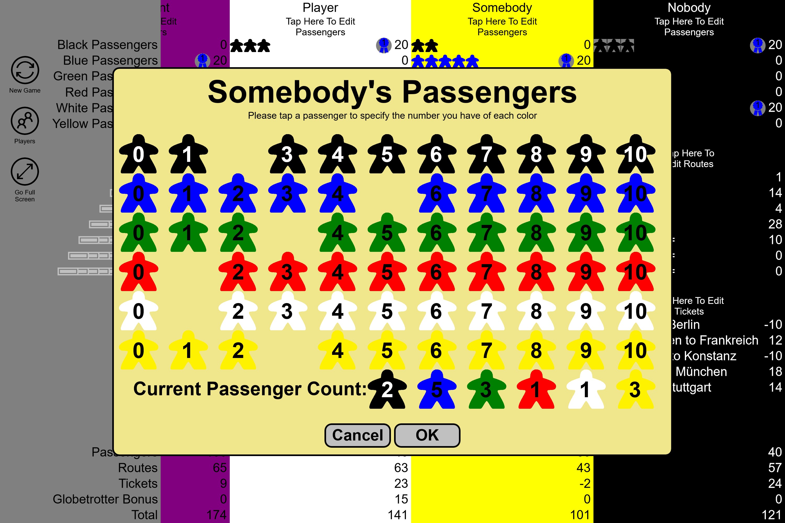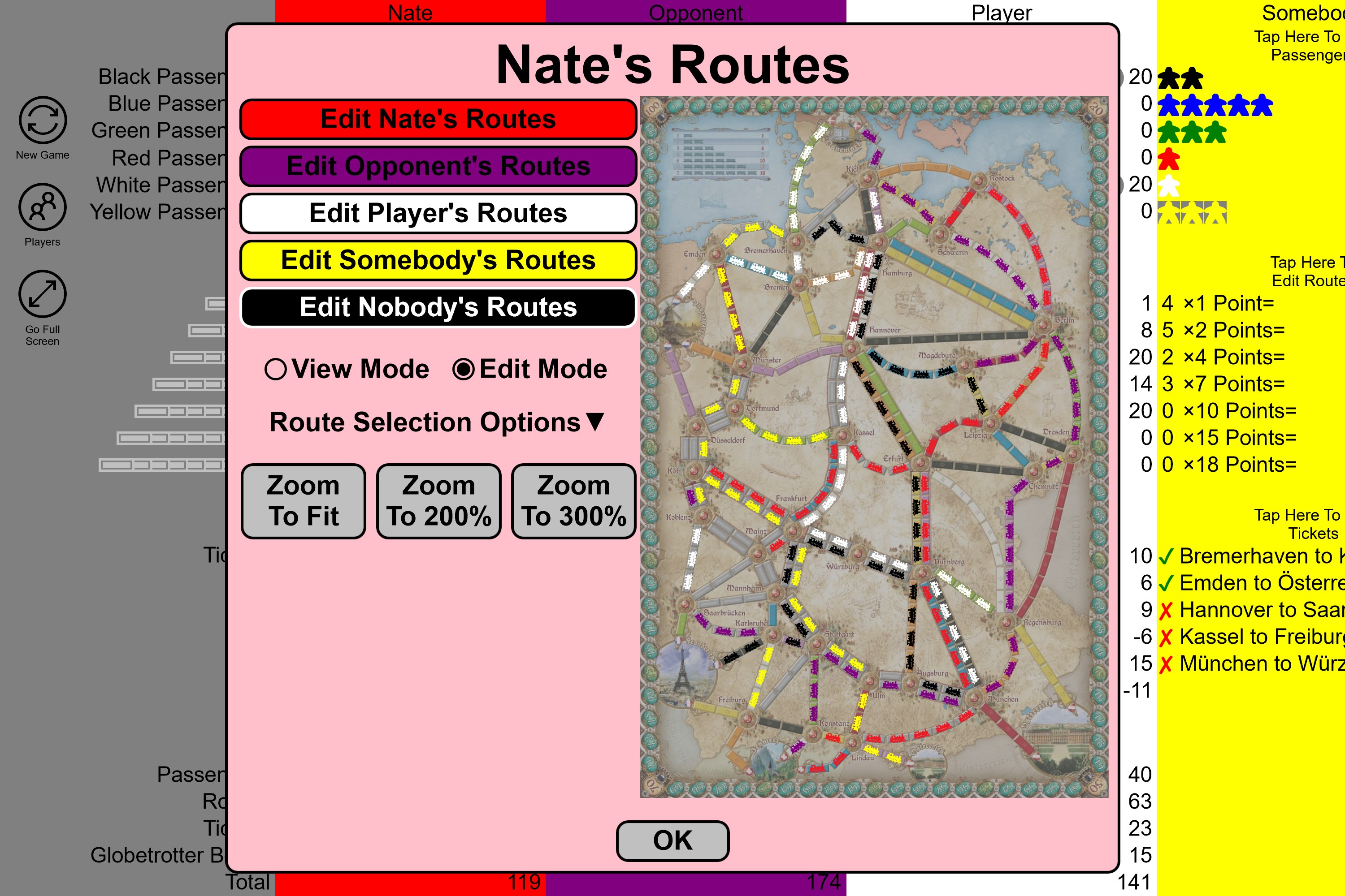 This is a scorekeeping app for the boardgame Ticket To Ride: Germany. Features include score calculation & validation. Users can specify the number of passengers collected, which tickets have been chosen, and what routes have been claimed. Routes claimed are selected using a visual map which displays the routes claimed by all players. All scores are dynamically updated. Users with smaller screen sizes may not be able to see details for all scoring components at the same, but will have the option of expanding or collapsing each section while editing score input.