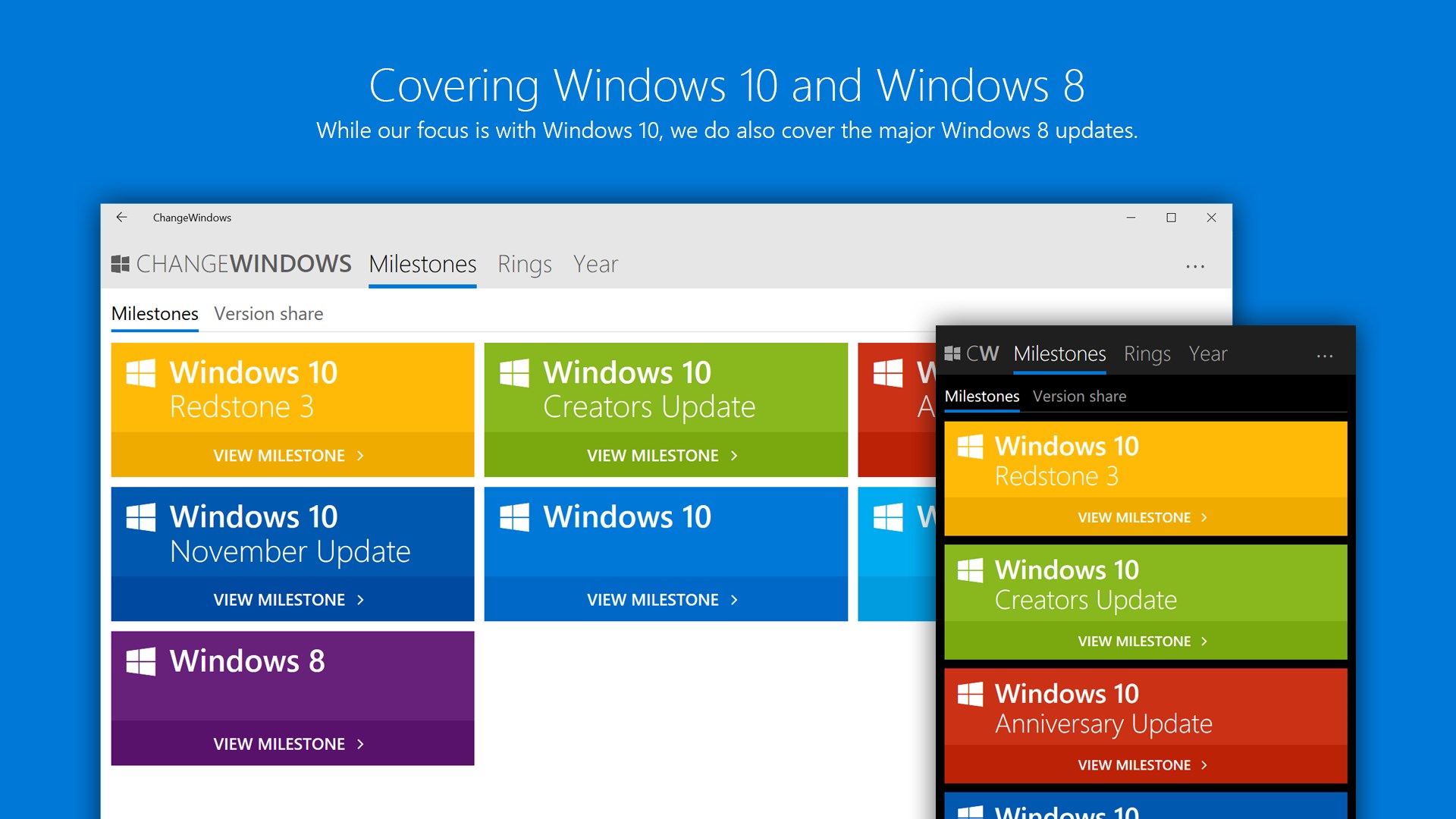 ChangeWindows let you easily check which version of Windows is available on each platform (PC, Mobile, Xbox, Server, Mixed Reality, IoT and Team) and provides you with detailed changelogs and more, all gathered in one nice web app.